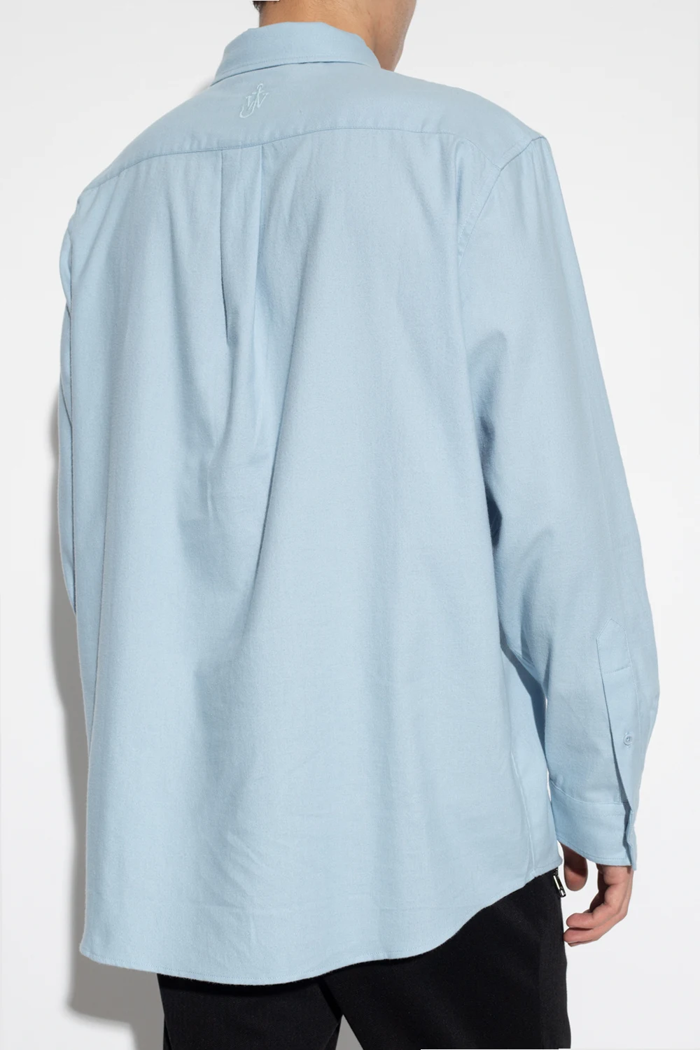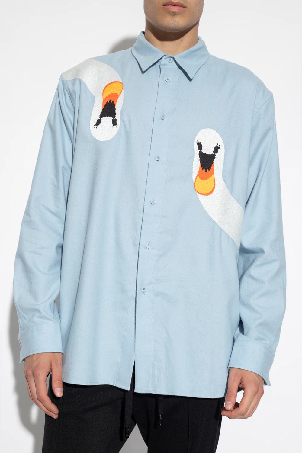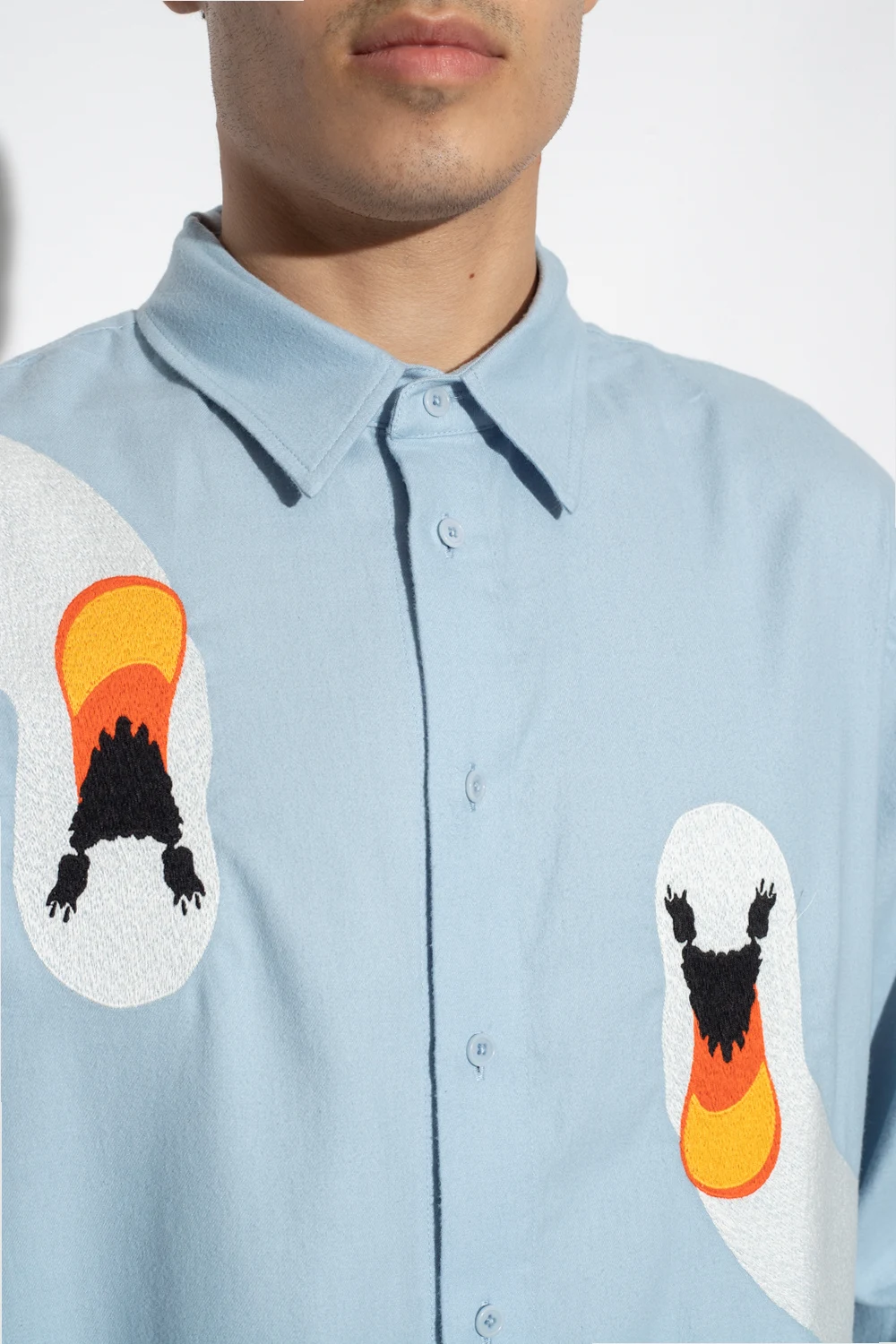 Niebieska koszula ‘Swan’ JW Anderson. Wykonana z bawełny. Zapinana na guziki. Ozdobiona wyszytym wzorem z motywem zwierzęcym. Z tyłu logo. Długie rękawy wykończone mankietami.