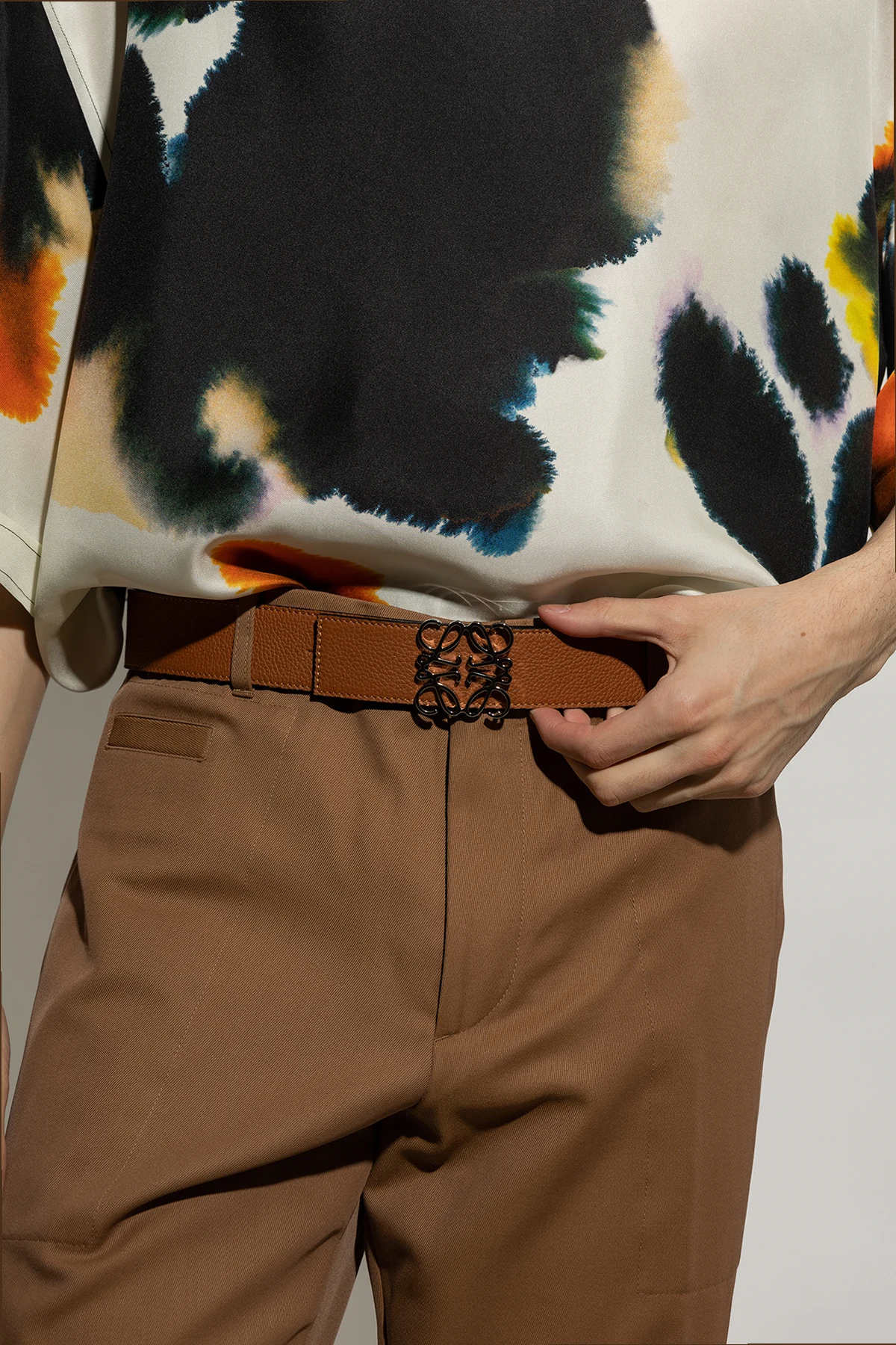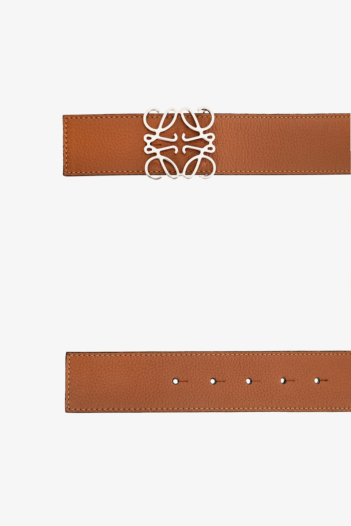 Brązowo-czarny, dwustronny pasek Loewe. Wykonany ze skóry cielęcej. Ozdobiony wzorem z logo ‘Anagram’. Wykończony klamrą w kolorze srebrnym.