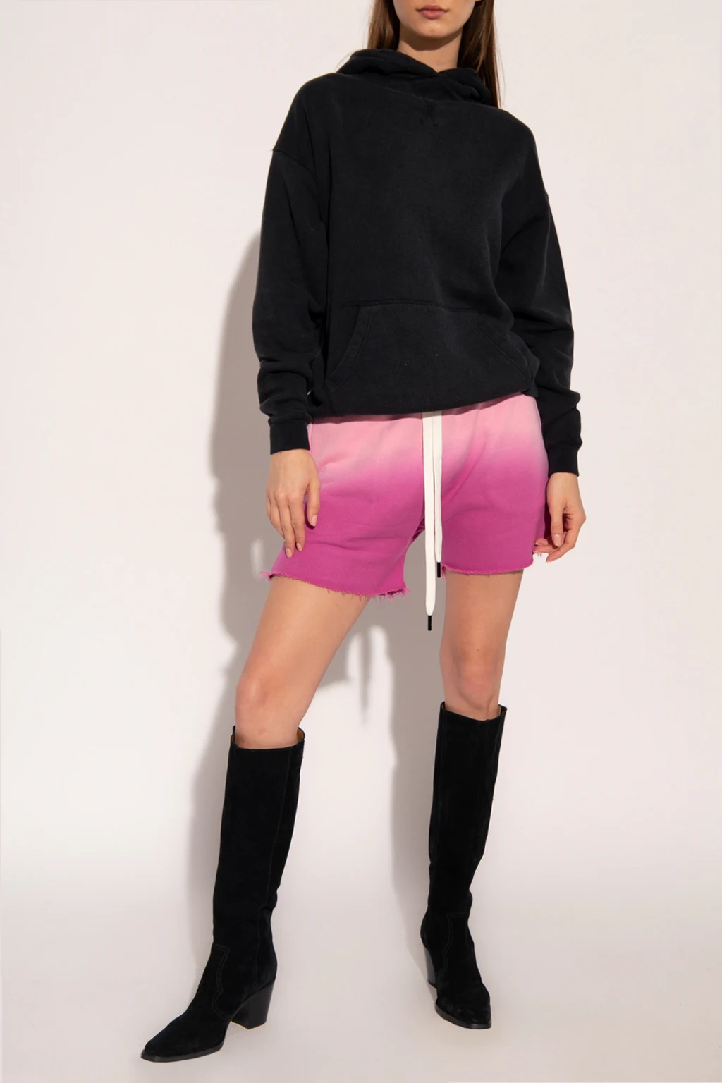 Różowe szorty R13. Wykonane z bawełny. W pasie wszyta guma ściągana trokami. Ozdobione motywem gradientowym oraz efektem znoszenia. Trzy wsuwane kieszenie. Surowe wykończenie.