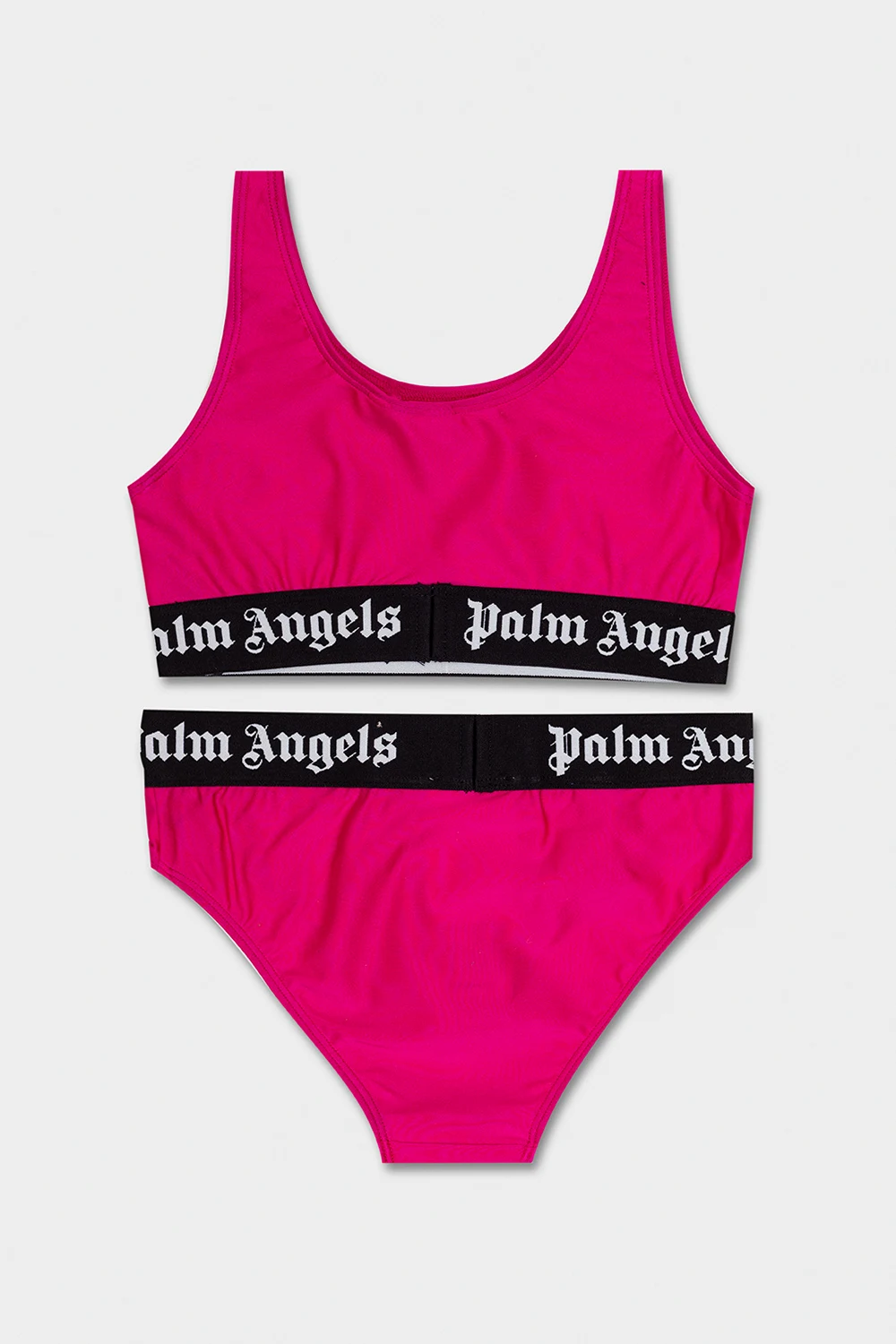 Różowy, dwuczęściowy kostium kąpielowy Palm Angels Kids. Ozdobiony czarnymi, elastycznymi paskami z wyszytym logo w kolorze białym.