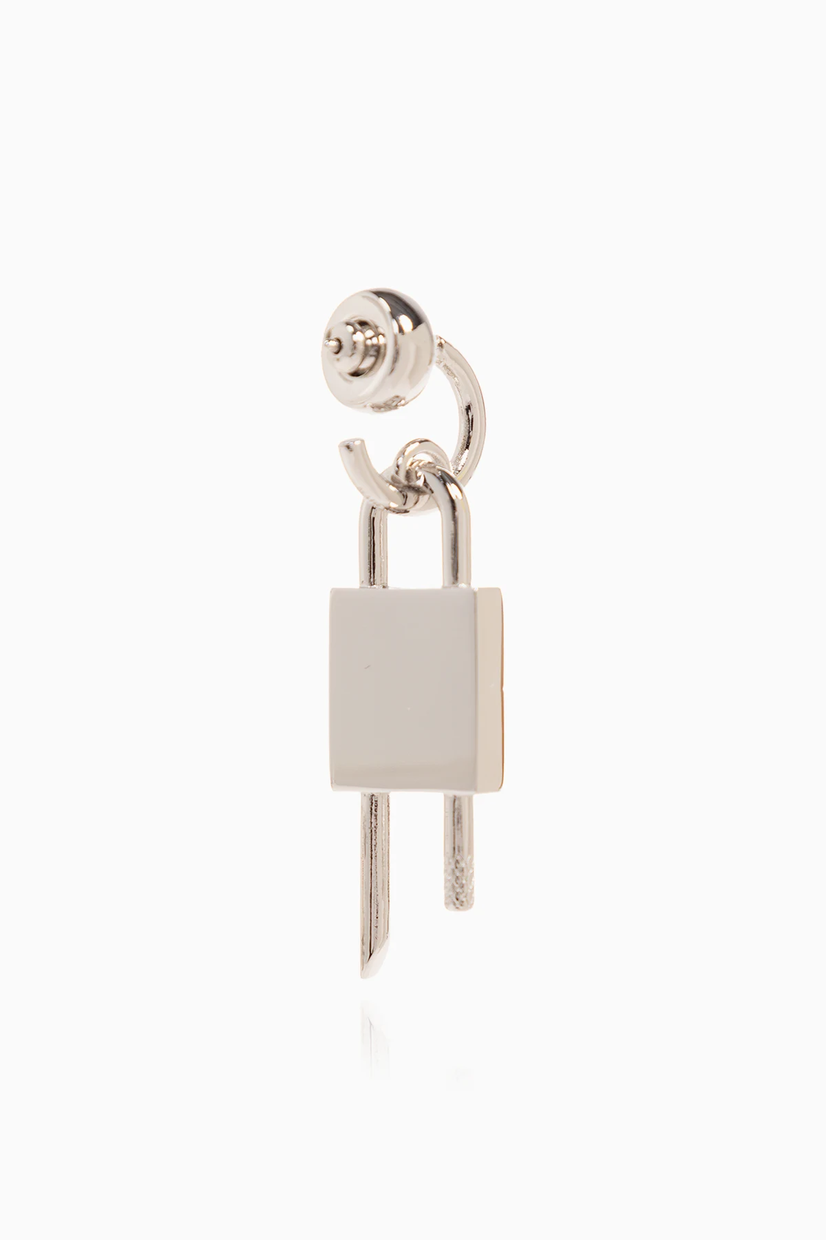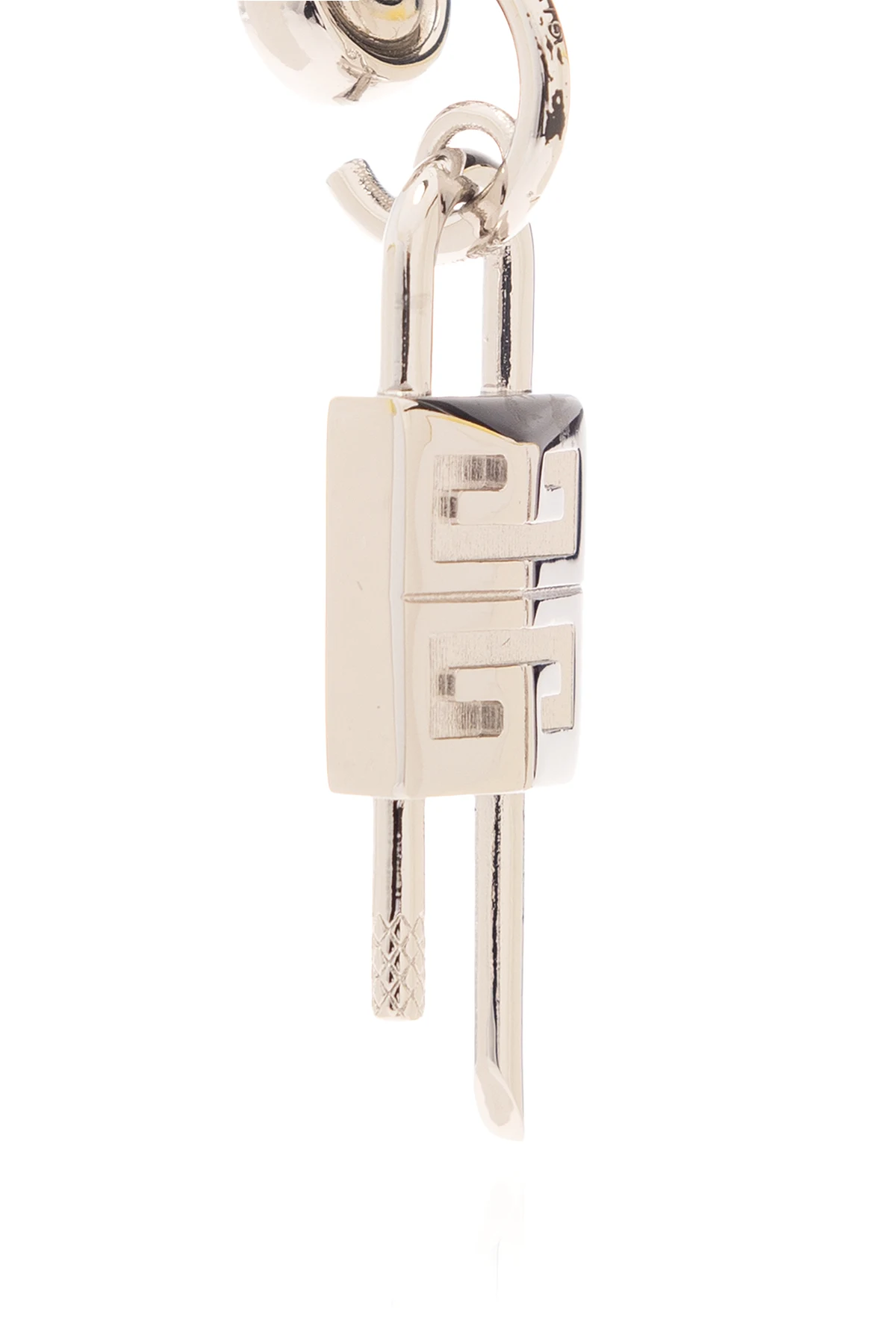 Pojedynczy kolczyk w kolorze srebrnym Givenchy. Wykonany z mosiądzu. Ozdobiony zawieszką w kształcie charakterystycznej kłódki ‘4G’. Zapinany na sztyft.