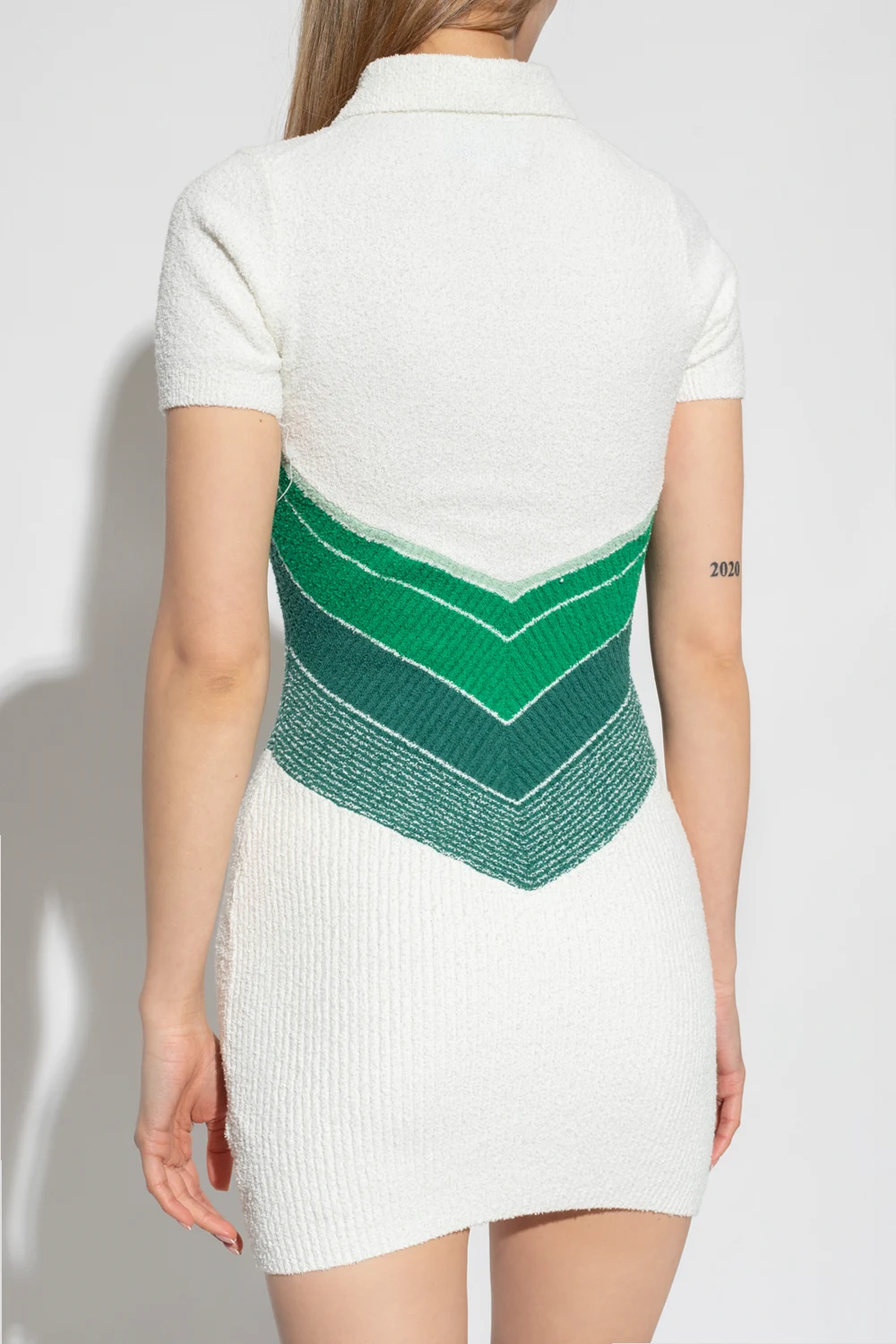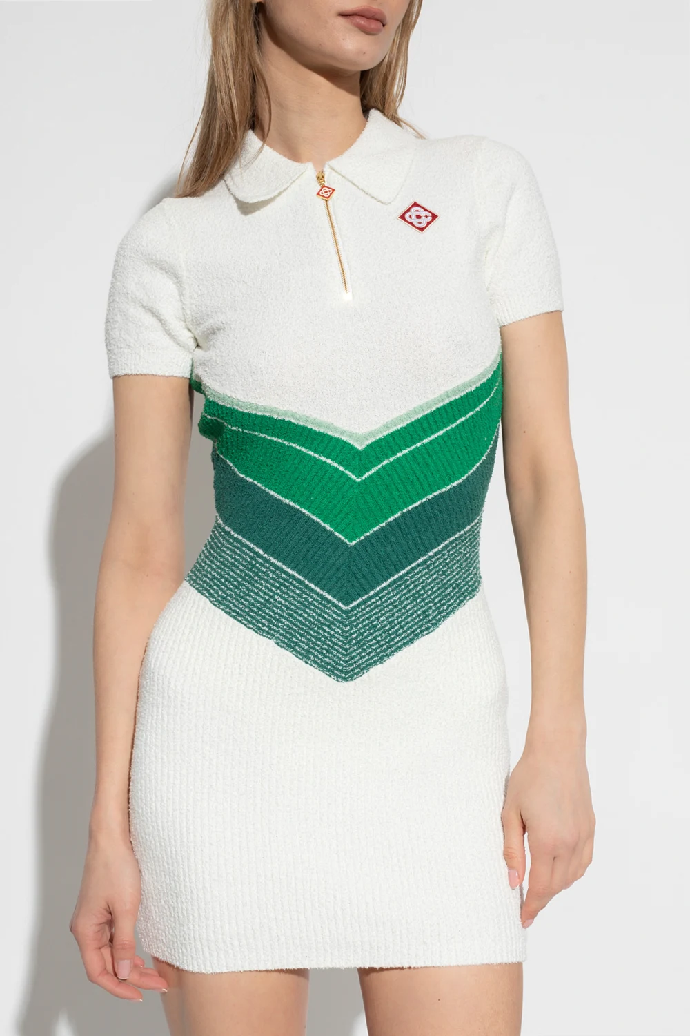 Biała, krótka sukienka Casablanca. Wykonana z bawełny typu ‘frotte’. Kołnierz zapinany na zamek ozdobiony zawieszką z logo. W talii ozdobny ściągacz w pasy w kolorze zielonym. Krótkie rękawy.