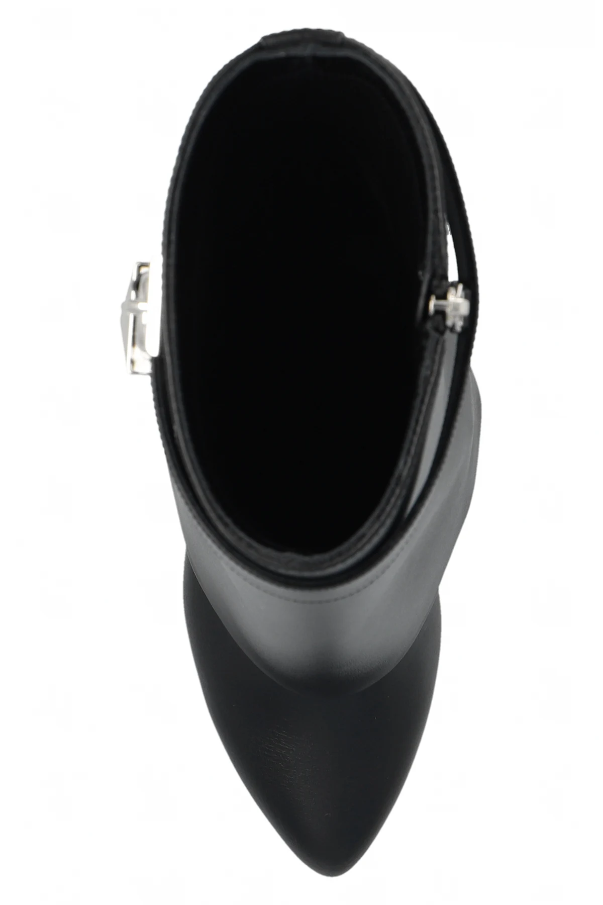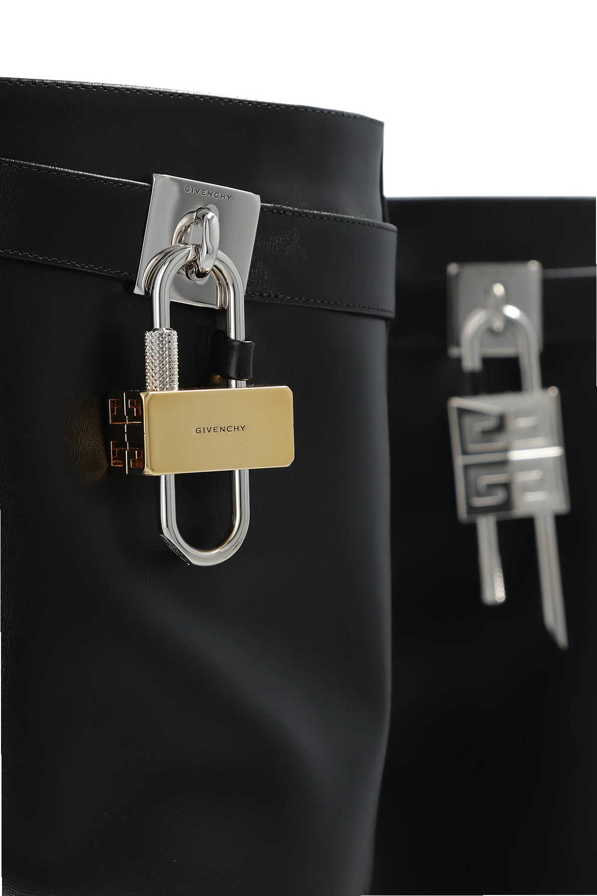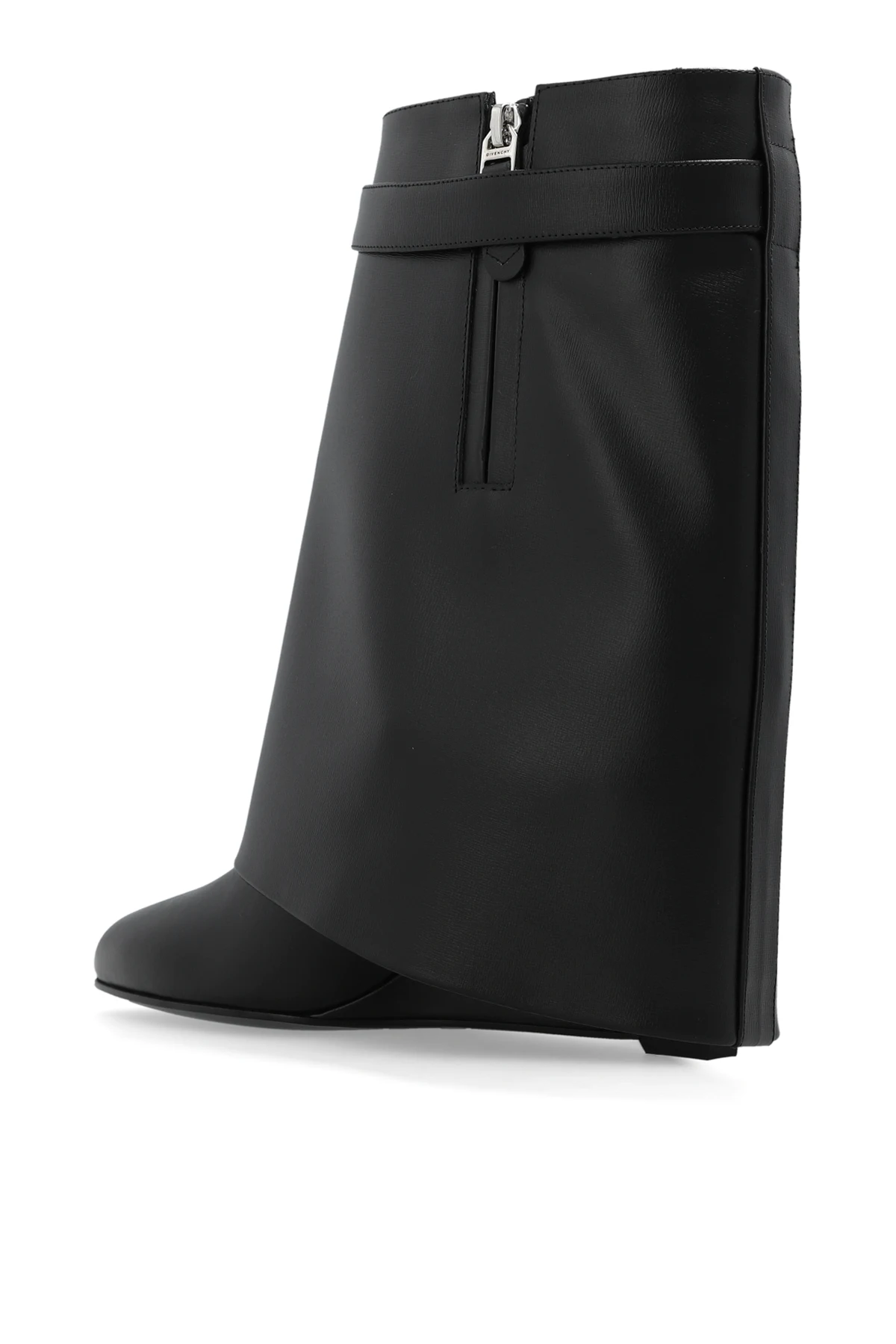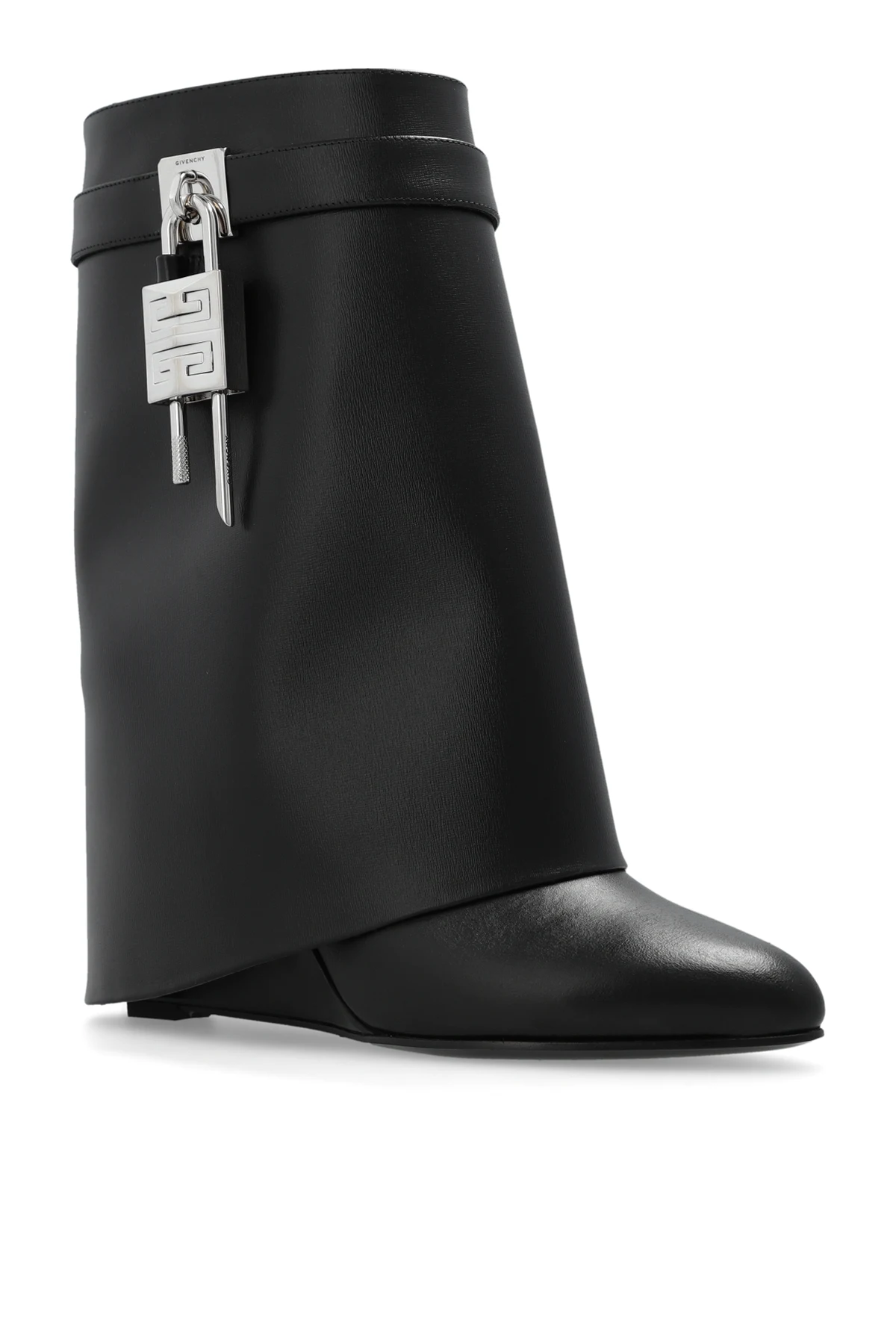 Czarne botki na koturnie, model ‘Shark Lock’ Givenchy. Wykonane z cielęcej skóry. Z boku zapinane na krótki zamek. Góra ozdobiona paskiem z metalowym zapięciem i charakterystyczną kłódką ‘4G’ w kolorze srebrnym. Migdałowy nosek. Czarna, skórzana podeszwa.