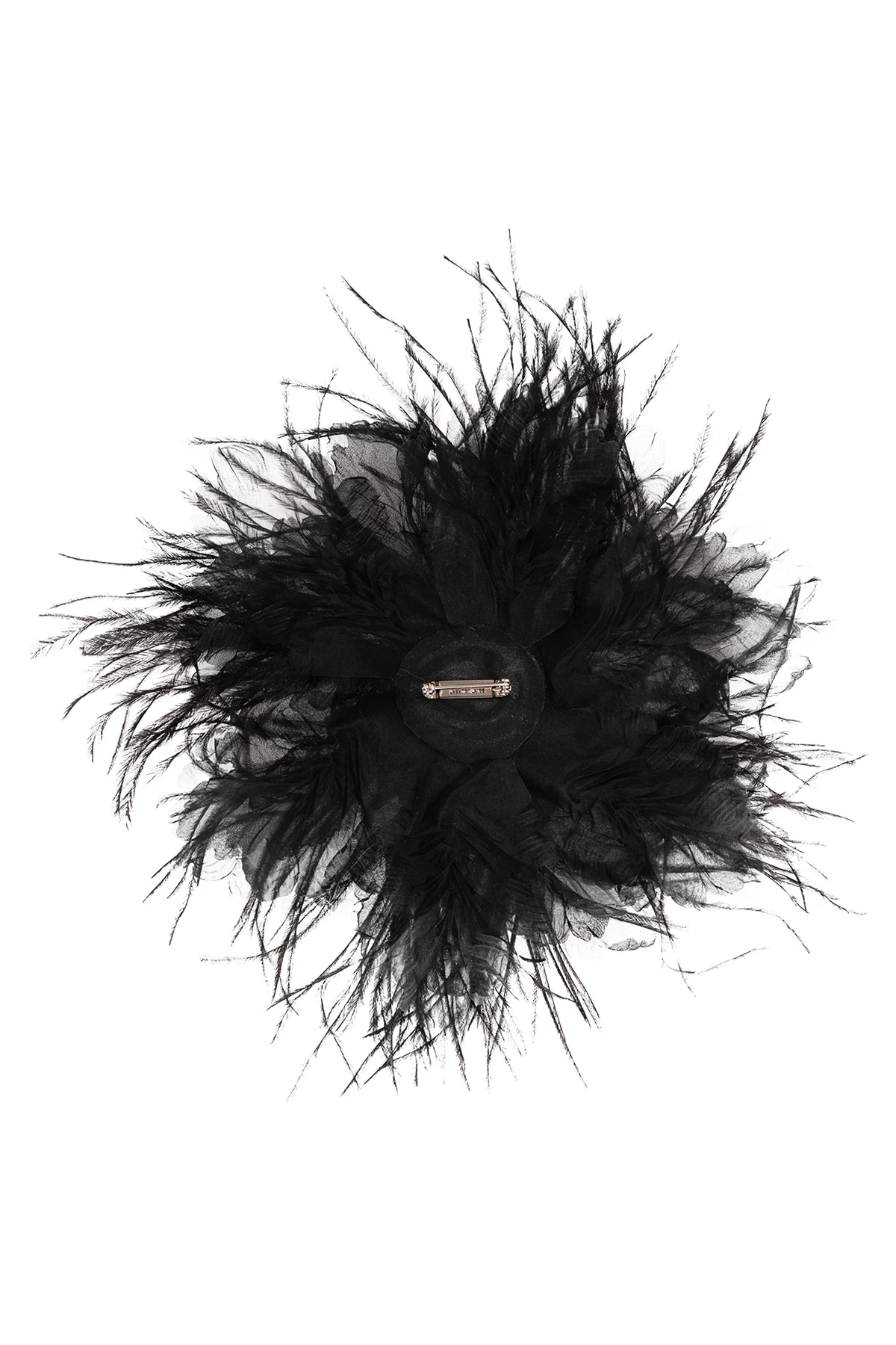 Czarna broszka Saint Laurent. Ozdobiona jedwabnym kwiatem, wykończonym strusimi piórami w kolorze czarnym.