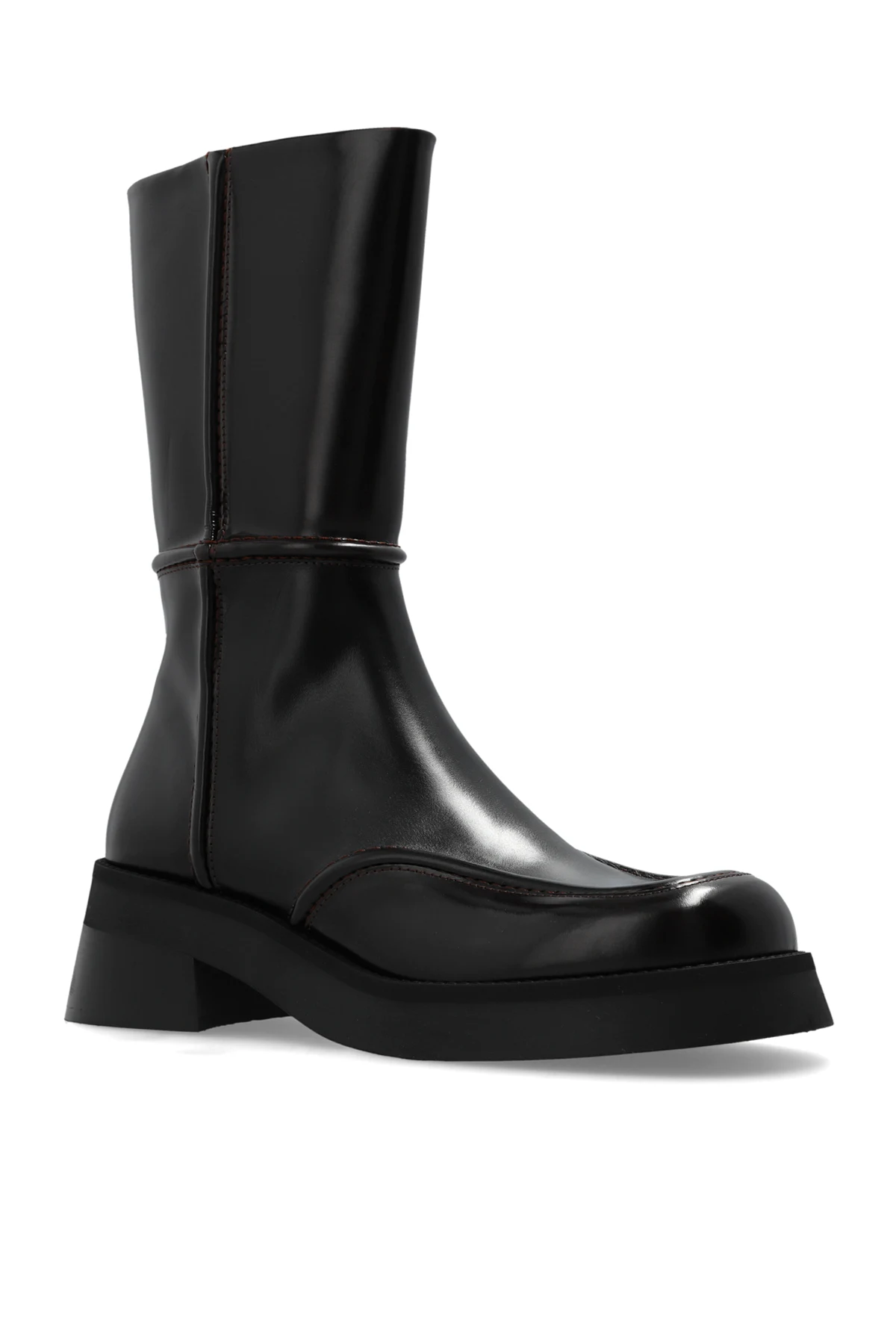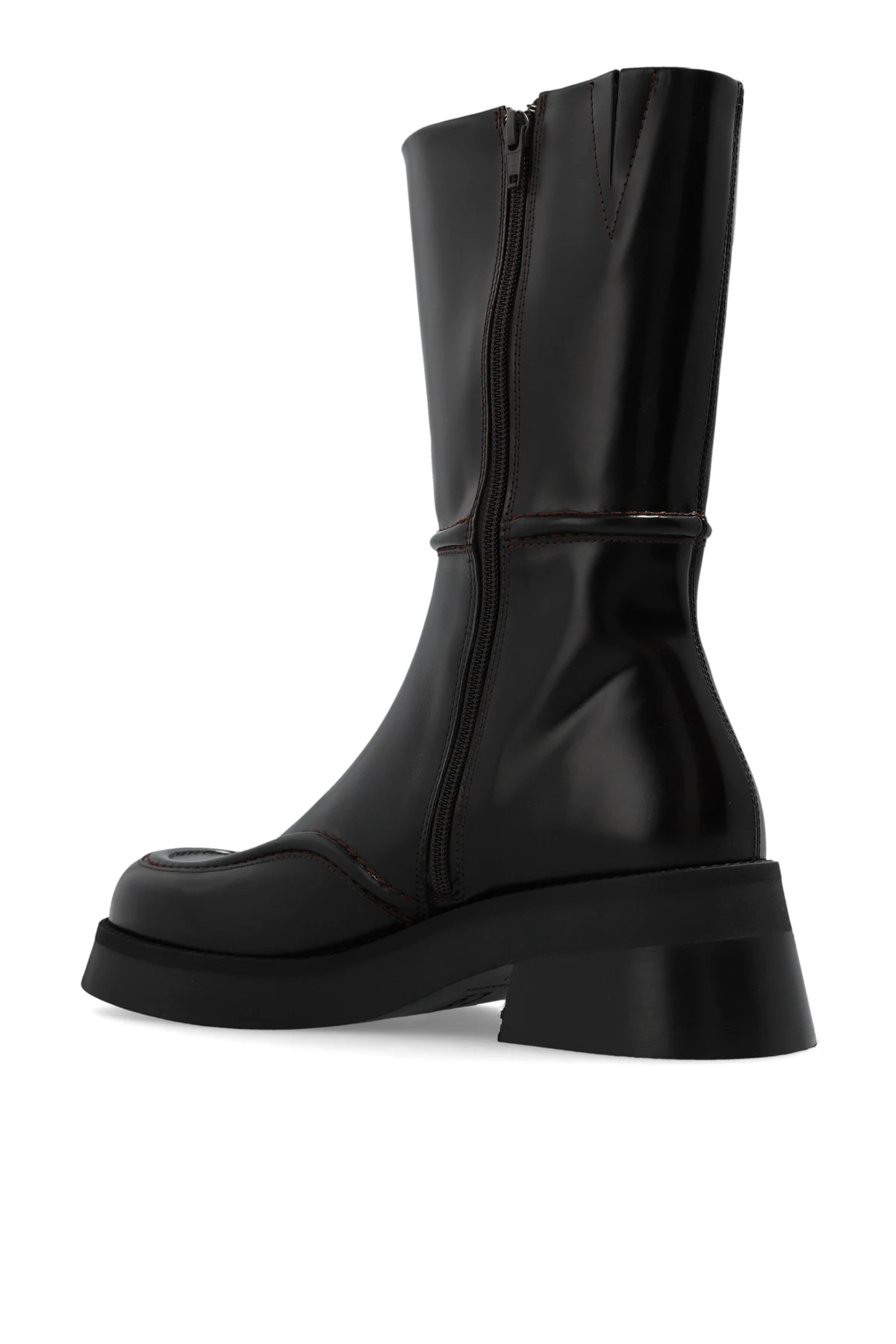 Wykonane z połyskującej, czarnej skóry, botki Inne cechują się prostym, klasycznym kształtem z zaokrąglonym noskiem, sięgającym do połowy łydki. Ich elegancki wygląd podkreślają widoczne przeszycia w kontrastującym brązowym kolorze, a praktyczny zamek błyskawiczny z boku ułatwia zakładanie i zdejmowanie obuwia.