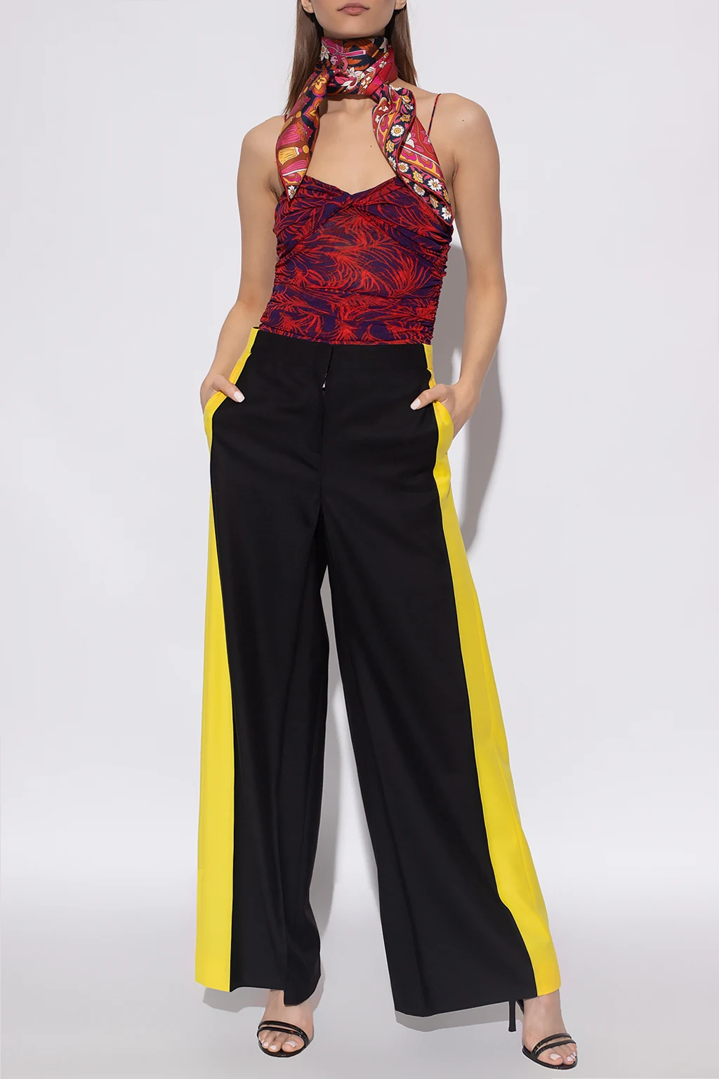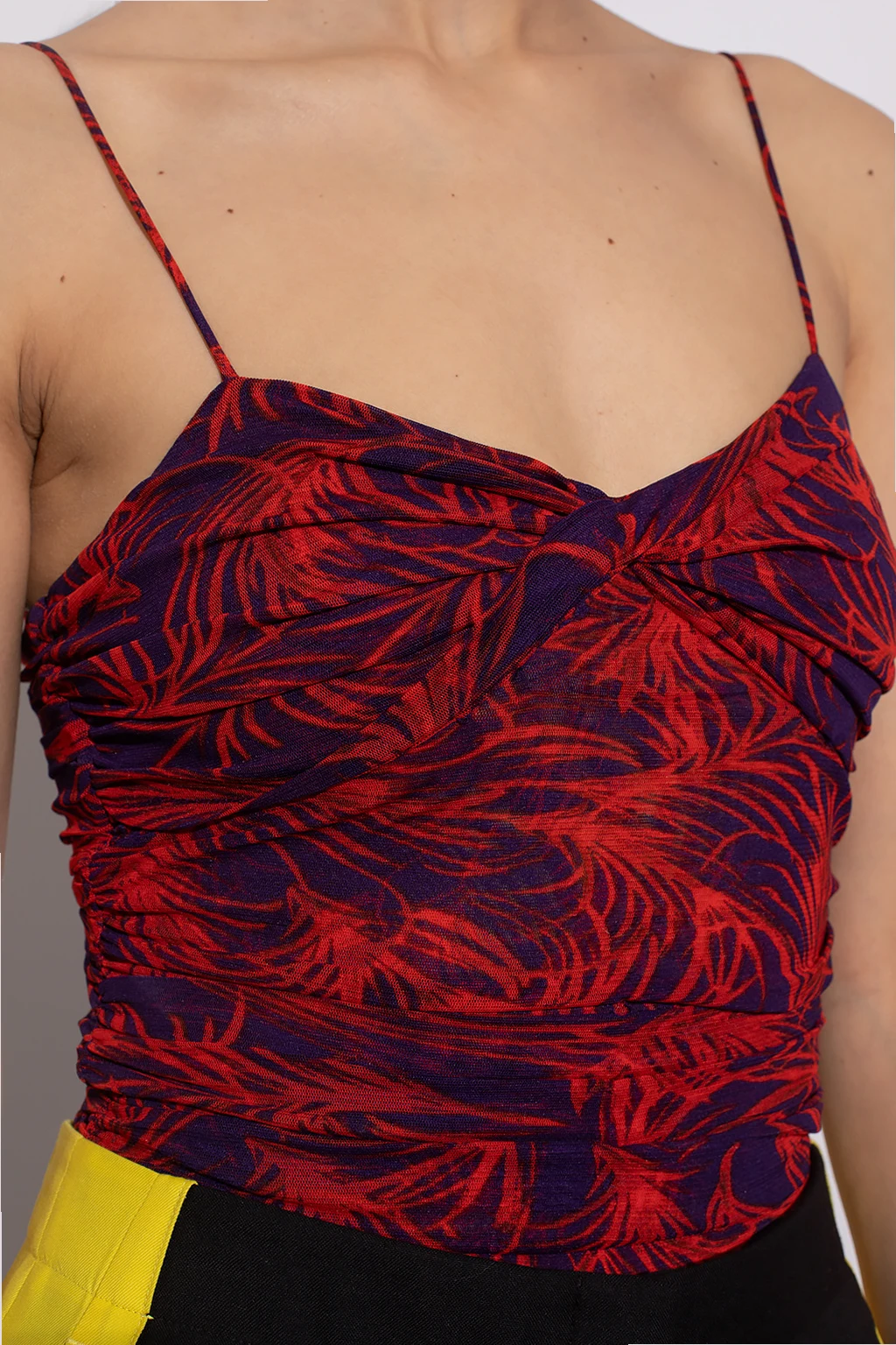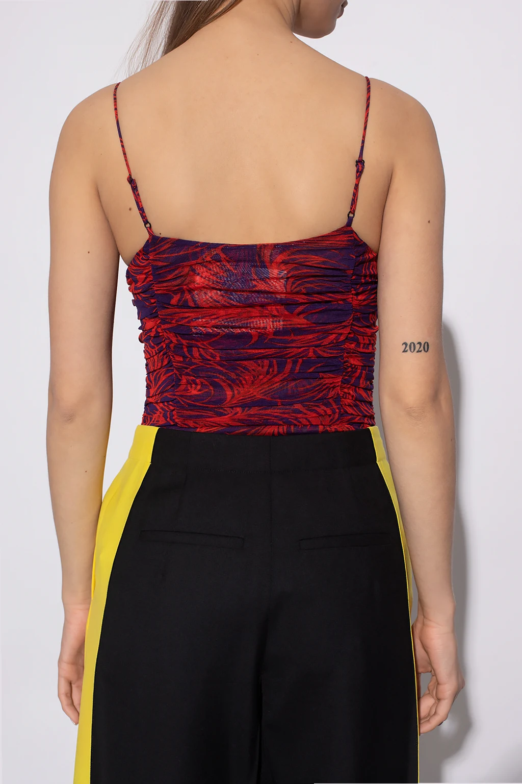 Czerwono-fioletowe body Diane Von Furstenberg. W kroku zapinane na zatrzaski. Ozdobione nadrukowanym wzorem i marszczeniem. Ramiączka z możliwością regulacji długości.