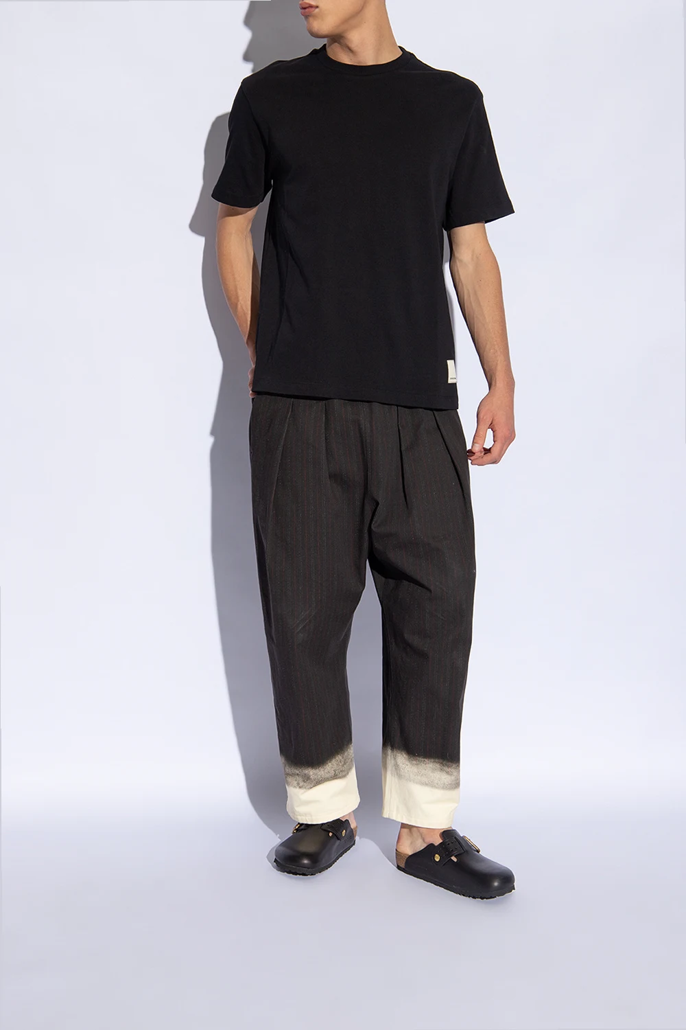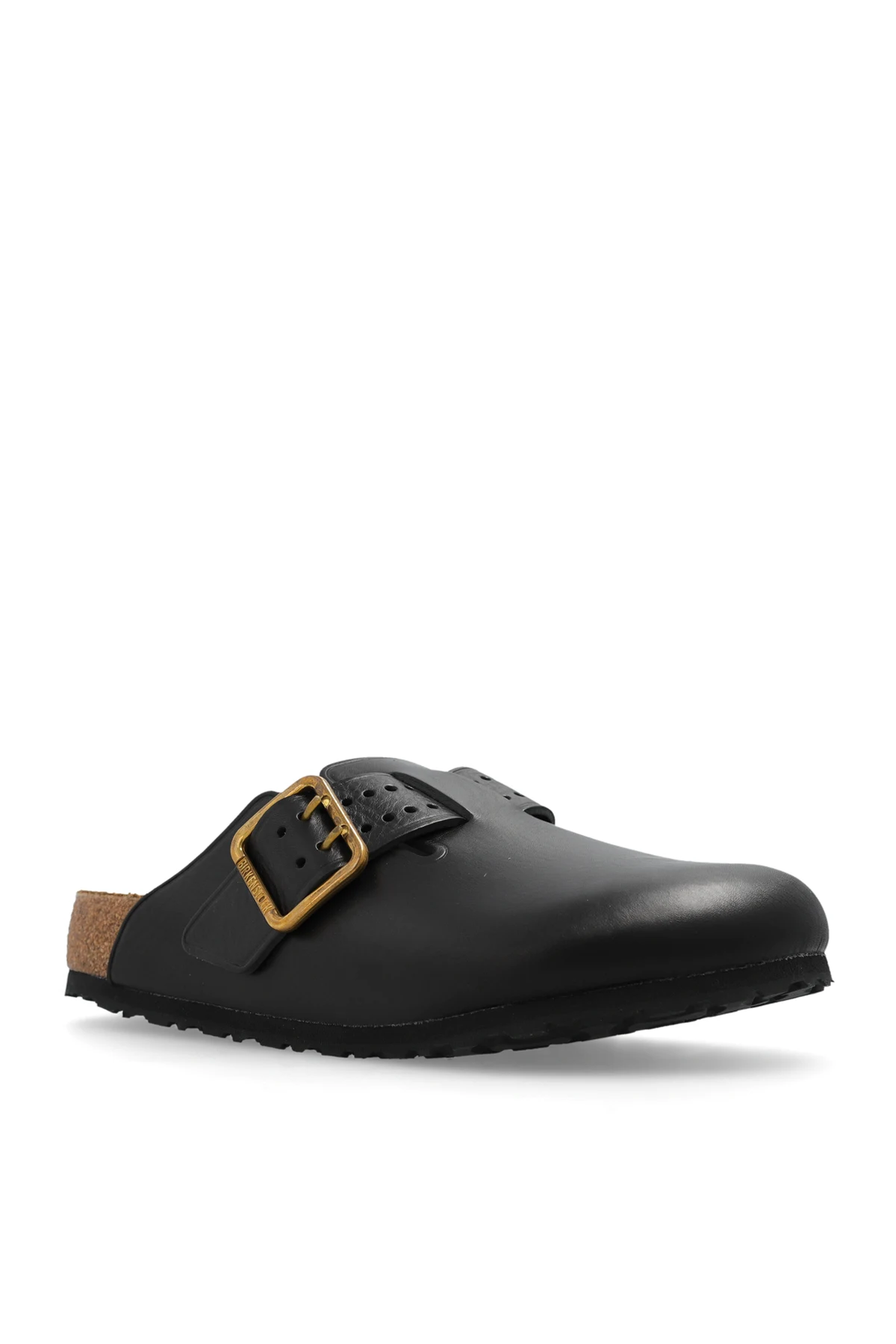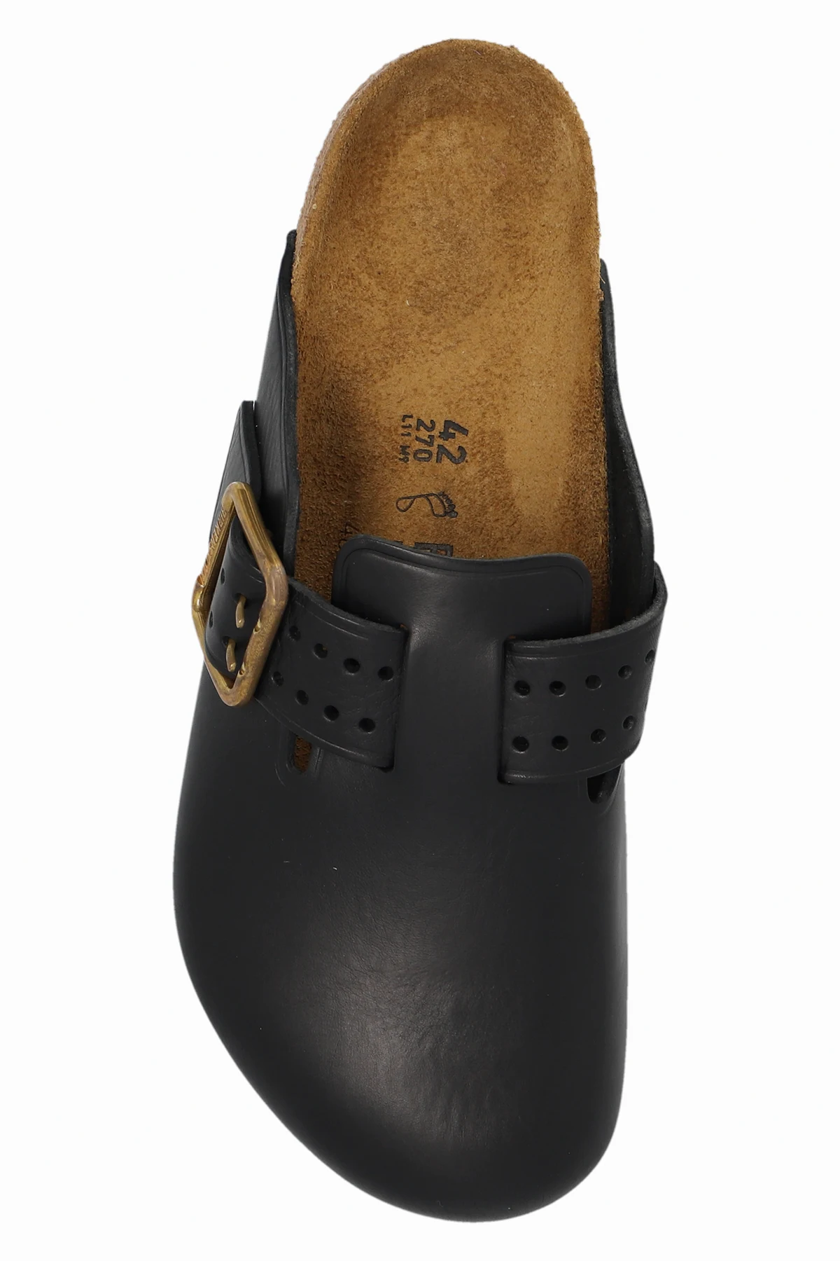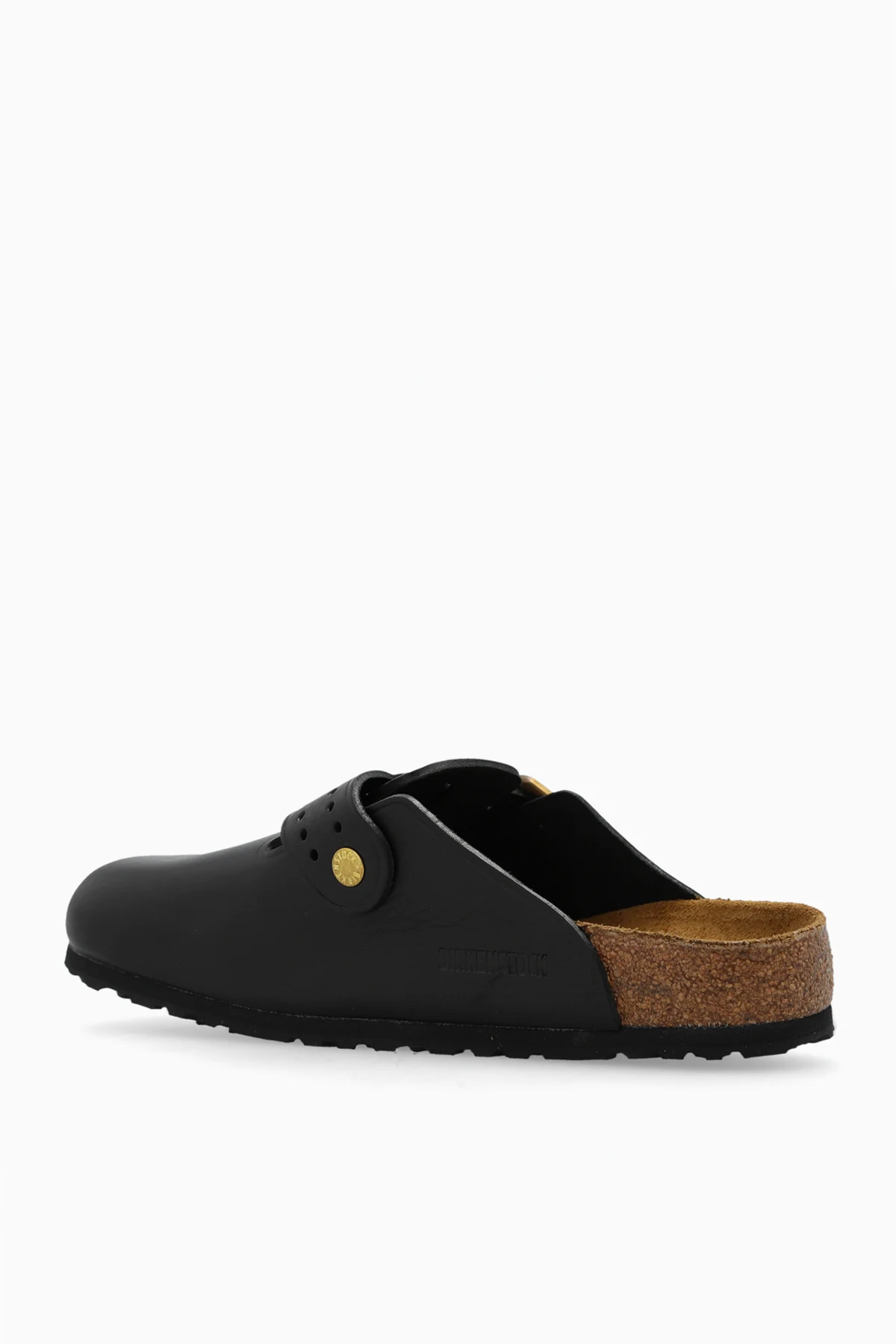 Czarne klapki, model ‘Boston Bold Gap’ Birkenstock. Wykonane ze skóry. Z przodu regulowany, perforowany pasek z klamrą. Z boku wytłoczone logo. Anatomicznie ukształtowana wkładka korkowo-lateksowa o standardowej szerokości. Czarna podeszwa zewnętrzna wykonana z pianki EVA.
