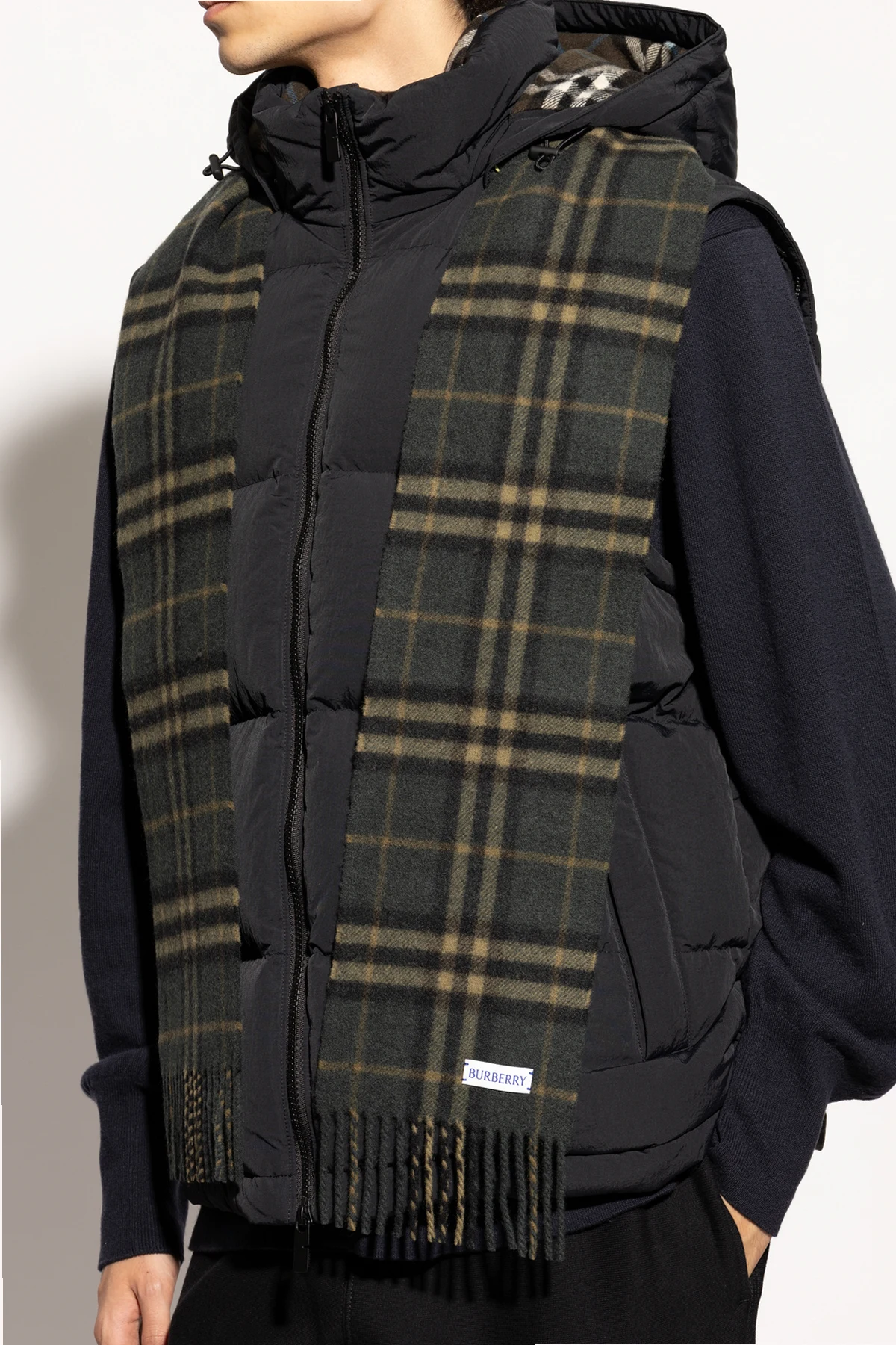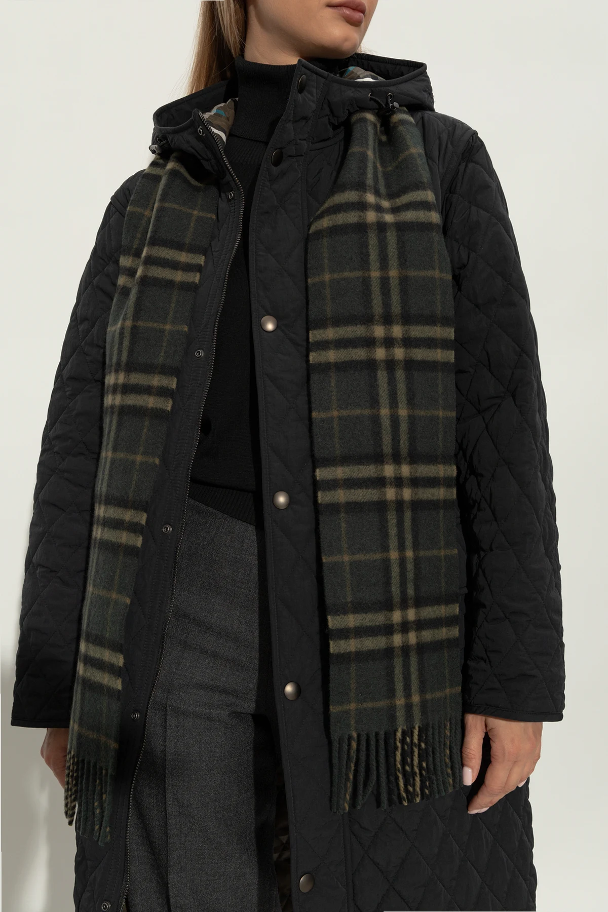 Eleganckie detale, takie jak frędzle i metka z logo Burberry.