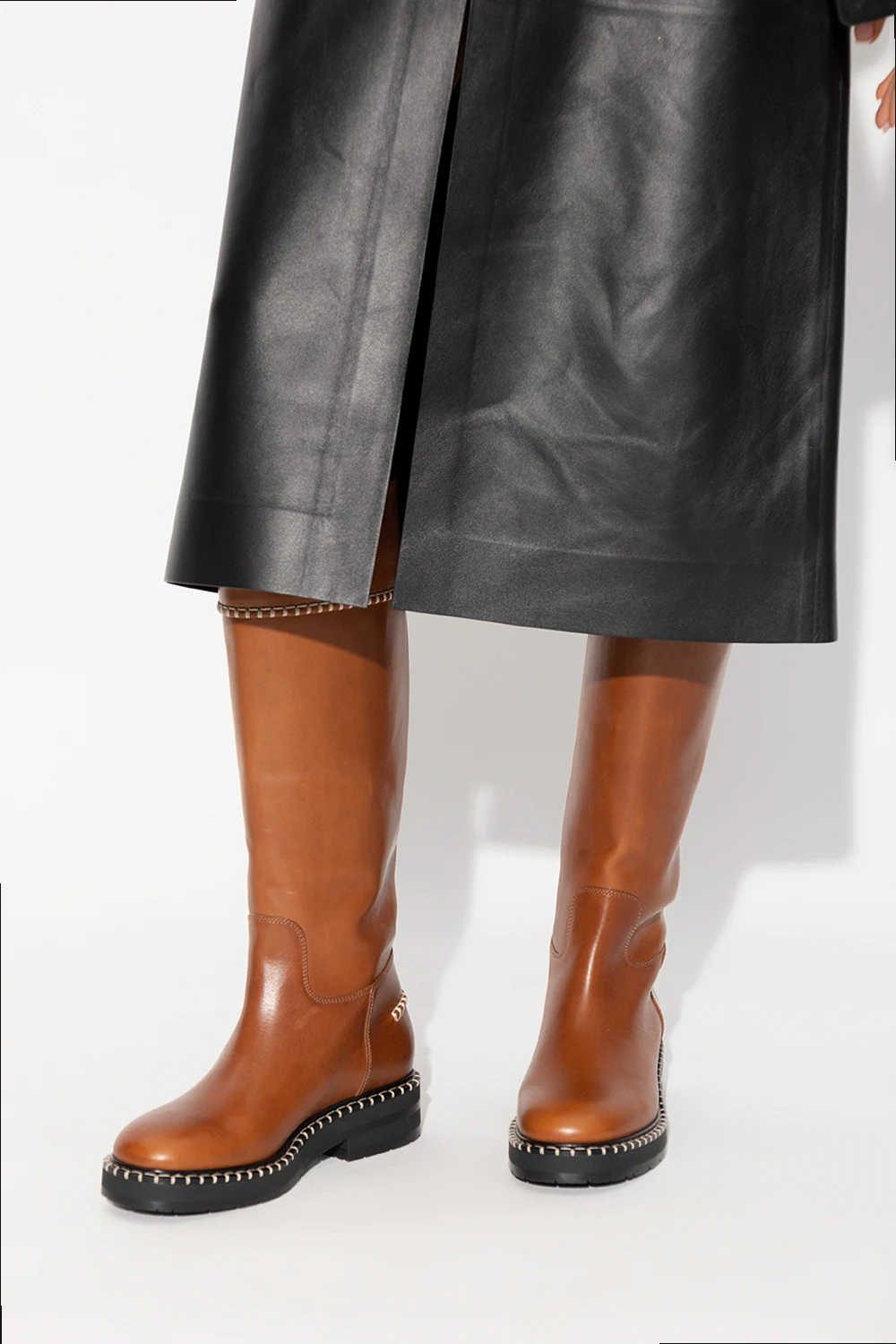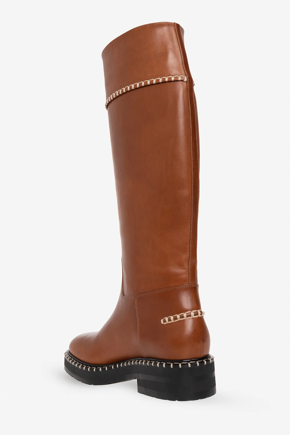 Brązowe, wsuwane kozaki, model ‘Noua’ Chloe. Wykonane ze skóry. Z boku wytłoczone logo. Dekoracyjne przeszycia w kolorze kremowym. Czarna, gumowa podeszwa.