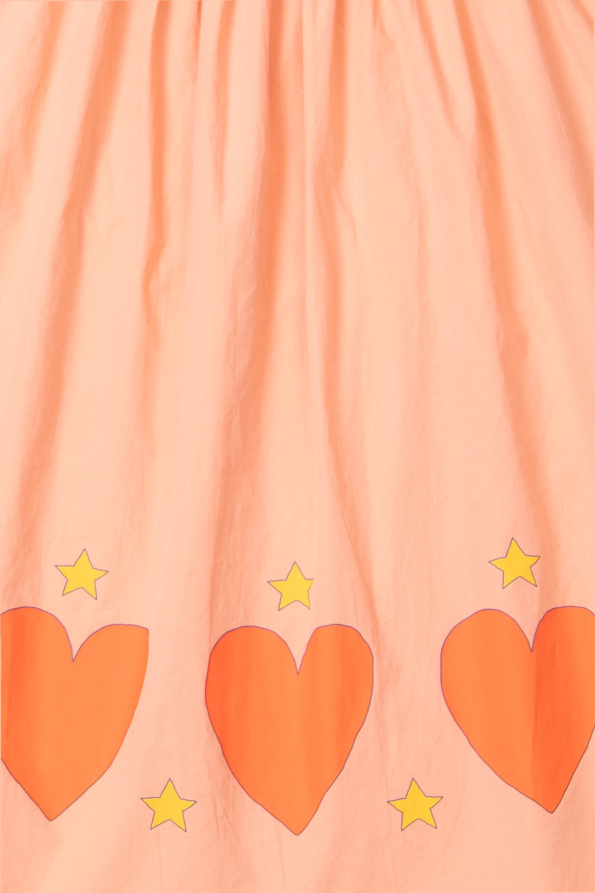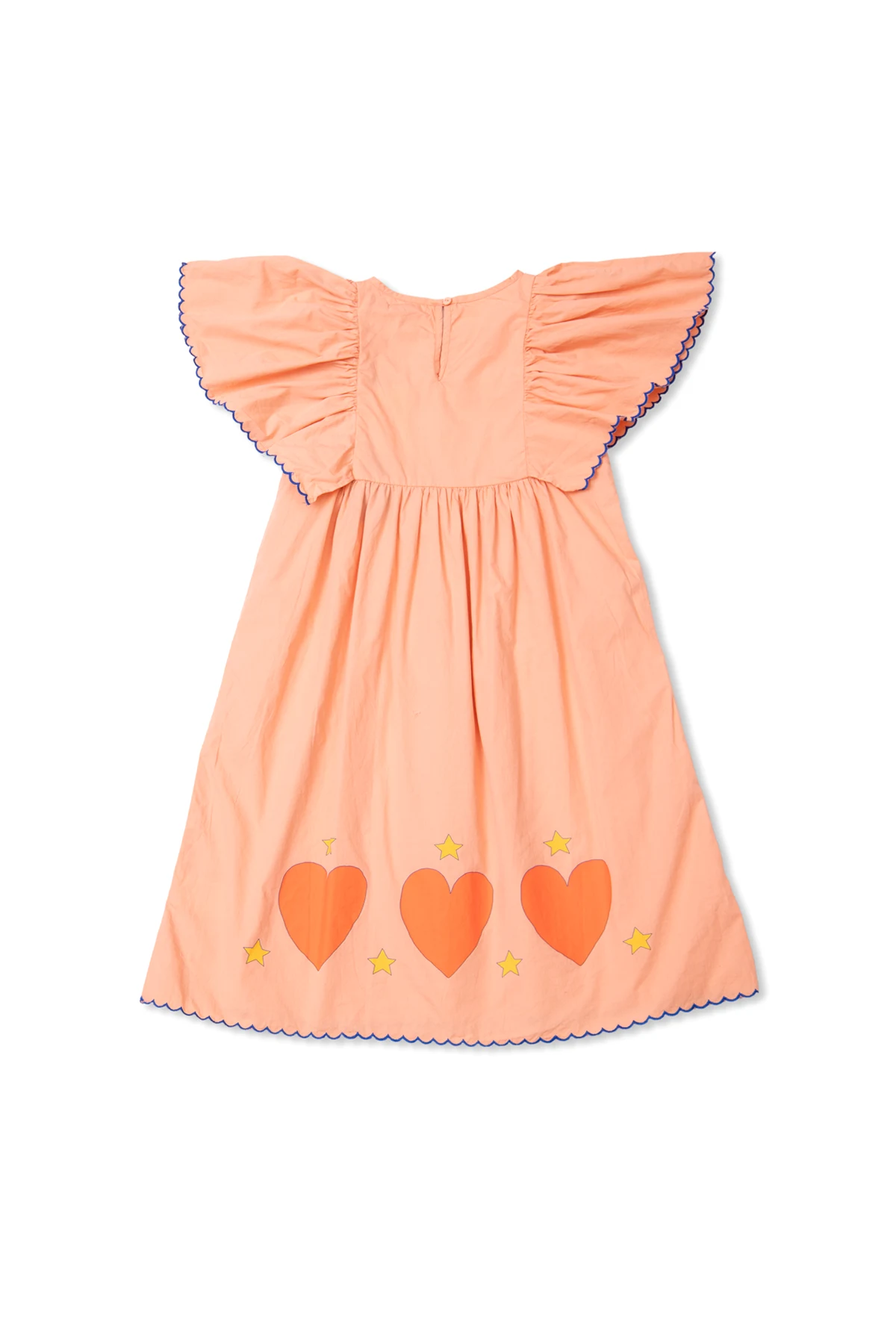 Charakterystyczny luźny krój z wyraźnie zaznaczoną linią talii nadaje sukience lekko rozkloszowany kształt, który gracja przed kolano. Krótkie, bufiaste rękawy zakończone są niebieską falbanką z ząbkowanym wzorem, dodając element zabawy i dziewczęcego wdzięku. Okrągły dekolt sukienki zachowuje klasyczną elegancję, zaś unikatowe detale , takie jak serca i gwiazdy, ozdobione kontrastującymi kolorami, oraz wykończenie w ciemnoniebieskim kolorze, podkreślają jej wyjątkowość.