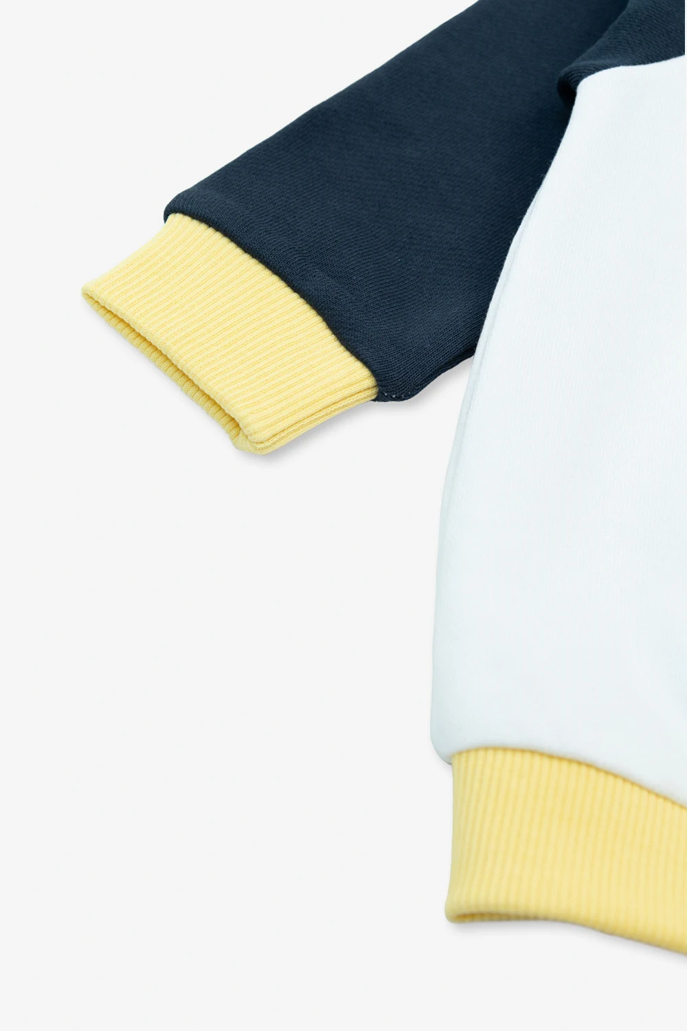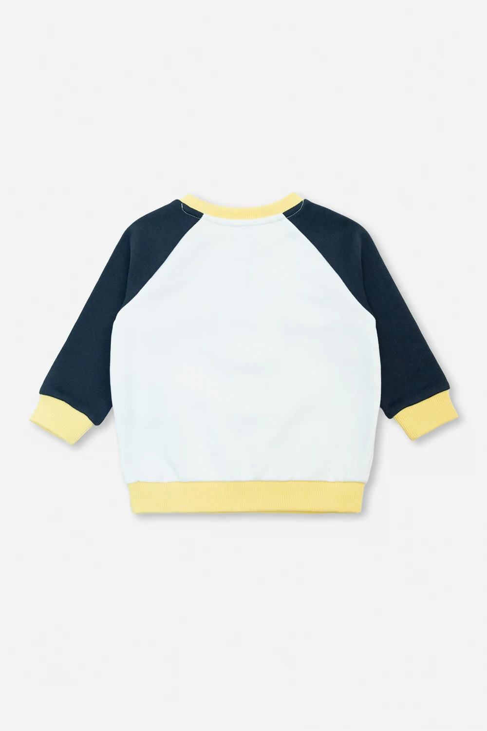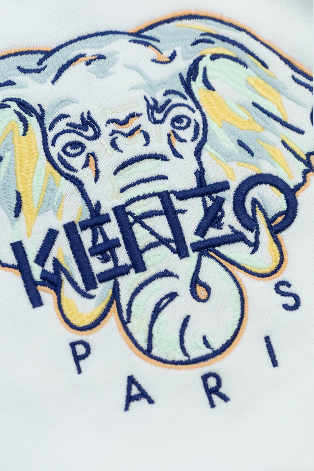 Biało-granatowo-żółta, bawełniana bluza Kenzo Kids. Okrągły dekolt zapinany z przodu na dwa zatrzaski. Z przodu wyszyty kolorowy wzór z głową słonia oraz logo w kolorze niebieskim. Okrągły dekolt, dół i rękawy zakończone ściągaczami.