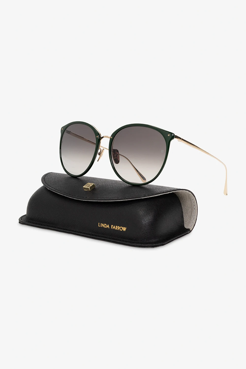 Okulary przeciwsłoneczne w kolorze ciemnej zieleni i złota, model ‘Kings’ Linda Farrow. Wykonane z lśniącego acetatu pochodzącego z recyklingu oraz tytanu platerowanego 22-karatowym żółtym złotem. Okrągłe oprawki typu ‘oversize’ z pojedynczym mostkiem i ruchomymi noskami wykończonymi logo. Cienkie zauszniki. Szare szkła z technologią ZEISS, chroniące przed promieniowaniem UV oraz odblaskami. Dołączone etui.