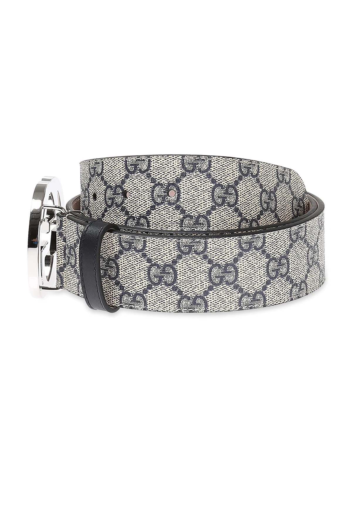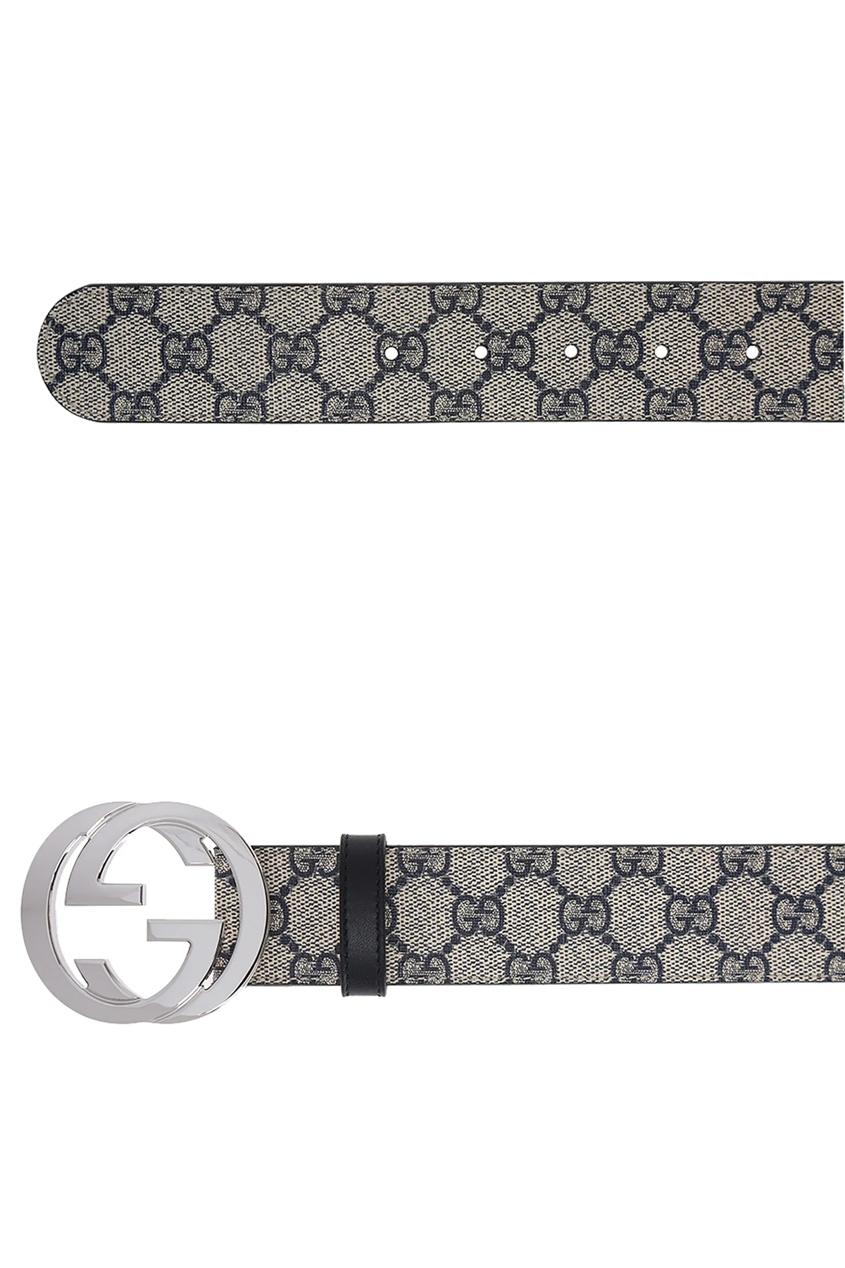 Beżowo-granatowy pasek Gucci. Wykonany z wytrzymałego materiału 'GG Supreme'. Metalowa klamra w kształcie logo marki w kolorze srebrnym.