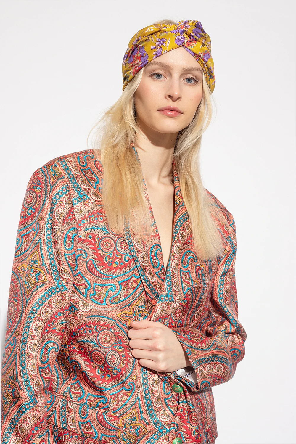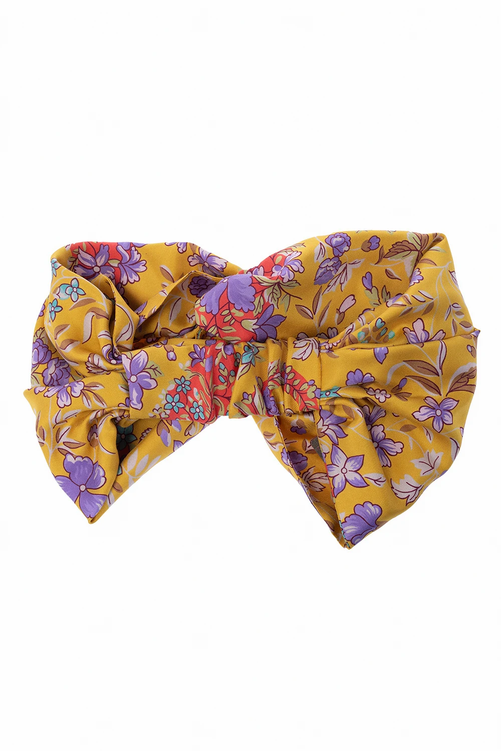 Żółta opaska na głowę Etro. Wykonana z jedwabnej satyny. Ozdobiona kolorowym wzorem z motywem kwiatowym. Z przodu dekoracyjny węzeł. Z tyłu wszyta elastyczna guma.