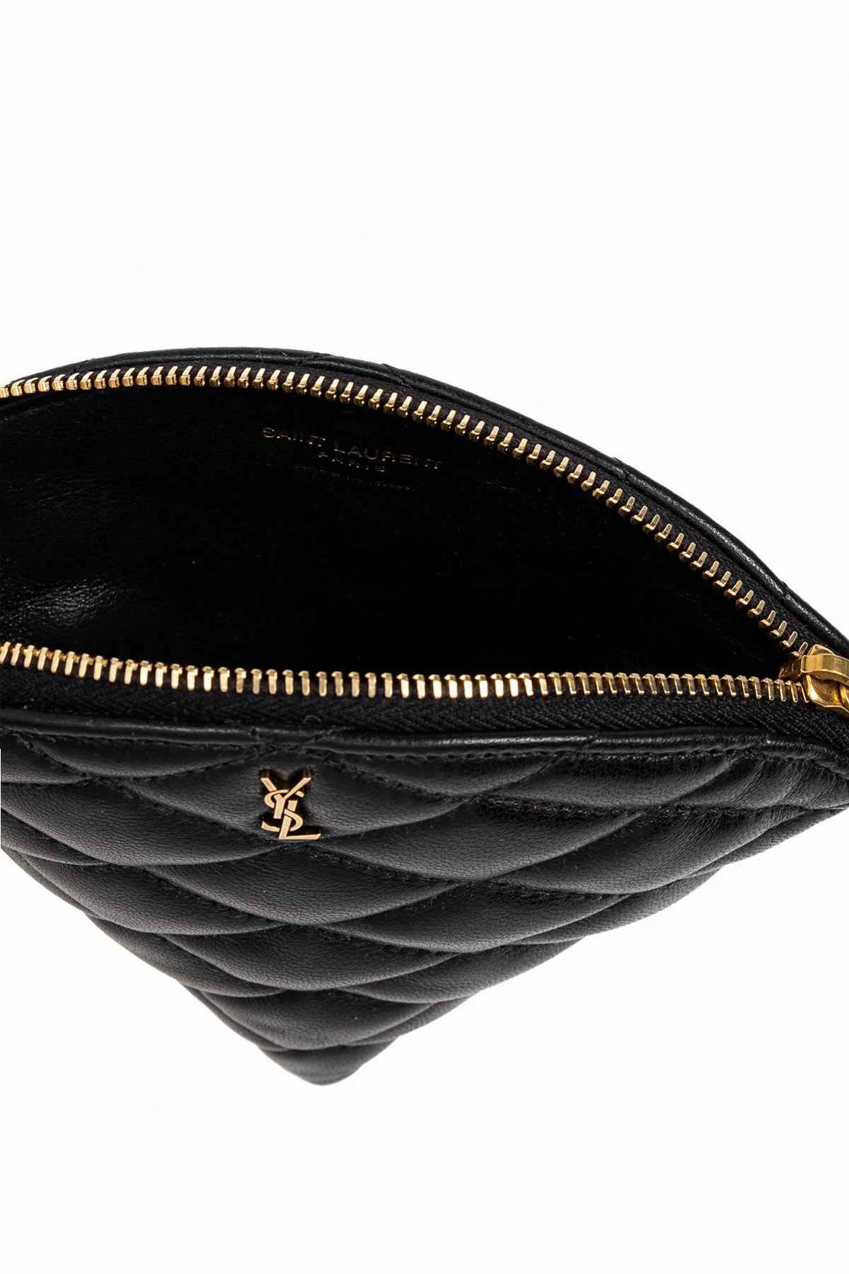 Wnętrze portmonetki, wykończone czarnym materiałem, skrywa napisy "Saint Laurent Paris" oraz praktyczną komorę z brelokiem, co czyni ją nie tylko estetycznym, ale i funkcjonalnym dodatkiem.