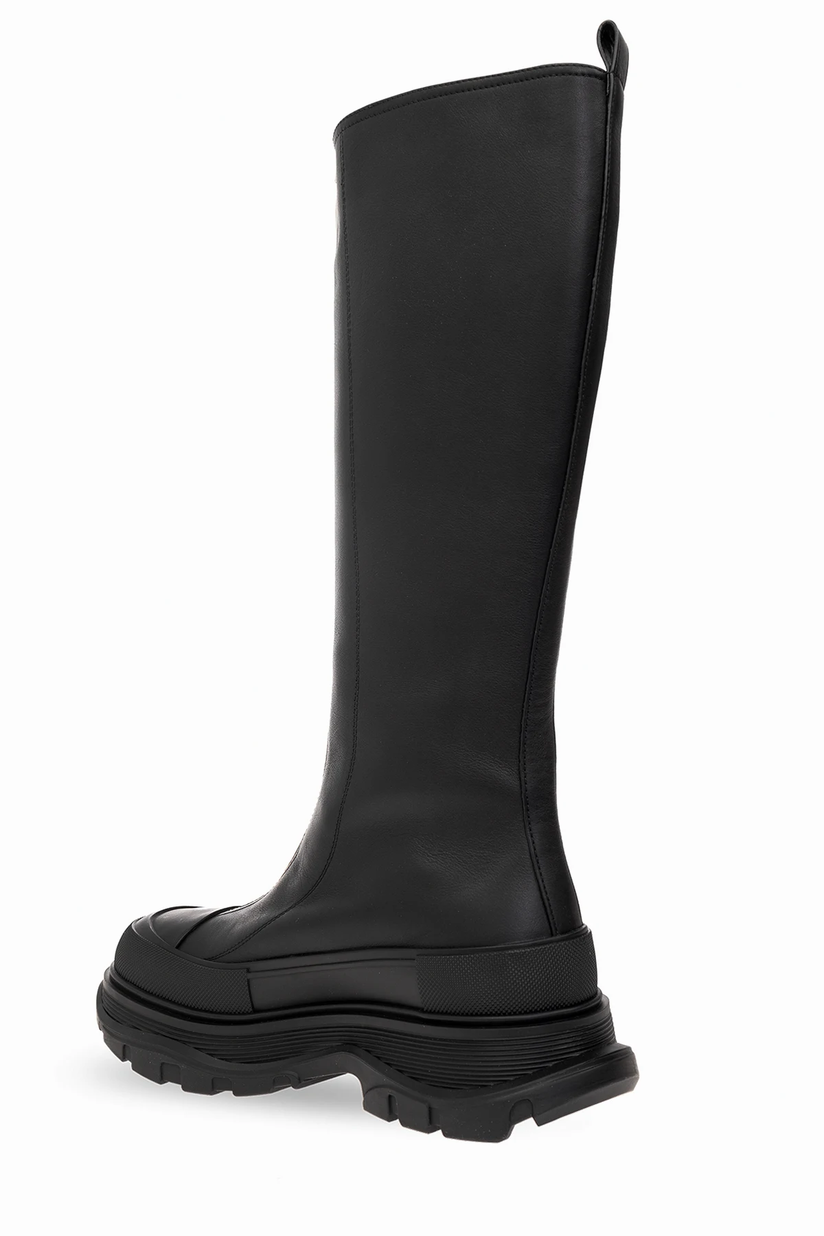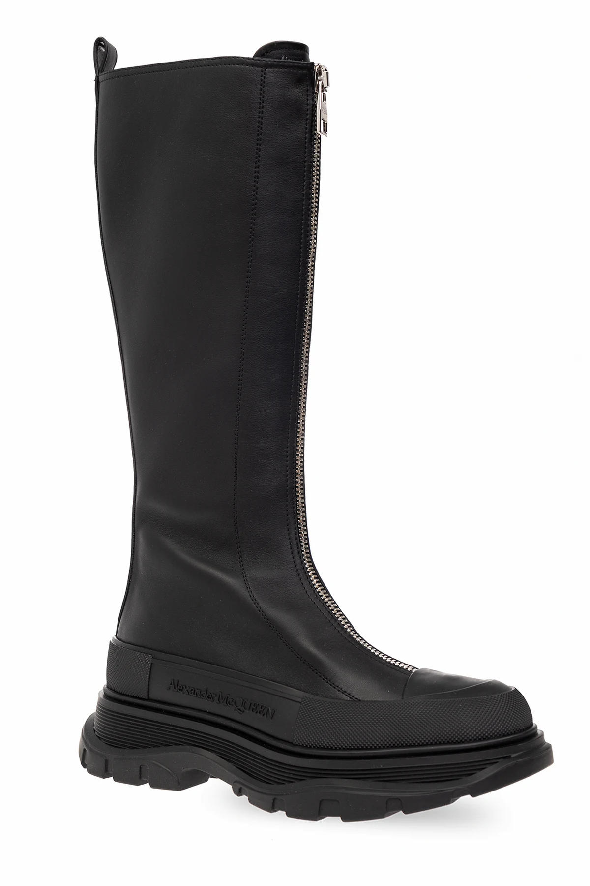 Czarne botki do kolana, model ‘Tread Slick’ Alexander McQueen. Wykonane z cielęcej skóry. Zapinane na długi zamek w kolorze srebrnym. Z boku gumowa wstawka z wytłoczonym logo. Czarna, gumowa podeszwa.