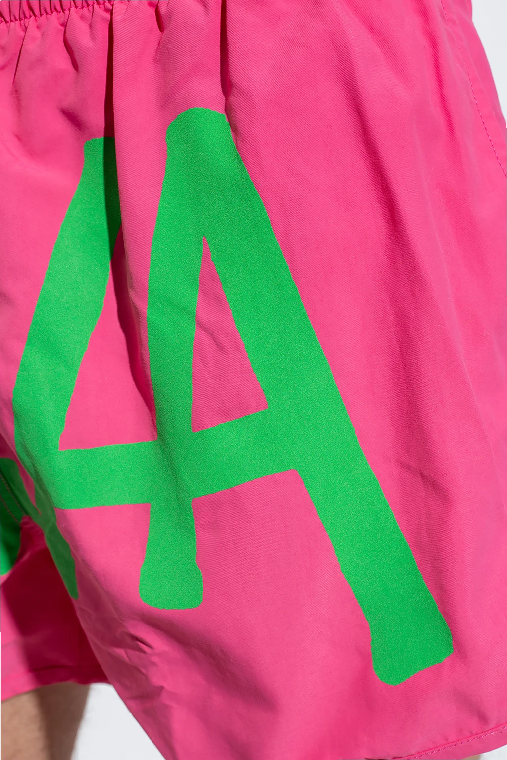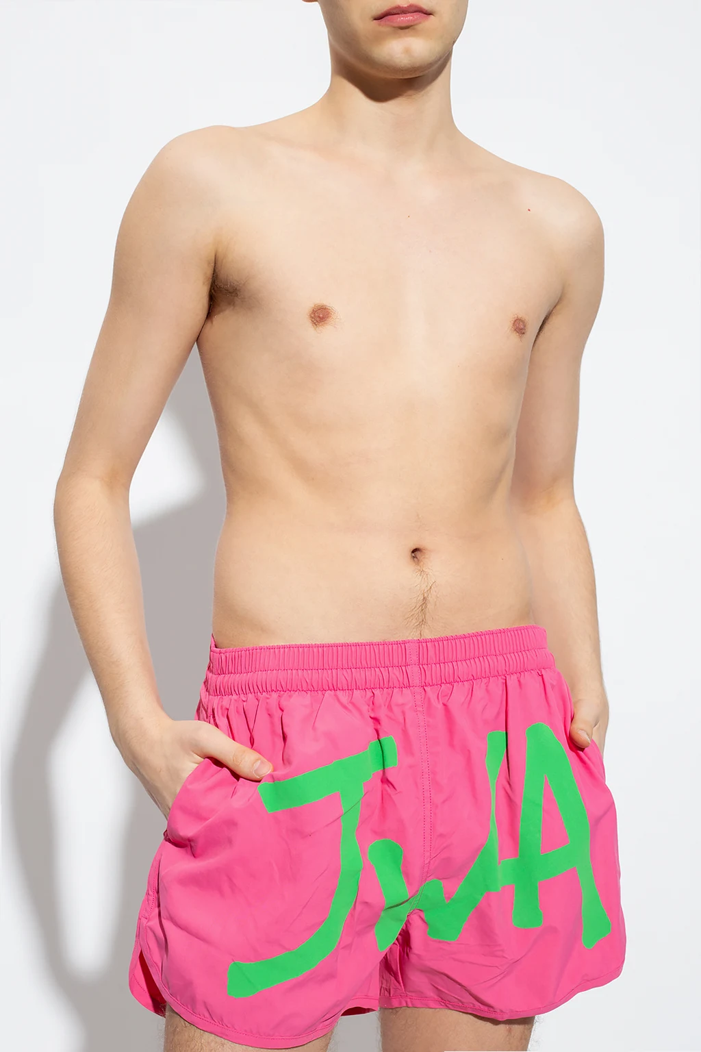 Różowe szorty kąpielowe JW Anderson. W pasie wszyta guma ściągana trokami. Ozdobione nadrukiem z logo w kolorze zielonym. Trzy kieszenie: dwie kieszenie wsuwane oraz jedna na zatrzask.