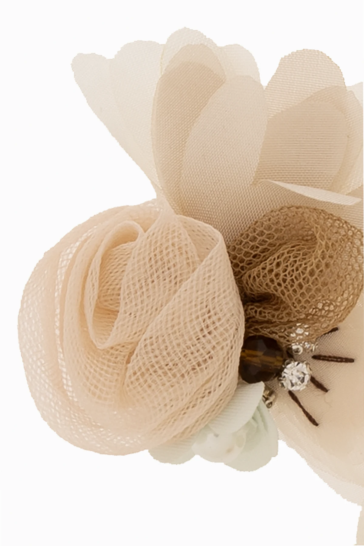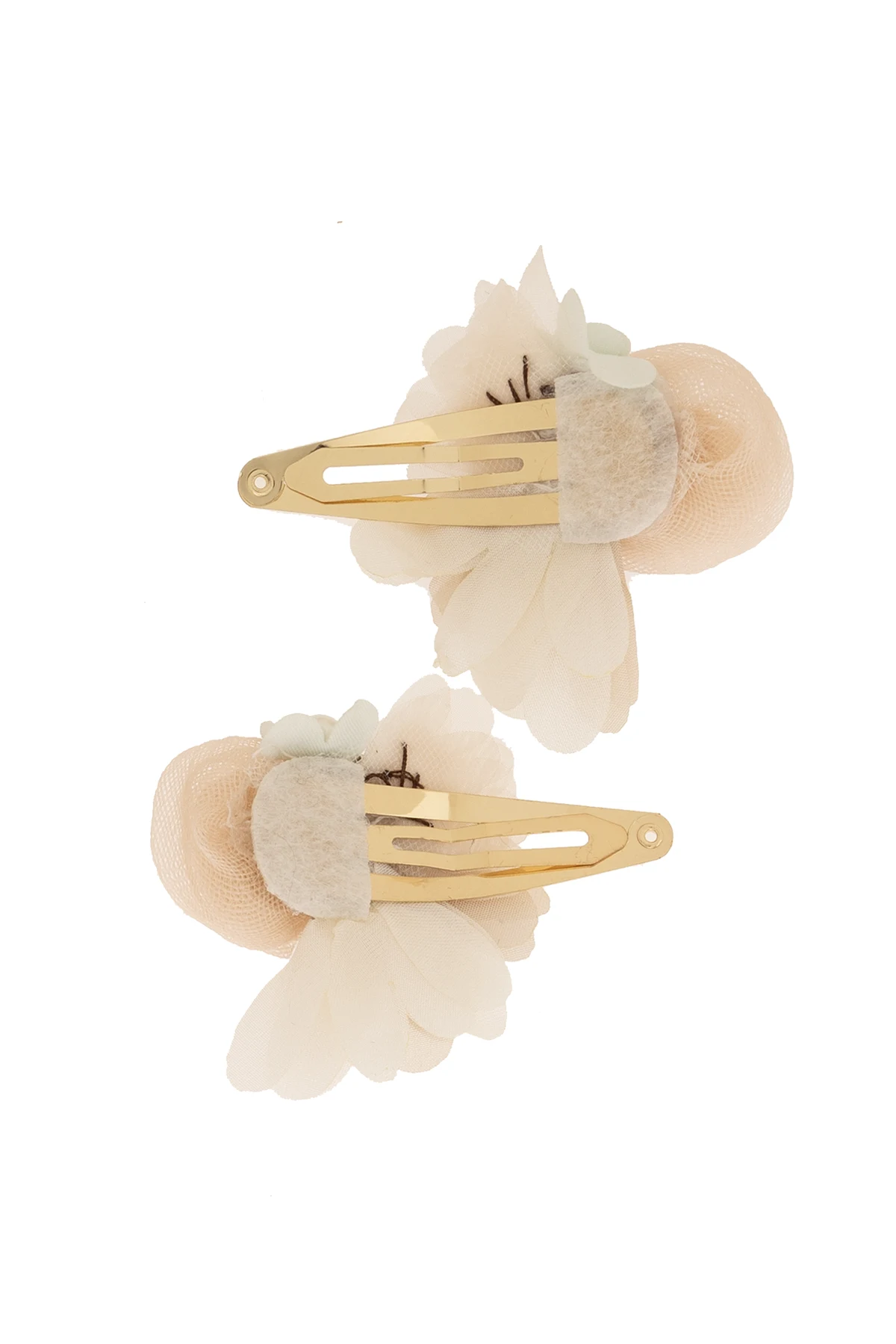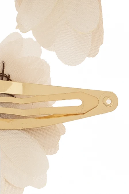 Komplet dwóch kolorowych spinek do włosów Bonpoint. Wykonane z metalu w kolorze złotym. Ozdobione kwiatowym detalem z jedwabiu i tiulu wykończonym sztucznymi perłami i połyskującymi kryształami.