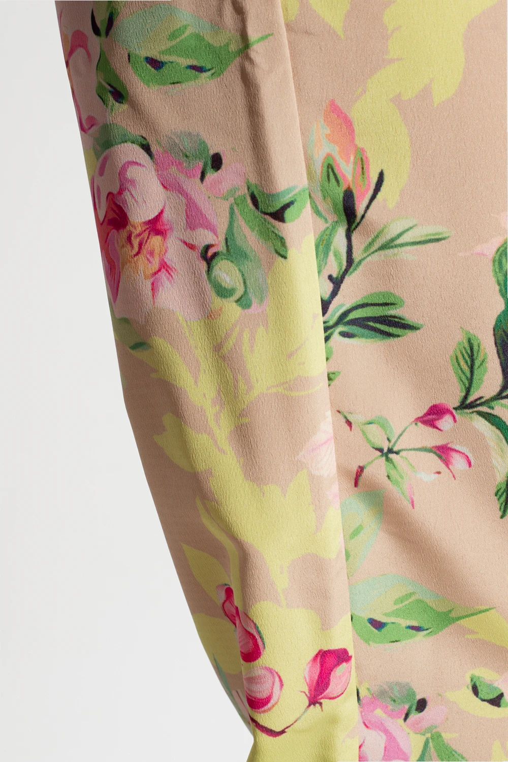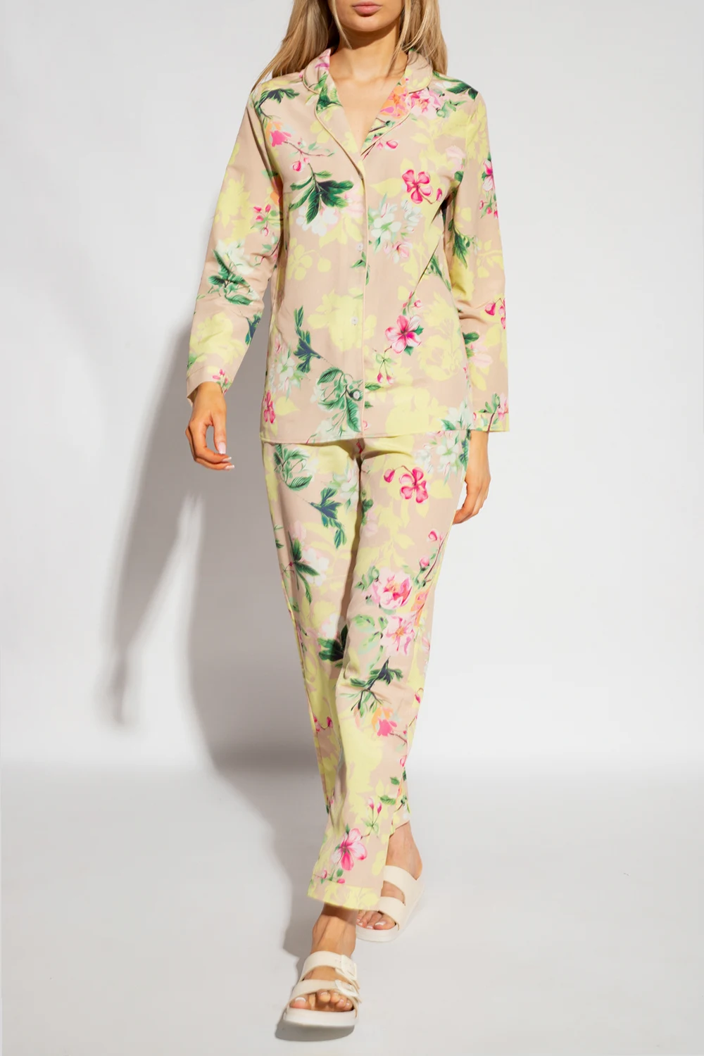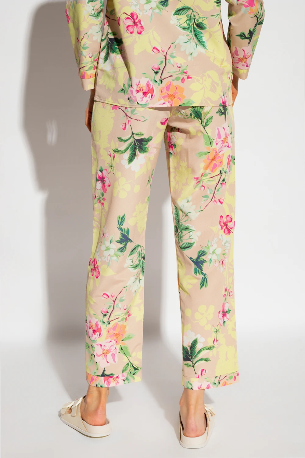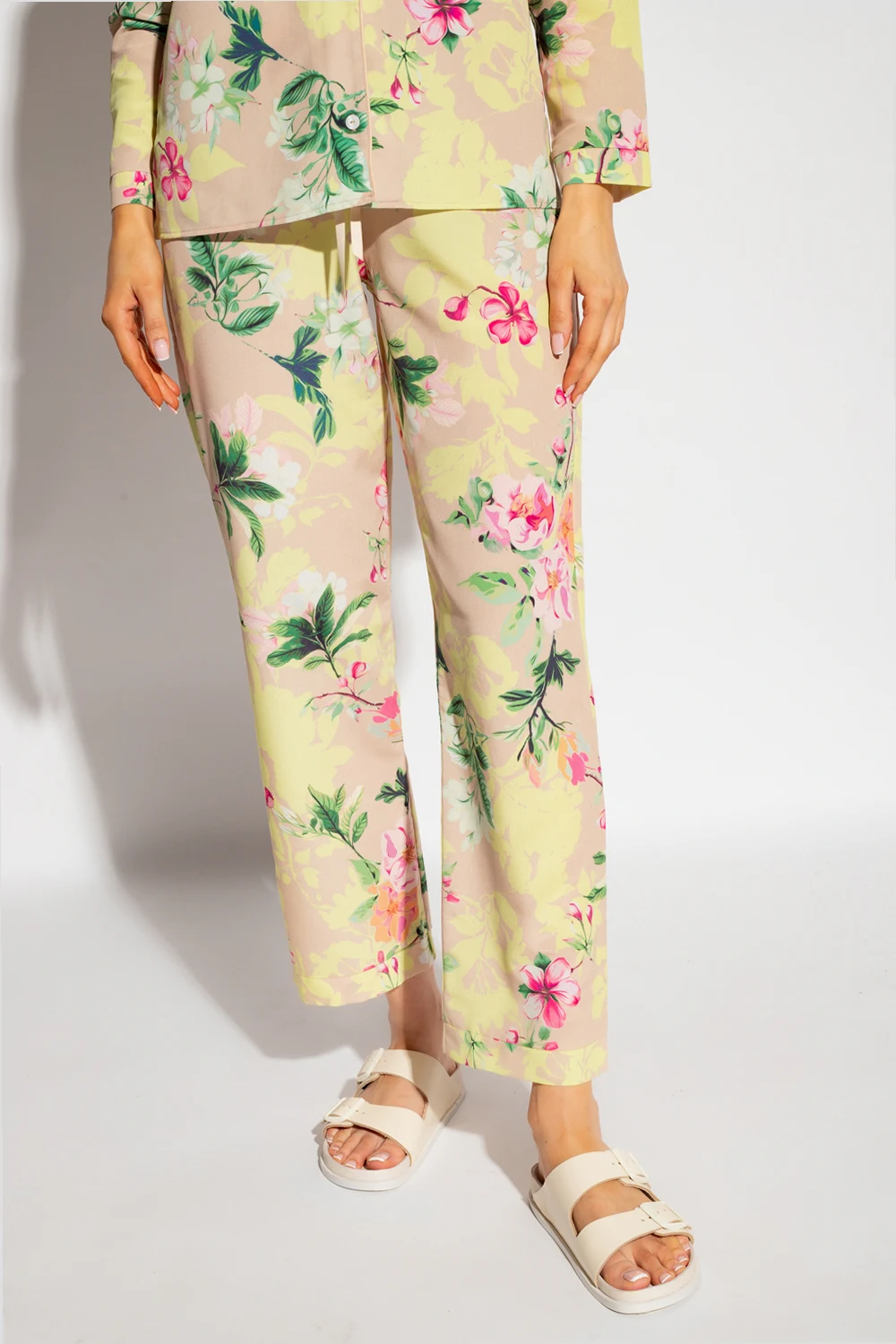 Beżowy dół od piżamy Maison Lejaby, linia ‘Nufit Garden’. W pasie ściągany trokami. Ozdobiony kolorowym nadrukiem z motywem kwiatowym.