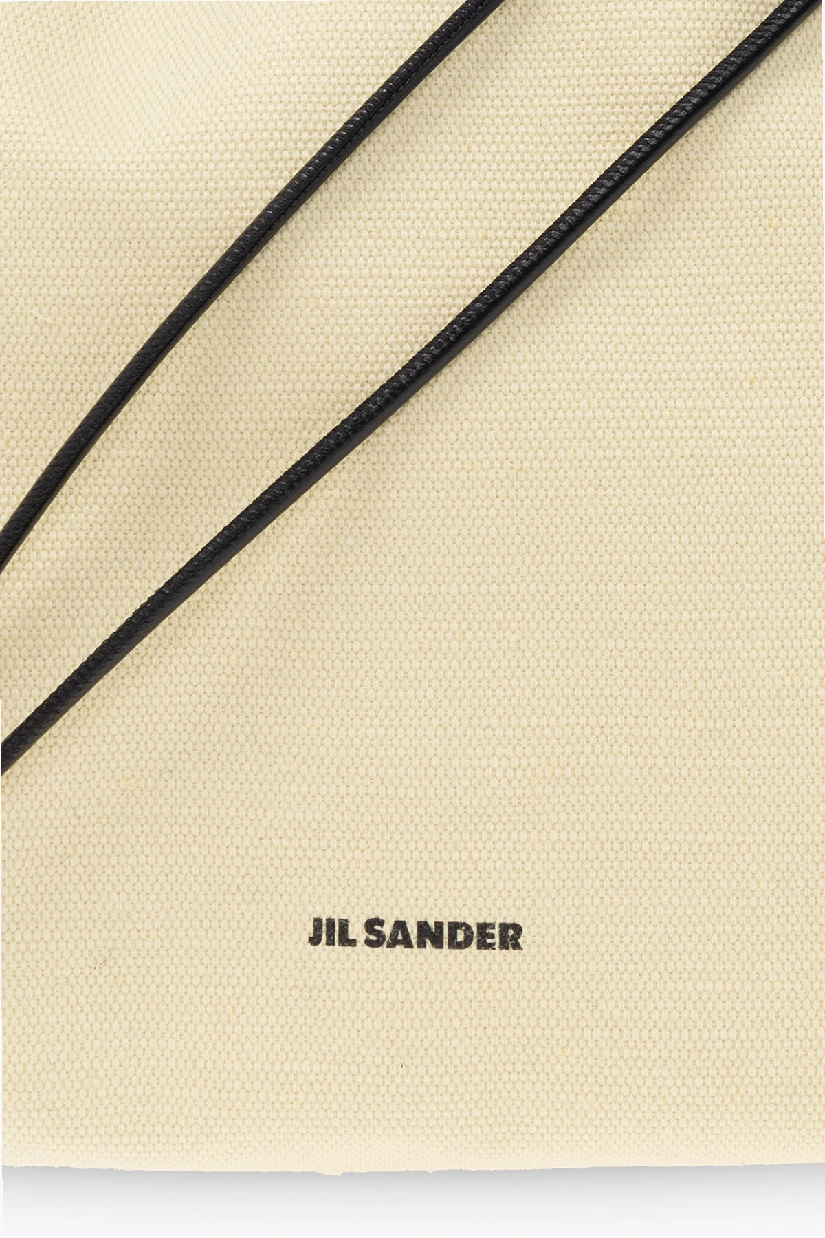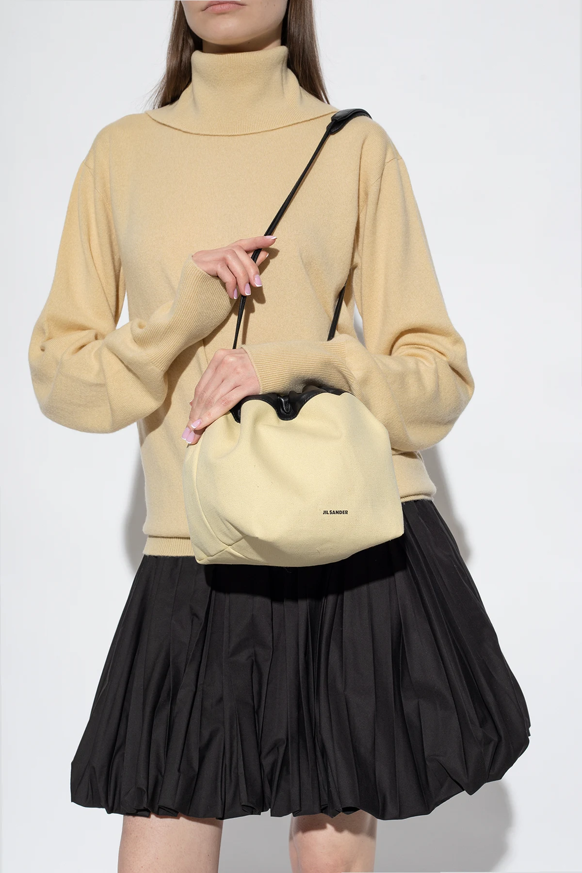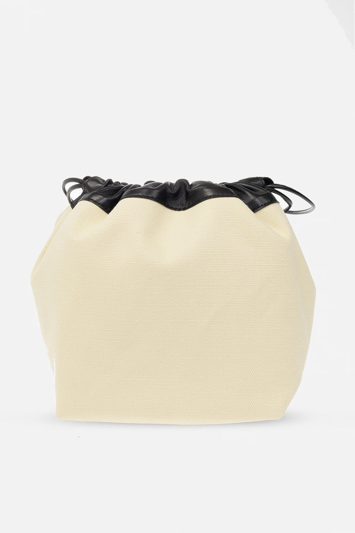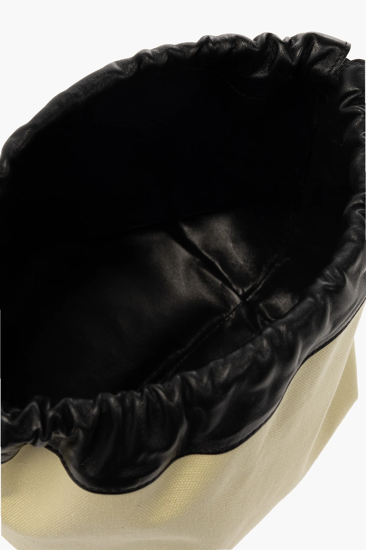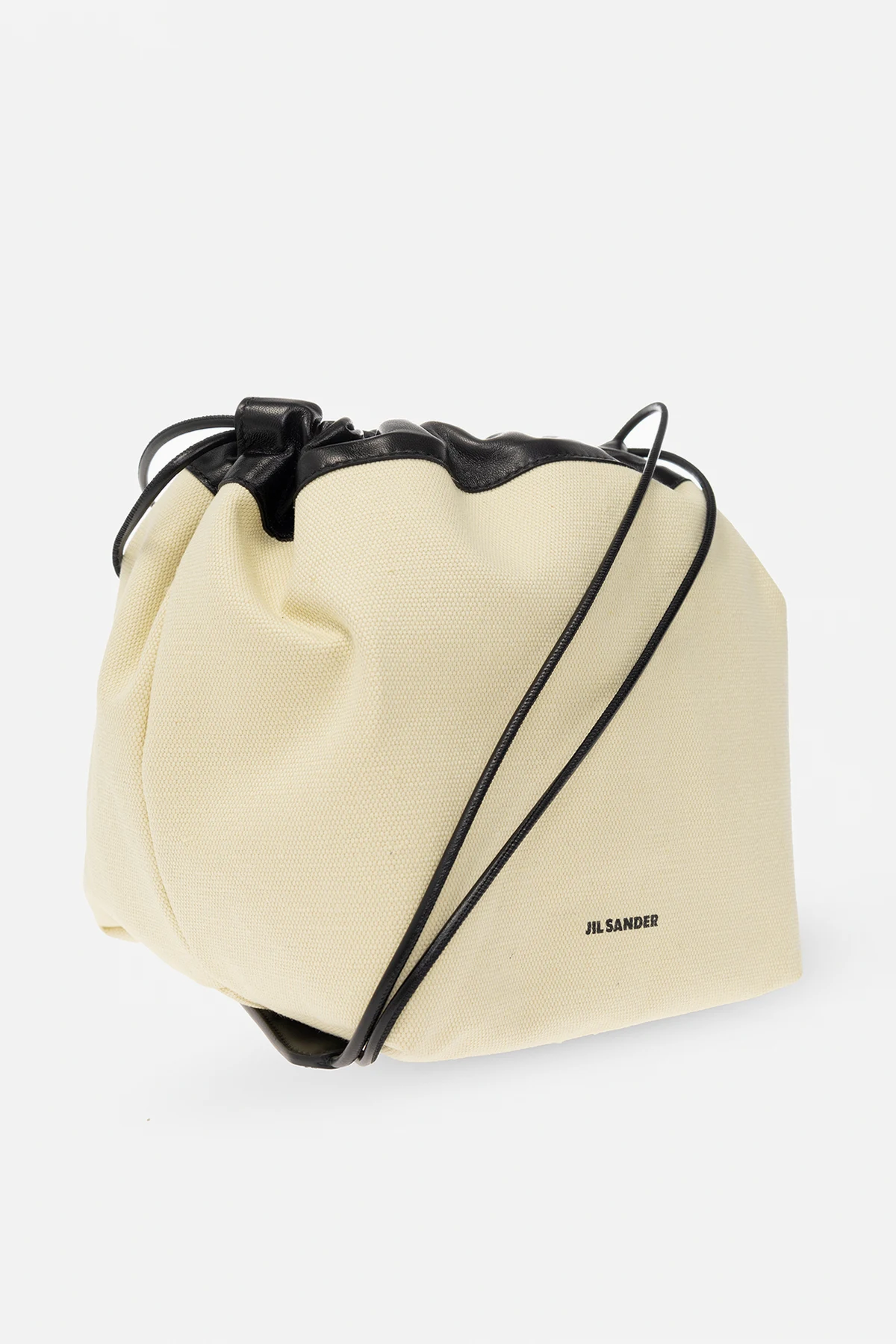 Jasnożółta torba na ramię typu ‘bucket’, model ‘Dumpling’ JIL SANDER. Wykonana z bawełny i lnu. Wykończona czarną skórą. Ściągana trokami. Z przodu nadrukowane logo w kolorze czarnym. Podwójny pasek na ramię. Wewnątrz komora i miejsce na kartę.