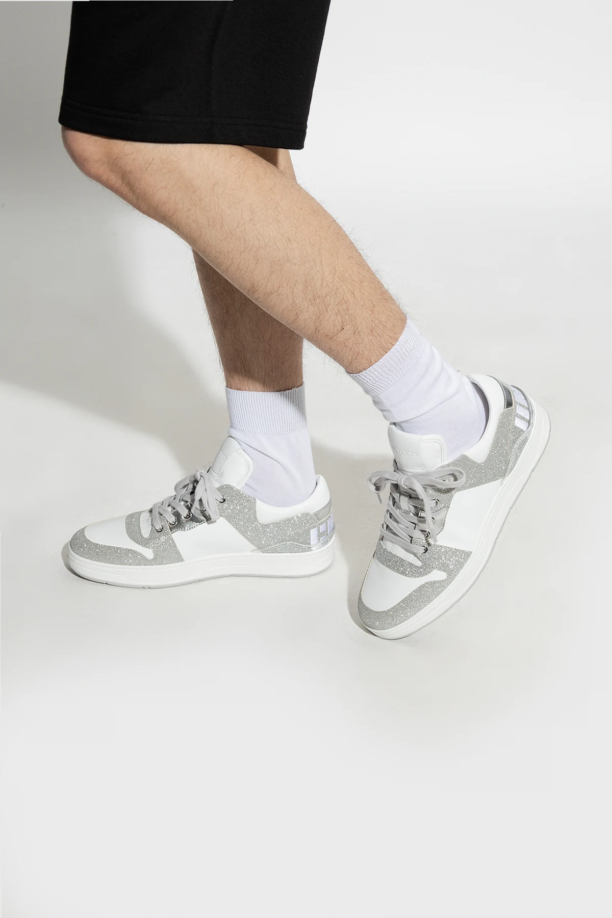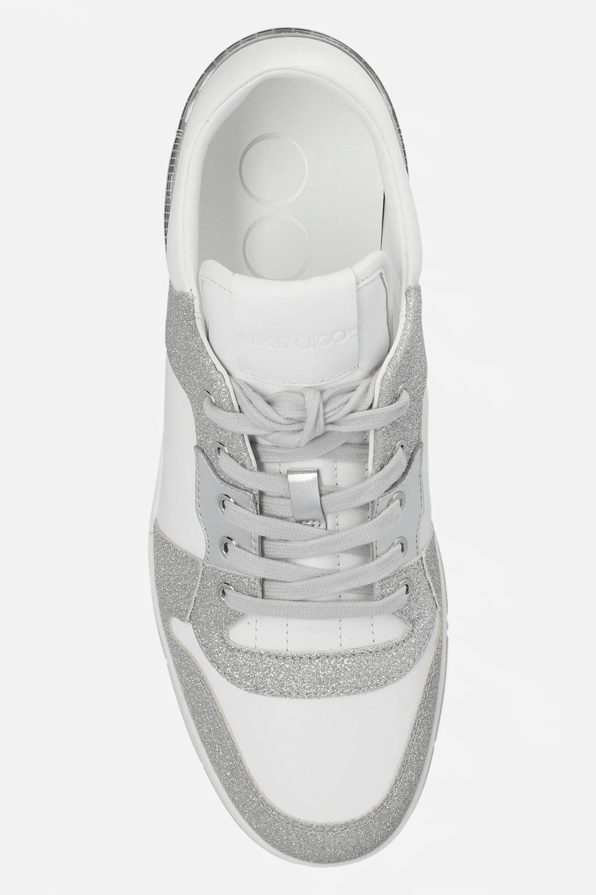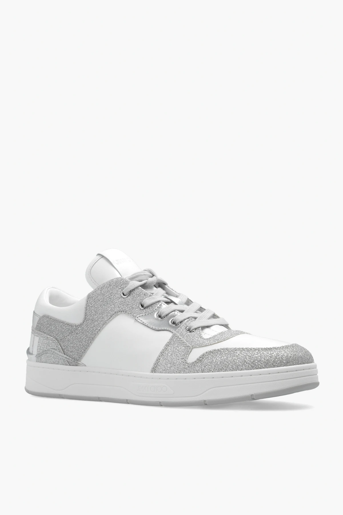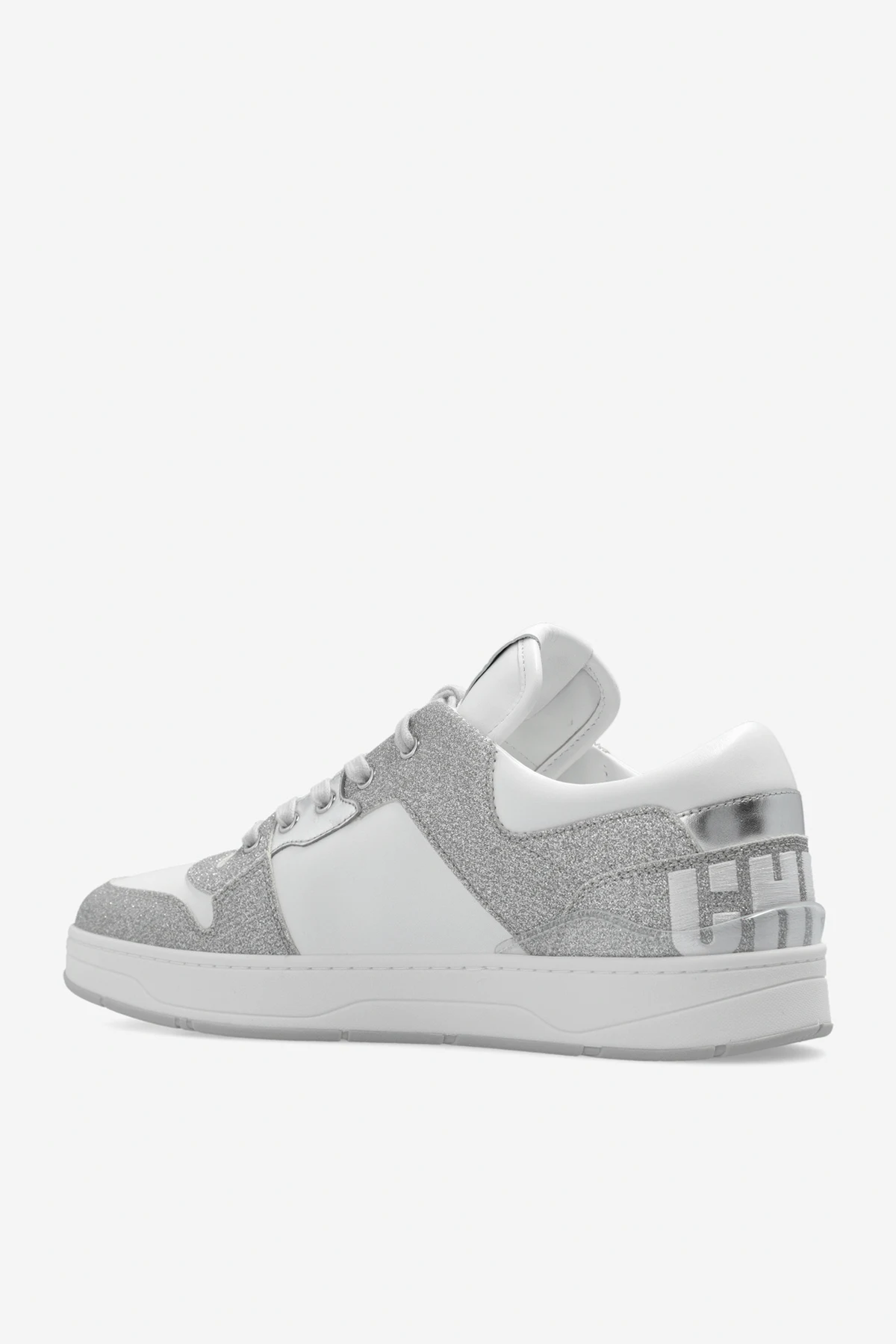 Sznurowane buty sportowe w kolorze srebrno-białym, model ‘Florent’ Jimmy Choo. Wykonane ze skóry i materiału pokrytego brokatem. Ozdobione naszywką i wyszytym logo. Biało-szara, gumowa podeszwa.