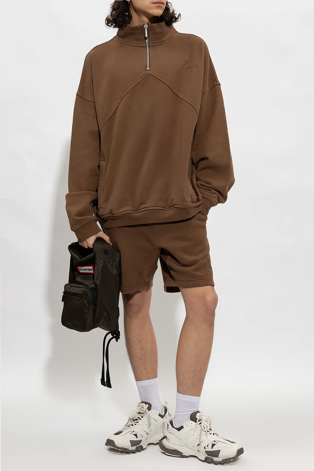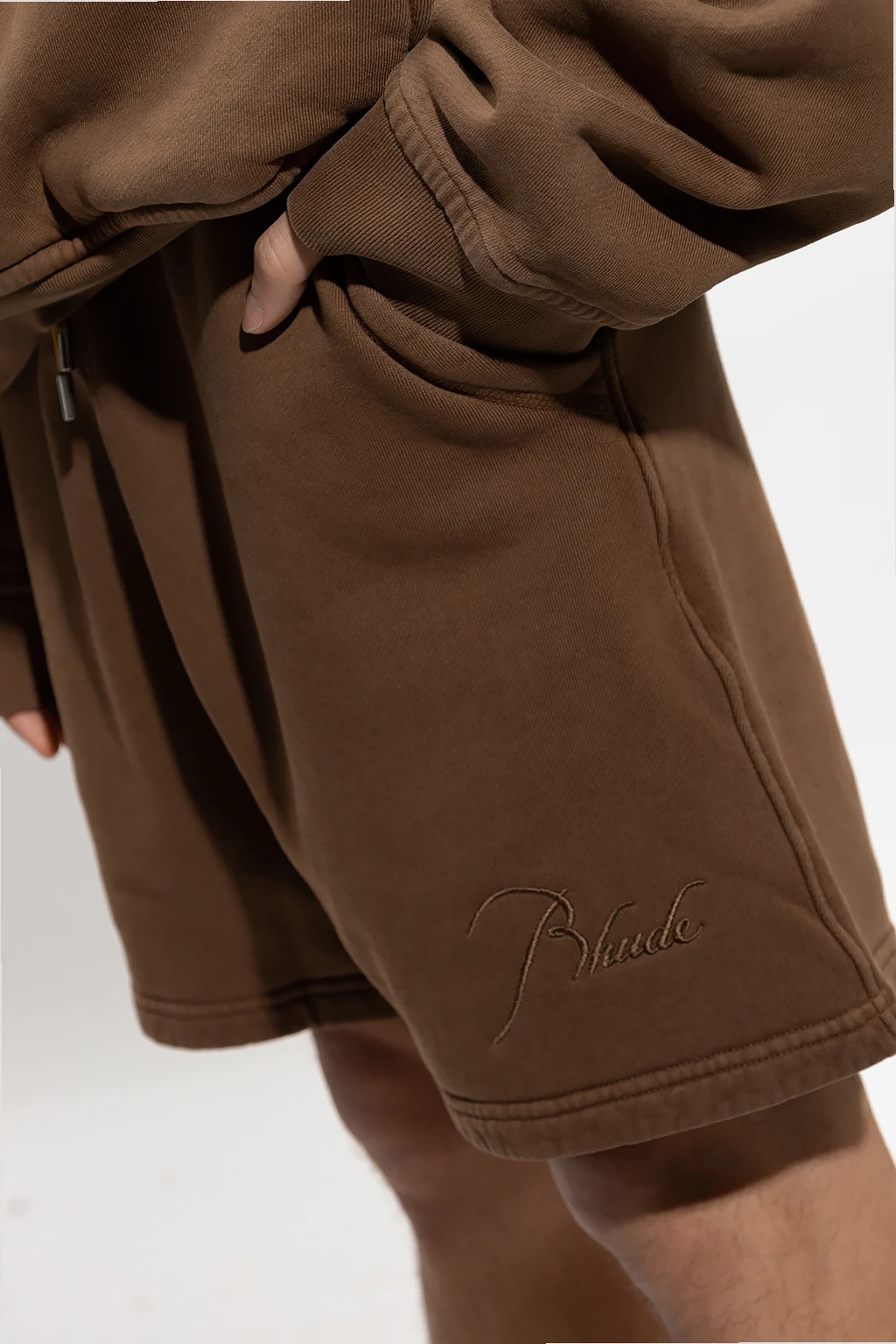 Brązowe, bawełniane szorty Rhude. W pasie ściągane pomarańczowymi trokami. Ozdobione wyszytym logo. Trzy kieszenie: dwie z przodu i jedna z tyłu.
