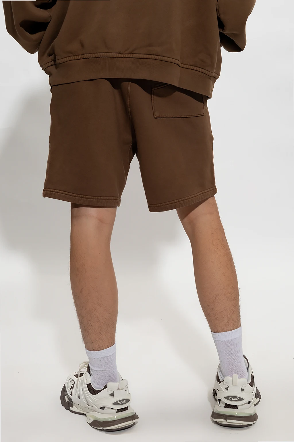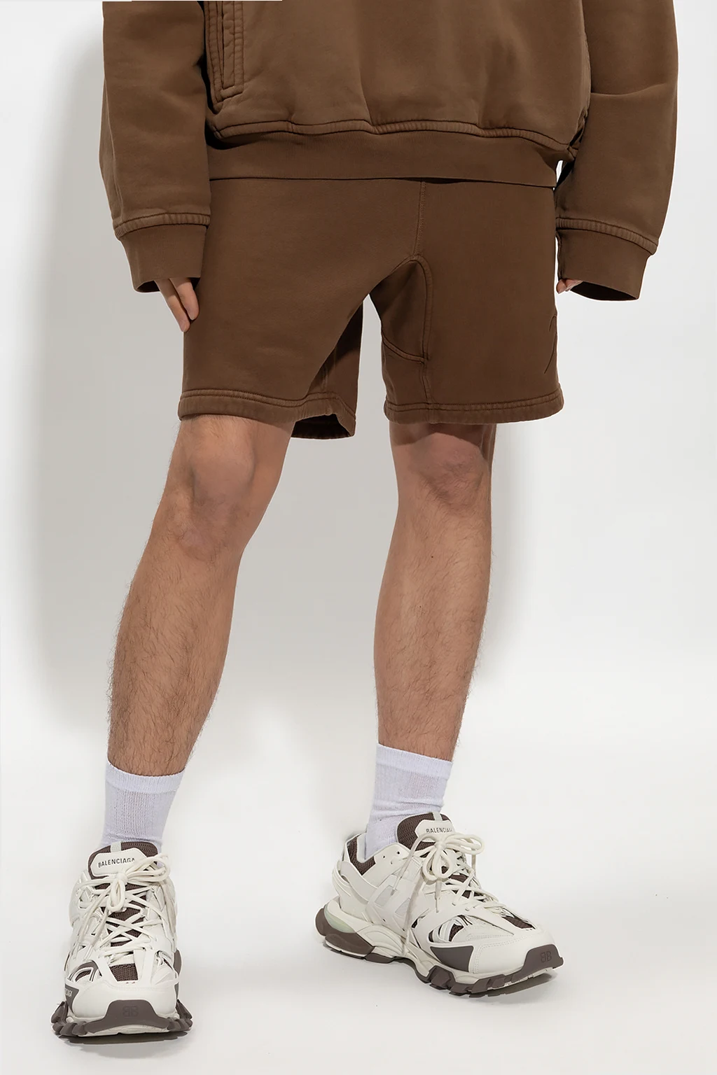 – Beżowe fakturowane szorty oversize w jodełkę