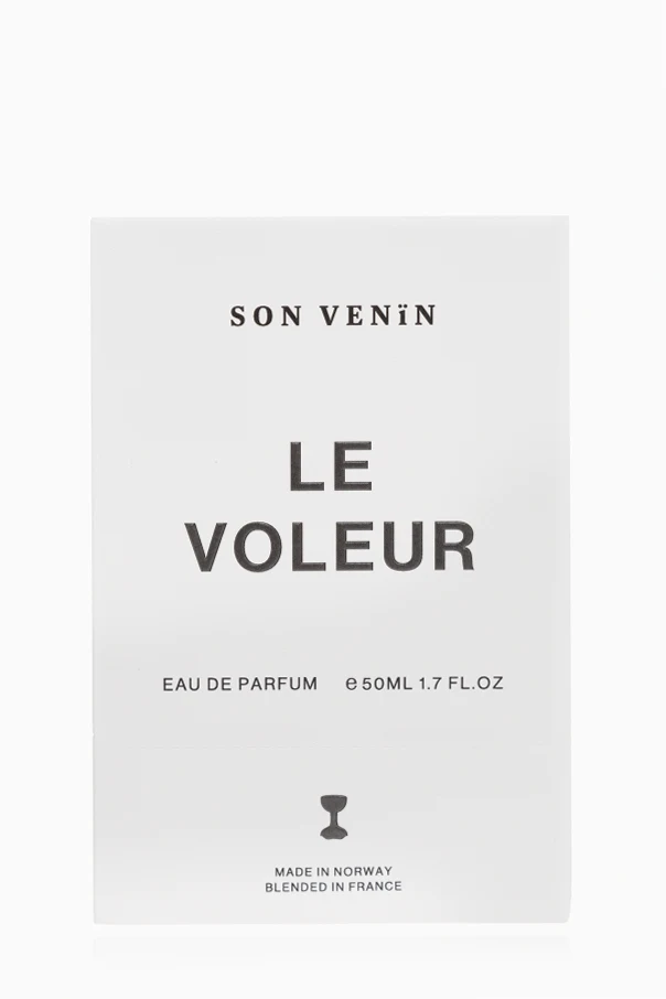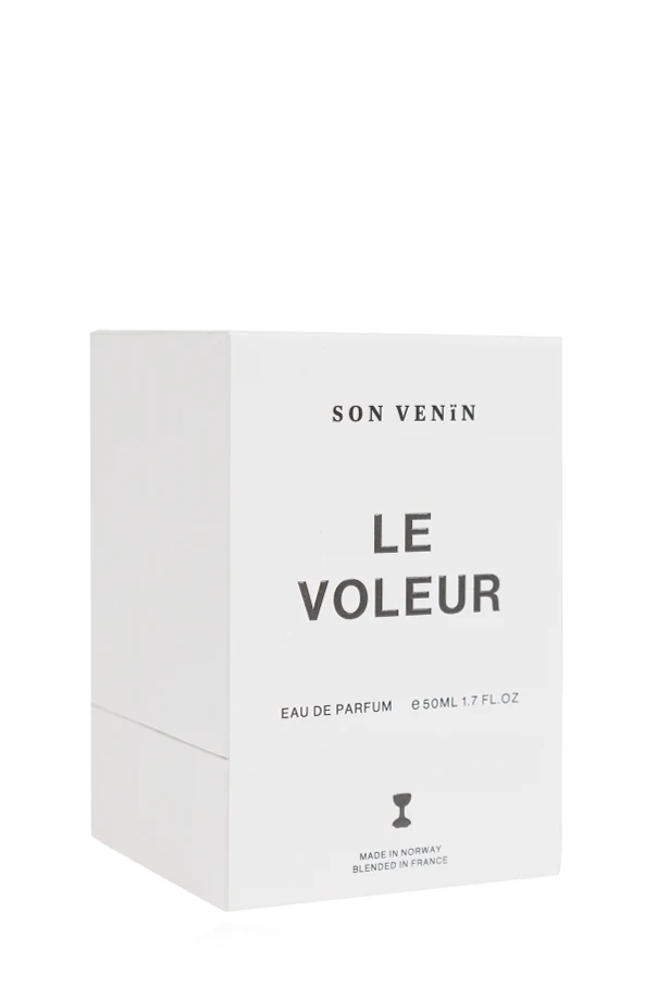 Opakowanie perfum jest równie luksusowe. Prostokątne pudełko w minimalistycznym, białym kolorze, z czarnym napisem "SON VENIN LE VOLEUR" oraz informacjami o produkcie, podkreśla jego ekskluzywny charakter. Produkt jest stworzony z najwyższą starannością, o czym świadczy informacja "MADE IN NORWAY, BLENDED IN FRANCE".