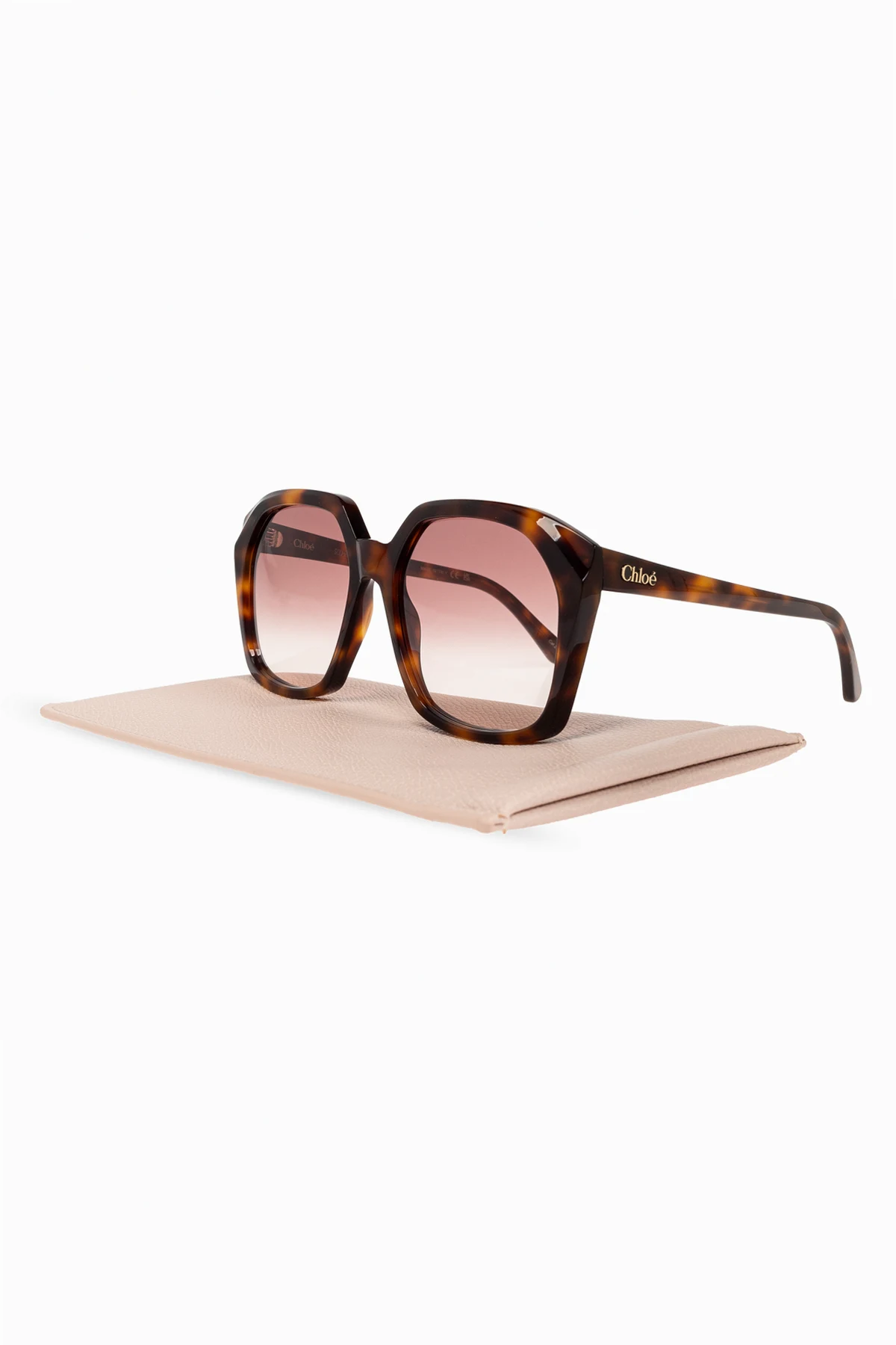 Ekskluzywne detale: nazwa marki "Chloé" w złotym kolorze na zauszniku.