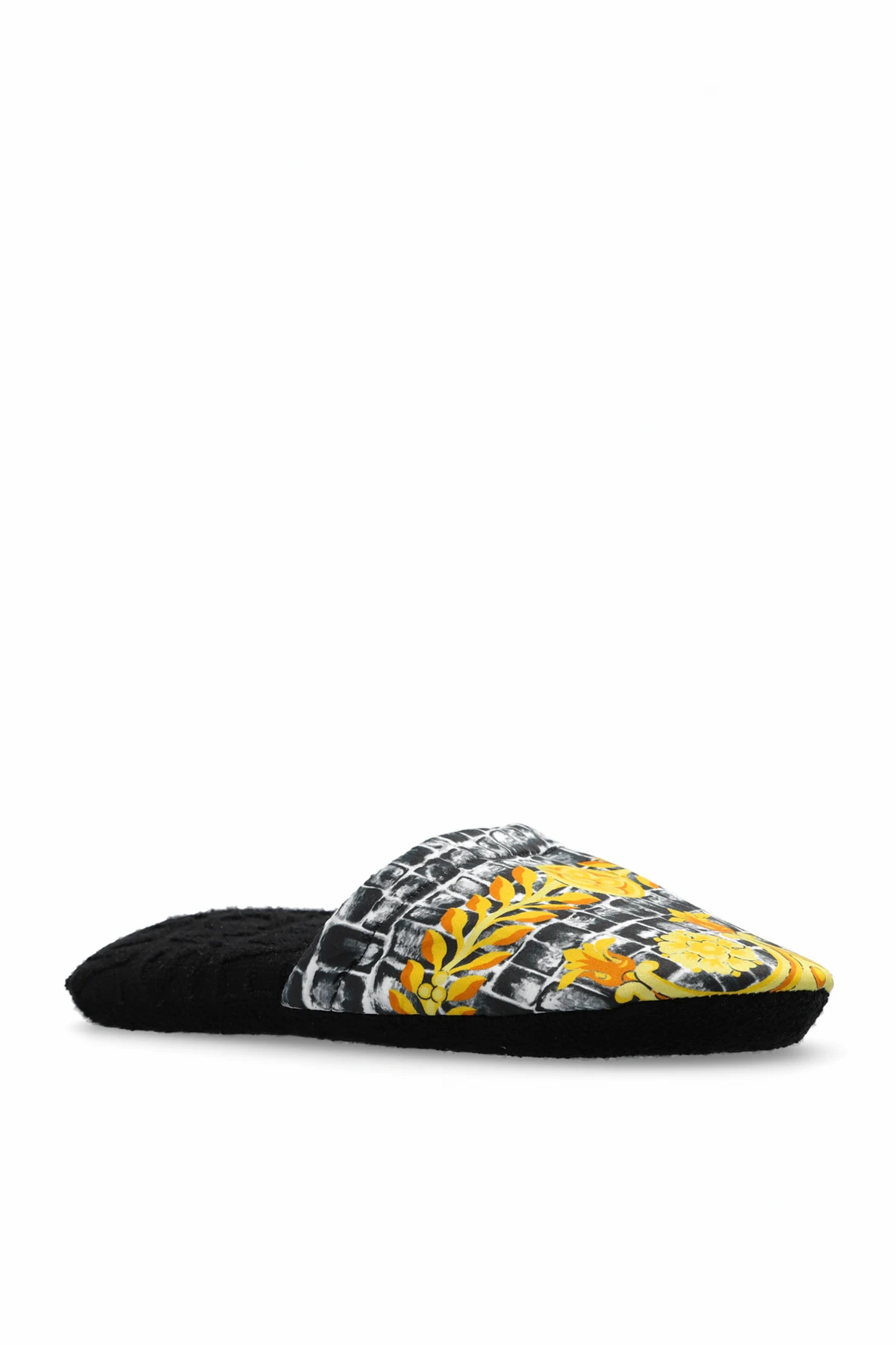 Czarno-białe, bawełniane kapcie Versace Home. Ozdobione dekoracyjnym nadrukiem w kolorze żółto-pomarańczowym.