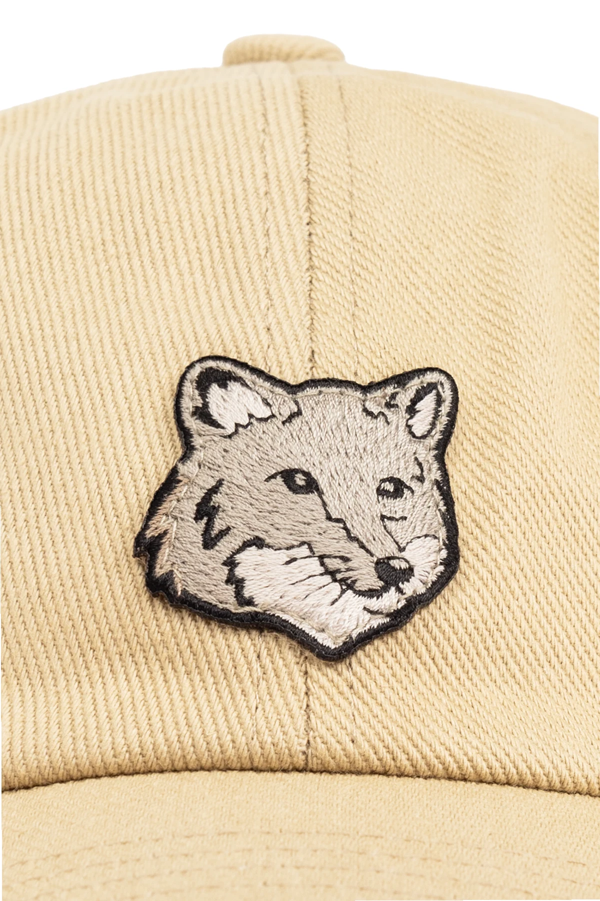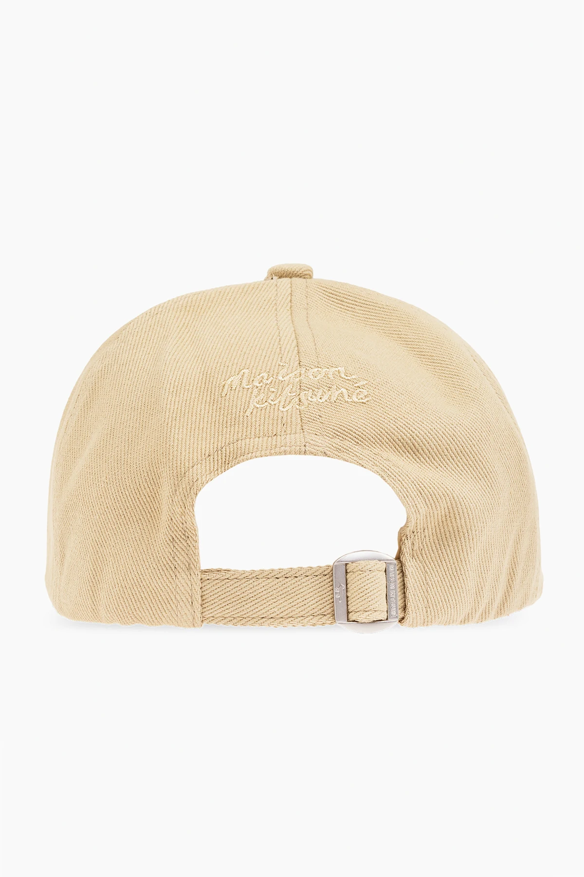 Beżowozielona czapka z daszkiem Maison Kitsune. Wykonana z bawełny. Z przodu ozdobiona naszywką w kształcie logo. Z tyłu regulowany pasek z klamrą.