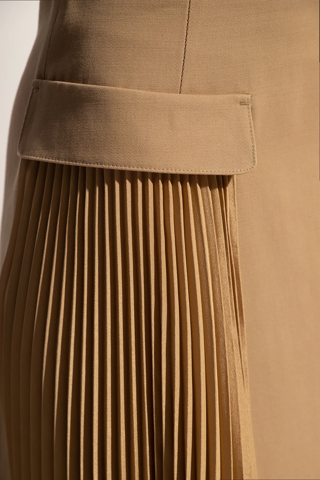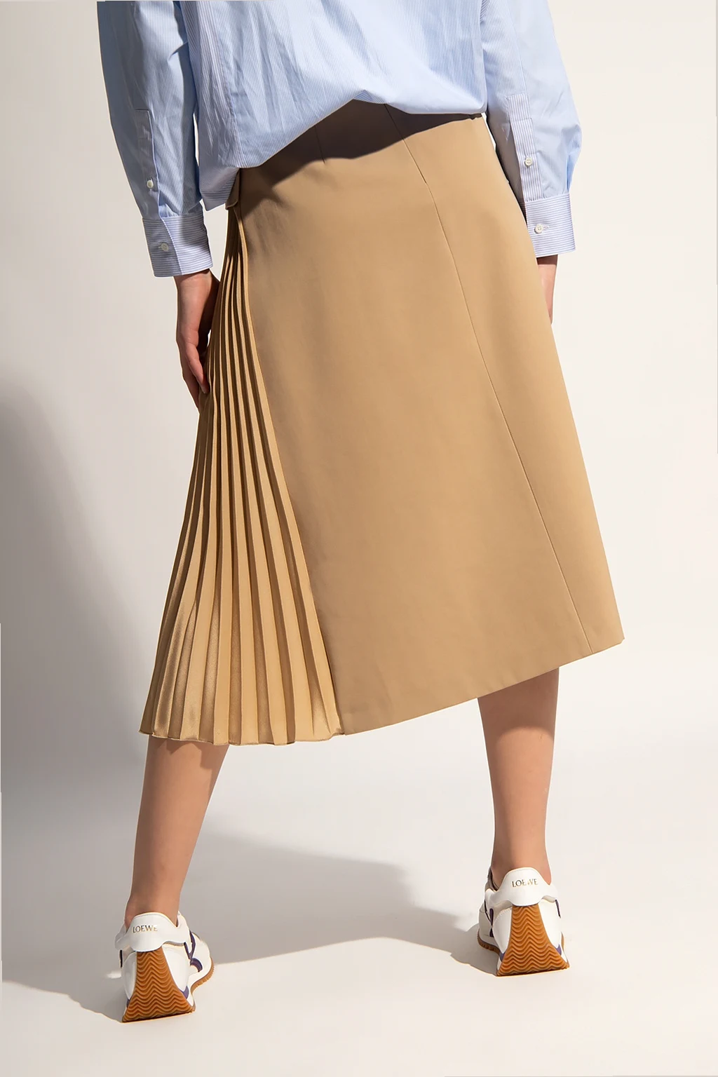 Beżowa spódnica Red Valentino. Z tyłu zapinana na kryty zamek. Ozdobiona plisowanymi wstawkami. Dwie wsuwane kieszenie z patkami. Rozszerzana ku dołowi.