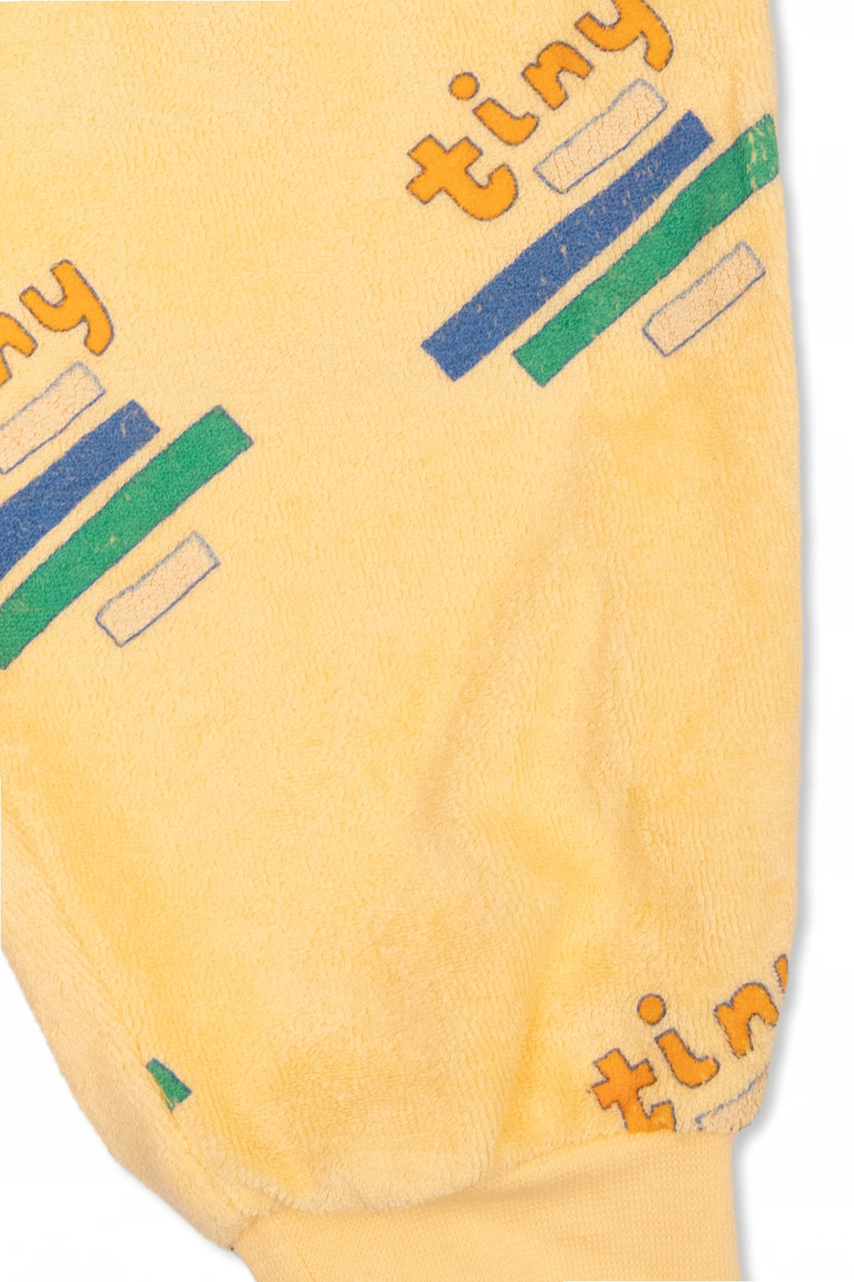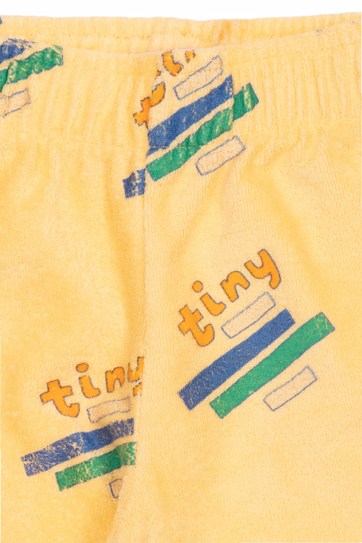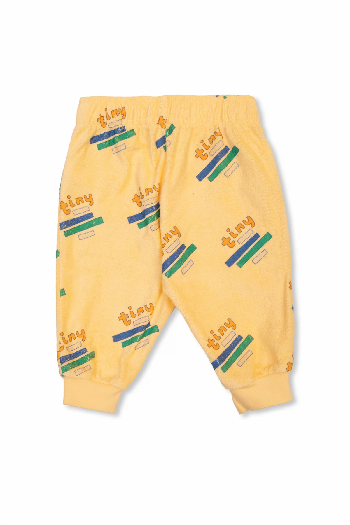 Żółte spodnie dresowe Tiny Cottons. Wykonane z bawełny organicznej typu ‘frotte’. W pasie wszyty ściągacz. Ozdobione kolorowym wzorem z logo. Długie nogawki zakończone ściągaczem.