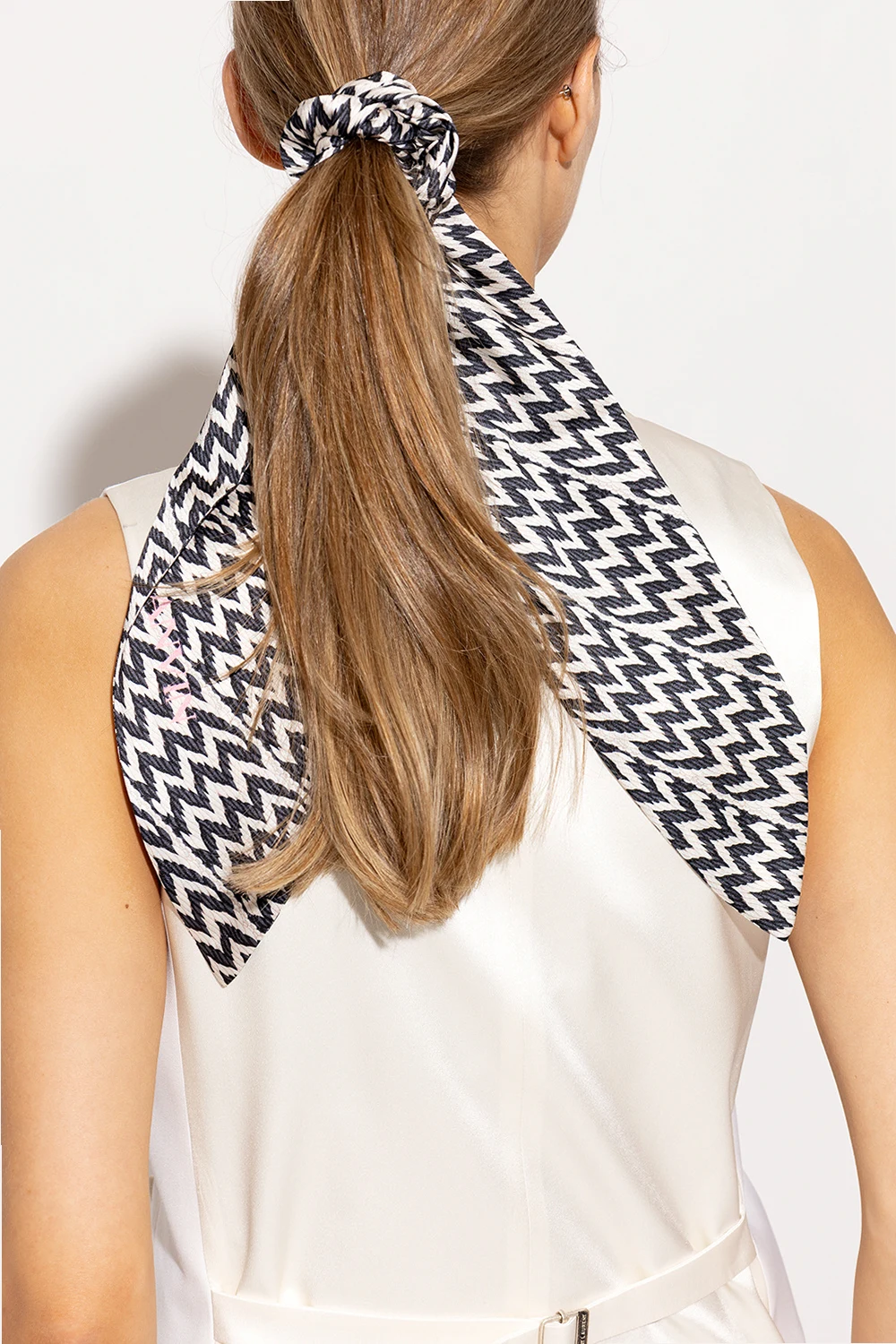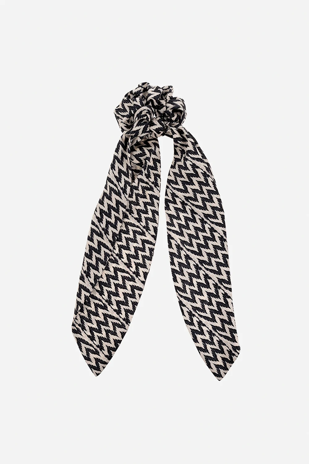 Czarno-szaro-kremowa, wzorzysta gumka do włosów Lanvin. Ozdobiona różowym logo.