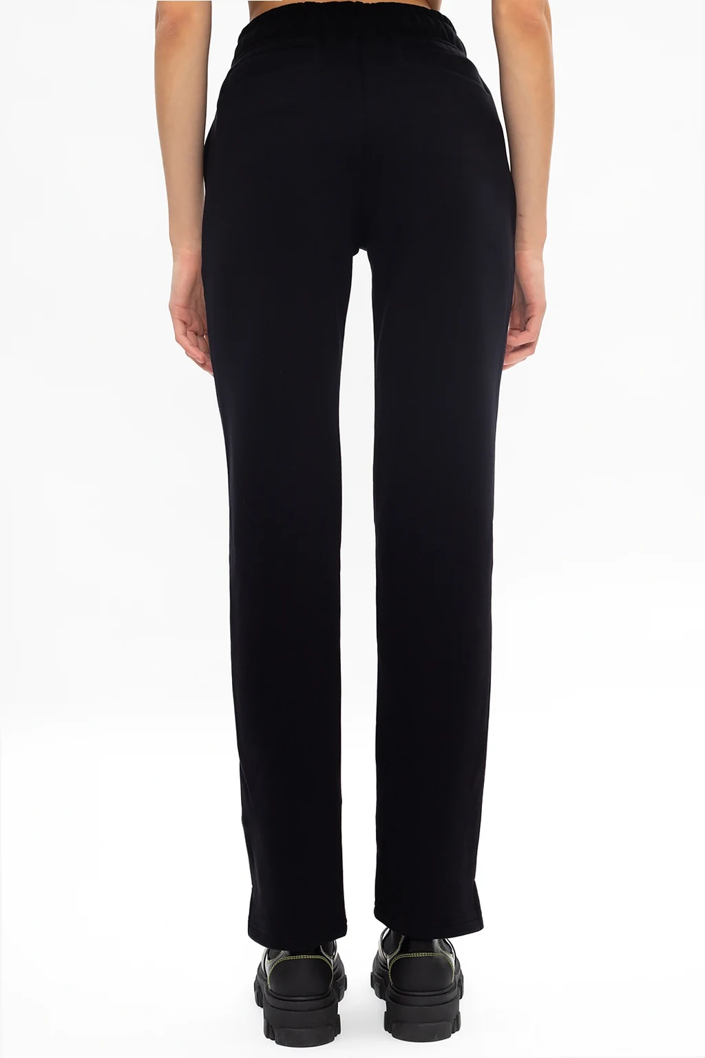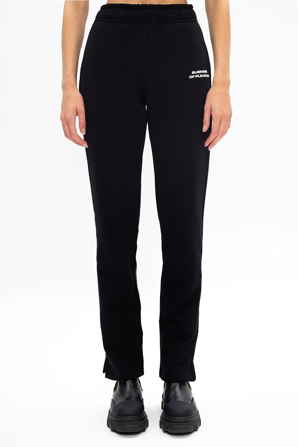Czarne, bawełniane spodnie dresowe, model 'Business of pleasure' MISBHV. W pasie ściągane trokami. Ozdobione nadrukiem w kolorze białym. Z przodu dwie wsuwane kieszenie. Z tyłu dwie kieszenie zapinane na zatrzask. W nogawkach rozcięcia.