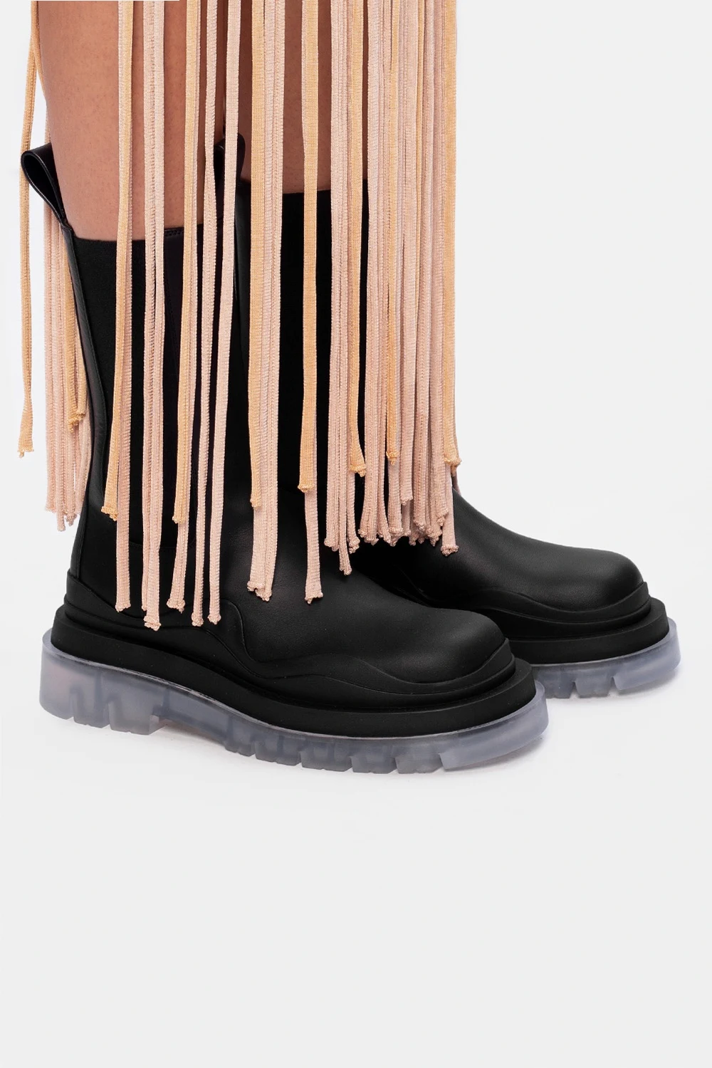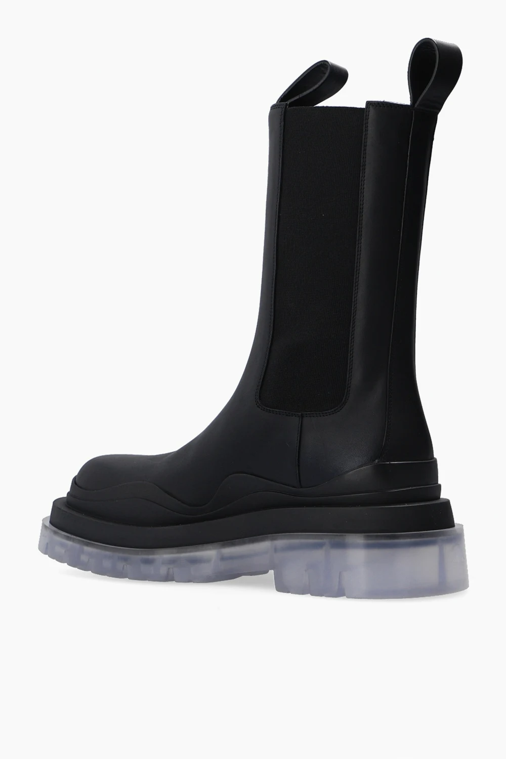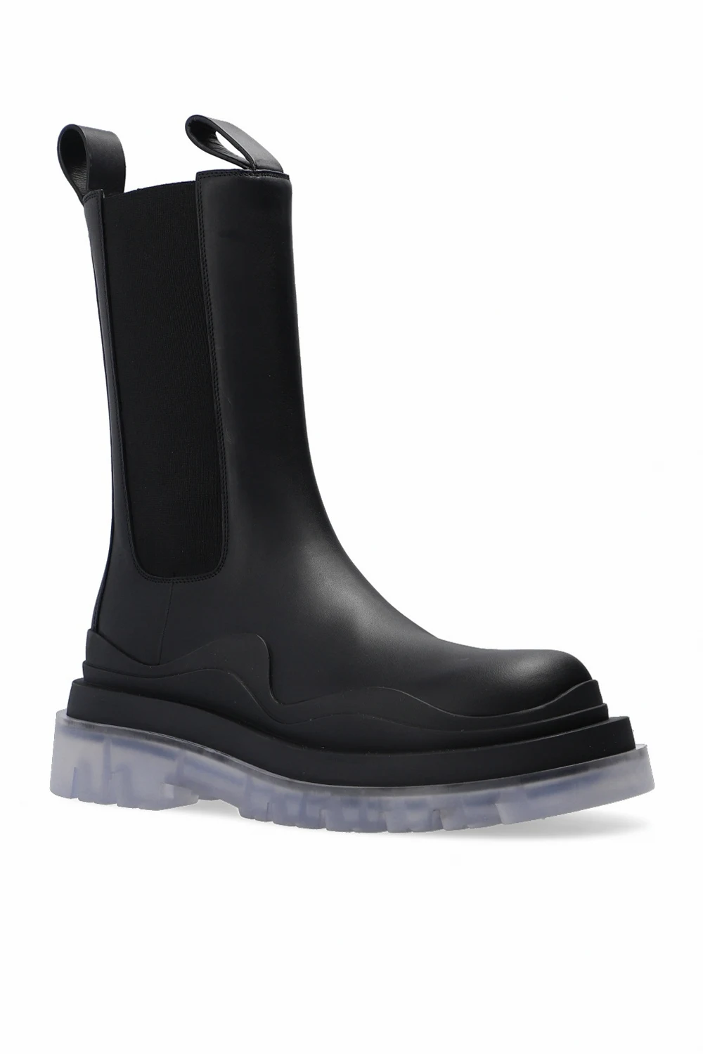 Czarne sztyblety na platformie, model ‘The Tire’ Bottega Veneta. Wykonane ze skóry cielęcej garbowanej roślinnie. Po bokach elastyczne wstawki. Transparentna, gumowa podeszwa.