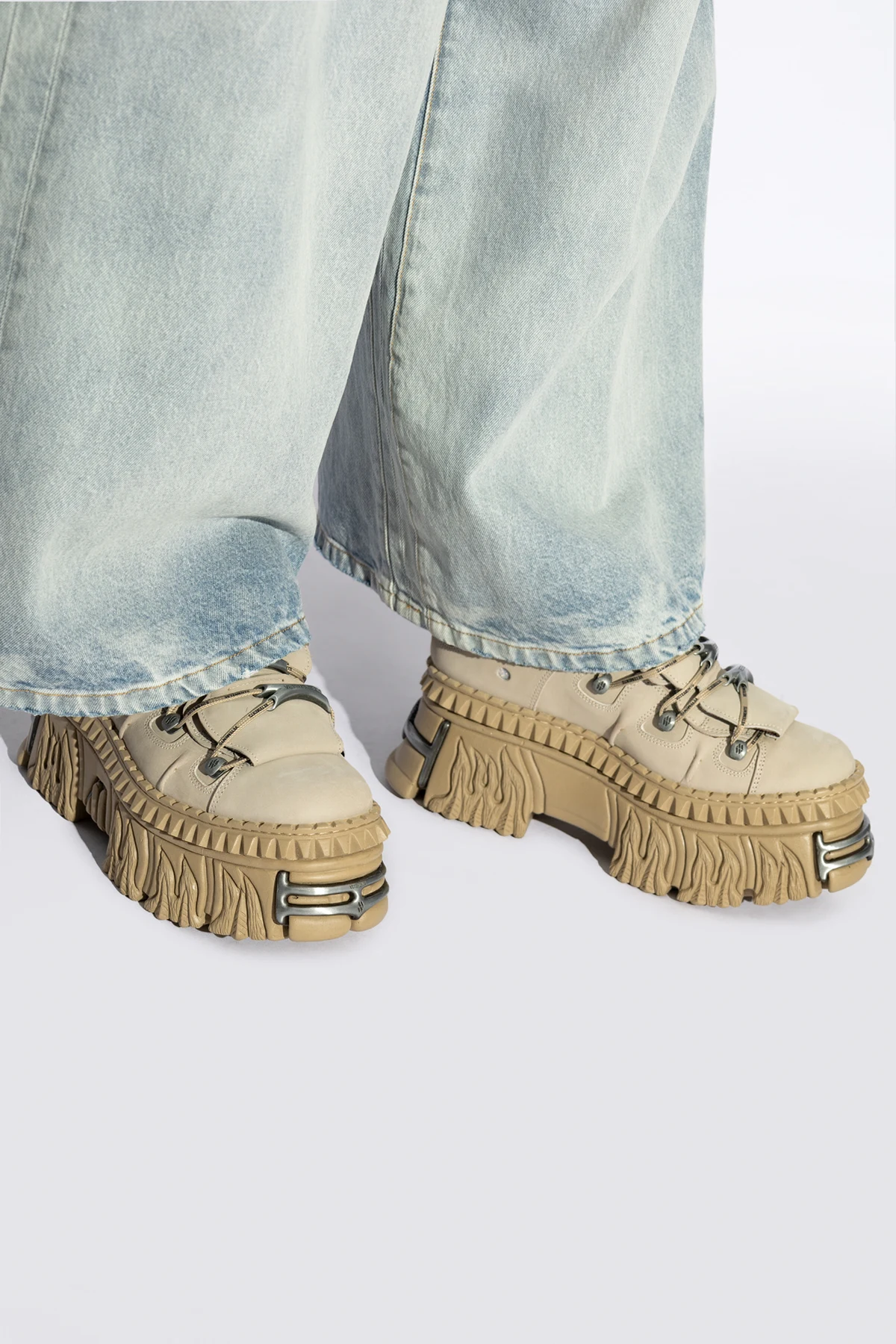 Przedstawiamy Vetements x New Rock – buty, które stanowią esencję awangardowego stylu i luksusu. Ich masywny design w wyrazistym beżowym odcieniu przyciąga spojrzenia, a rzeźbiona, gumowa podeszwa z charakterystycznymi wzorami dodaje niepowtarzalnego uroku. Te unikatowe buty są wynikiem współpracy z renomowaną marką VETEMENTS, znanej z kreatywnego podejścia i inspiracji stylem ulicznym z lat 90.