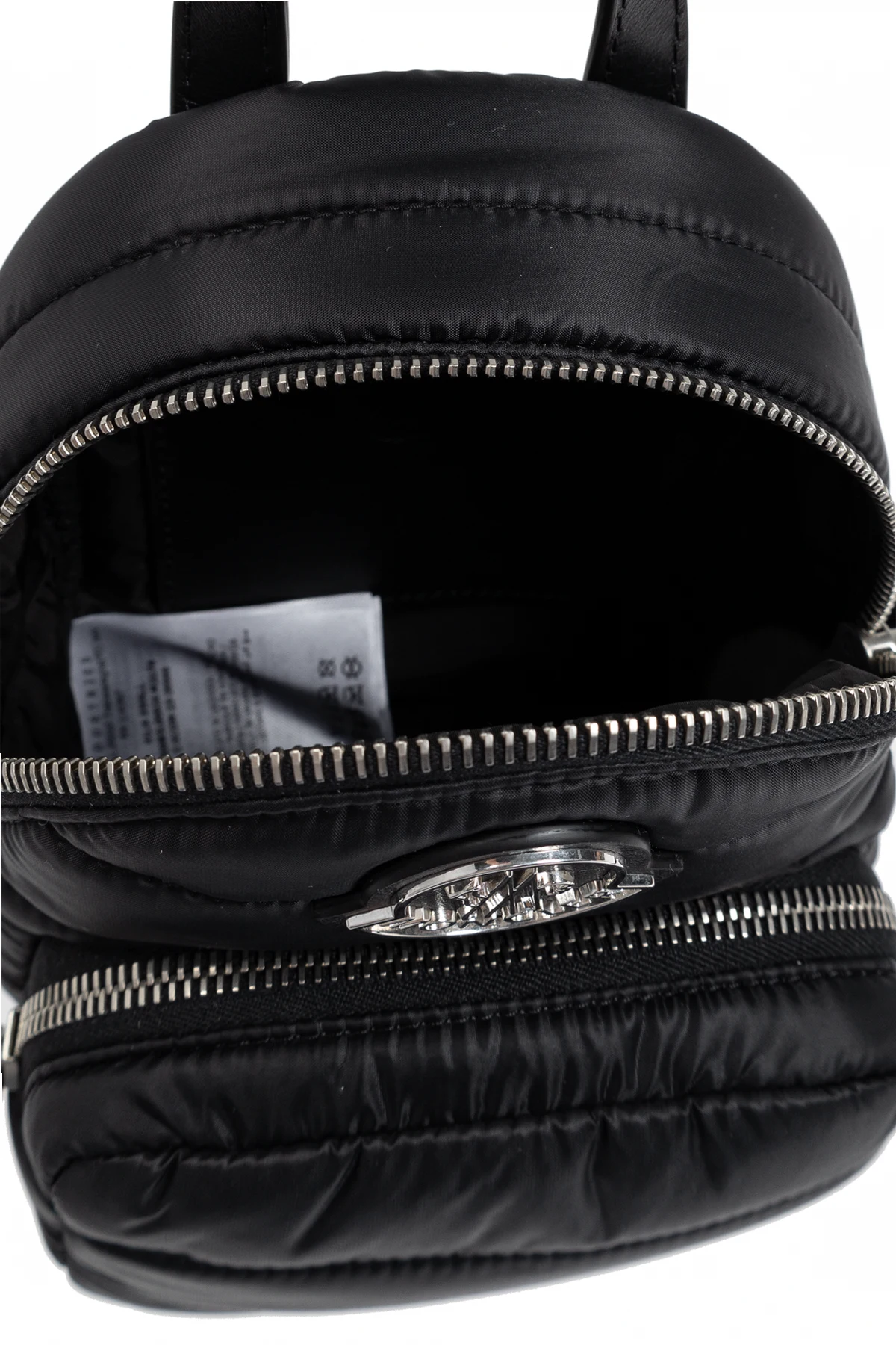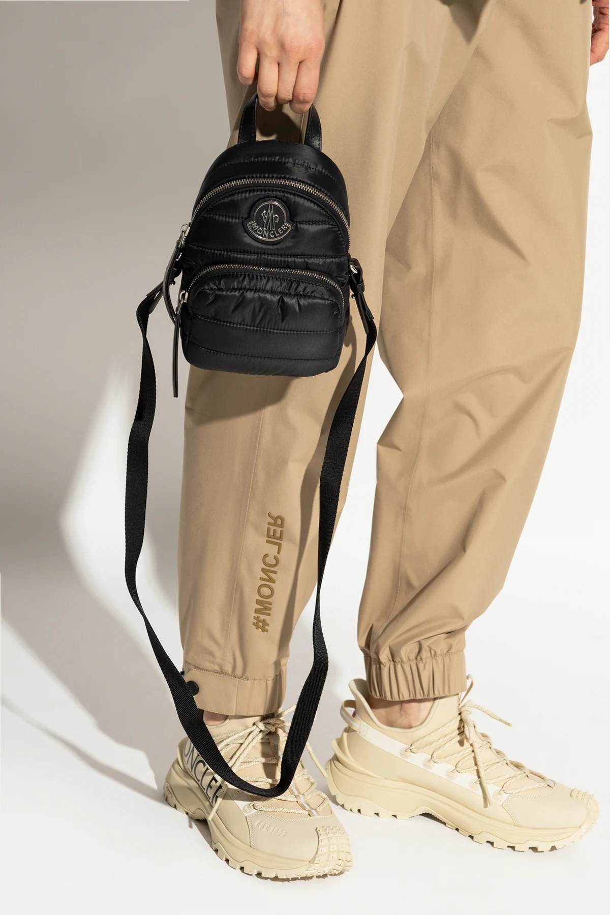 Model ten wyposażony jest w jedno główne zamknięcie na zamek błyskawiczny oraz mniejszą, zewnętrzną kieszeń, co pozwala na łatwe organizowanie przestrzeni. Na przedniej części plecaka widoczne jest logo projektanta w formie okrągłej naszywki z emblematem, co stanowi wyraźny znak rozpoznawczy marki Moncler. Regulowany pasek na ramię oraz uchwyt na górze plecaka zapewniają komfort noszenia na różne sposoby, zgodnie z indywidualnymi preferencjami.