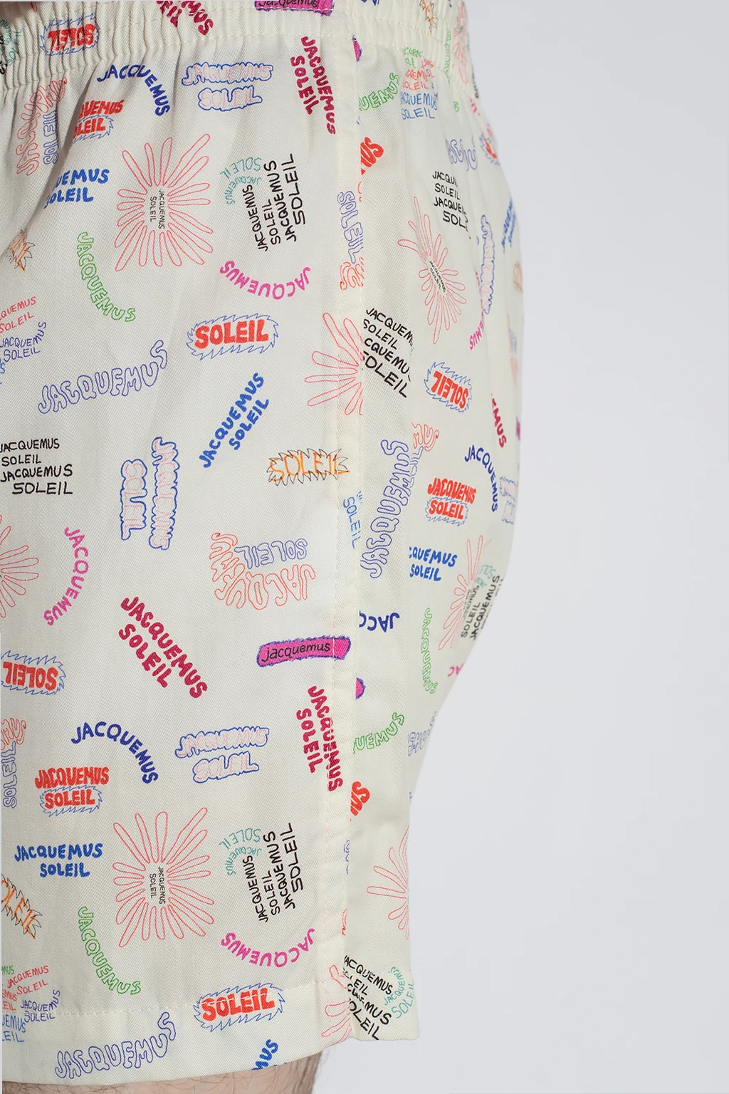 Kremowe, bawełniane bokserki Jacquemus. W pasie wszyta guma. Z przodu zapięcie na guziki. Ozdobione kolorowym wzorem z motywem logo.