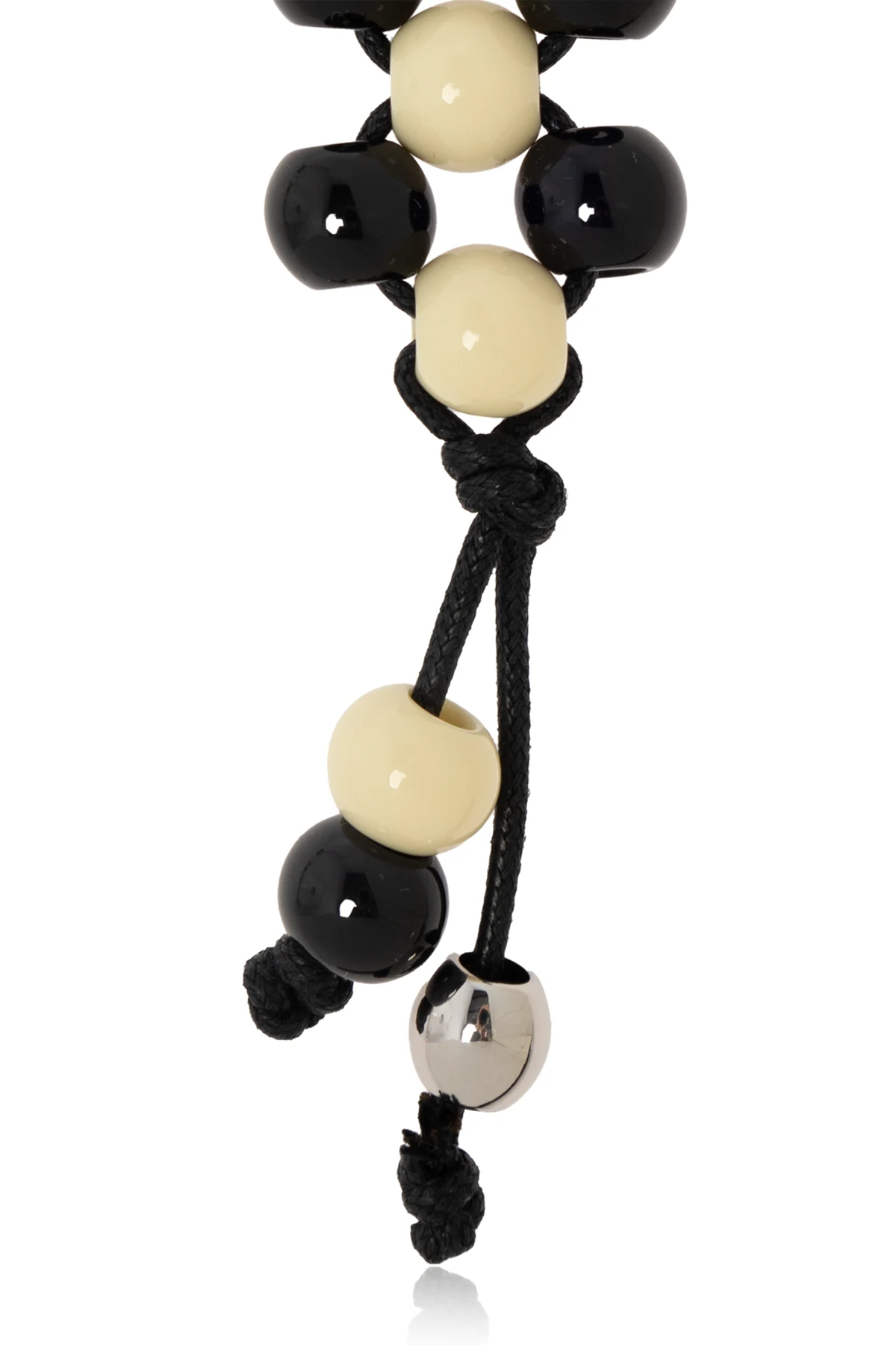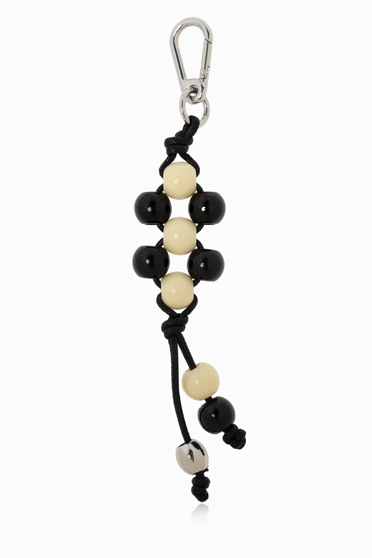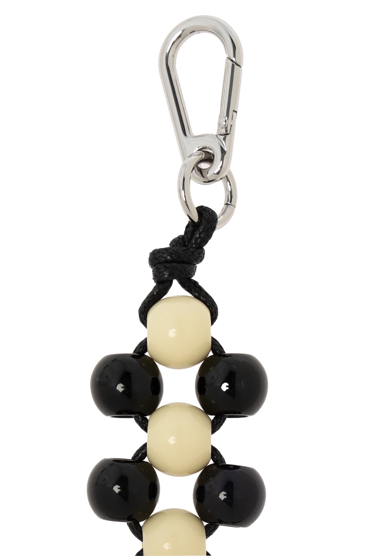 Produkt wyróżnia się konstrukcją składającą się z kilku kulistych elementów, które tworzą pionowy wzór na czarnym sznurku. Naprzemienny układ kolorów czarnego i kremowego nadaje brelokowi intrygujący, kontrastowy efekt wizualny. Kule wykonane z gładkiego, błyszczącego materiału, możliwe że z tworzywa sztucznego lub ceramiki, podkreślają jego nowoczesny charakter.