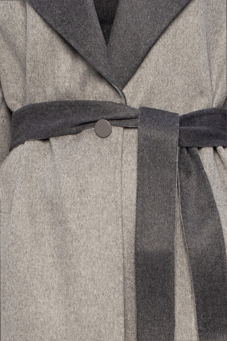 Szary płaszcz Agnona. Wykonany z kaszmiru. Wykończony skórą jagnięcą. Zapinana na guziki. Dwie wsuwane kieszenie.