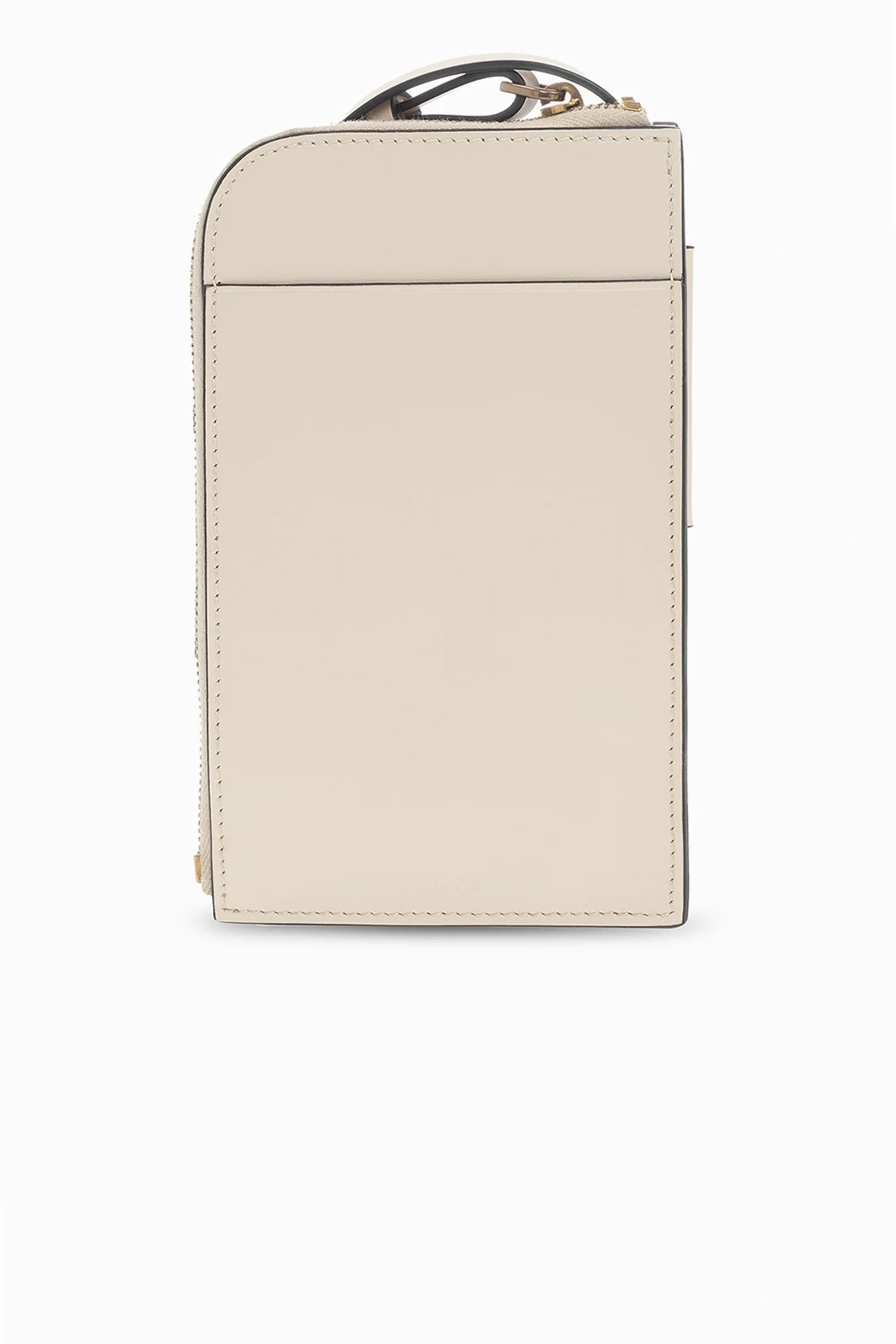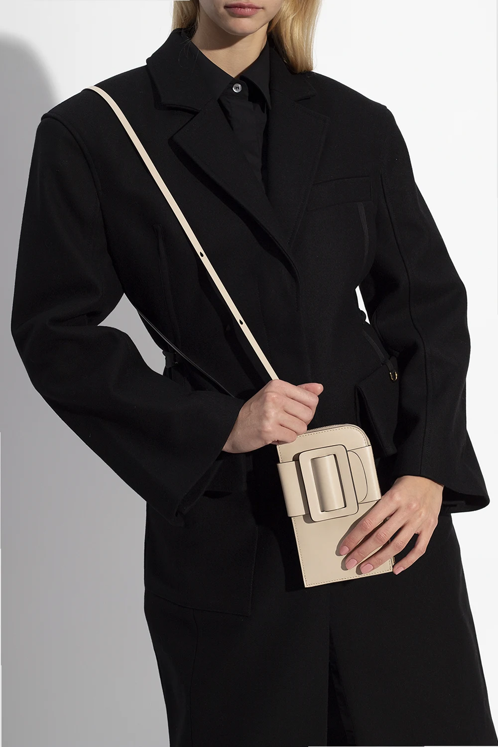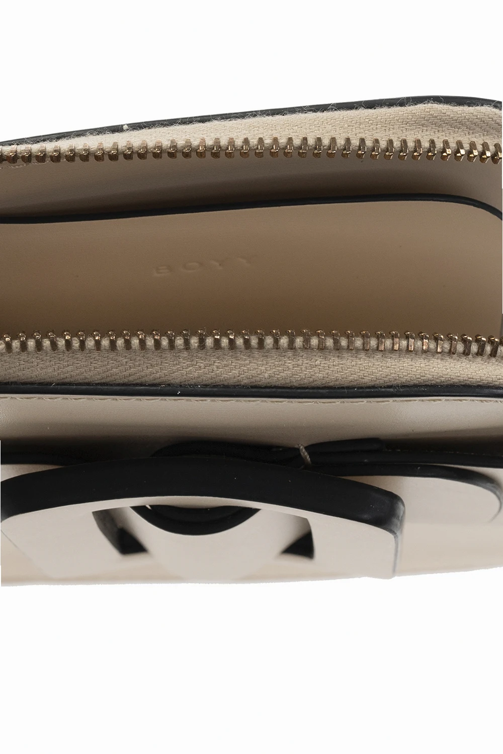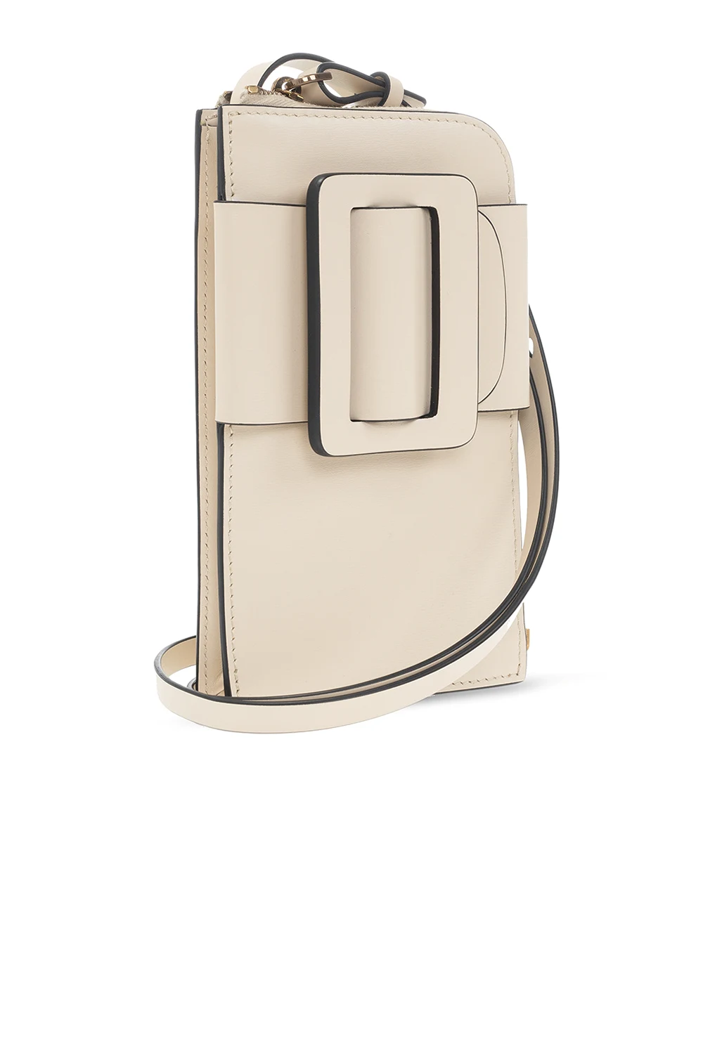 Kremowe etui na telefon, model ‘Buckle Cross Body Phone’ Boyy. Wykonane z cielęcej skóry. Zamykane na zamek. Z przodu dekoracyjna klamra. Z tyłu wsuwana kieszeń. Kremowa, skórzana warstwa wewnętrzna. Wewnątrz miejsce na telefon oraz trzy przegrody na karty. Metalowe wykończenie w kolorze postarzanego złota.