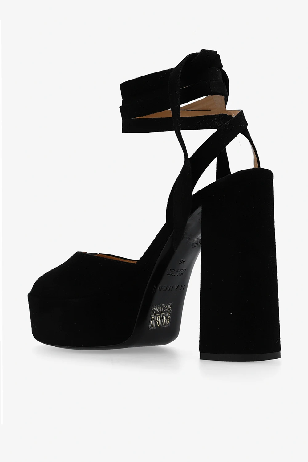 Czarne sandały na obcasie, model ‘Bellini’ Manebi. Wykonane ze skóry. Wiązane wokół kostki. Czarna, skórzana podeszwa.