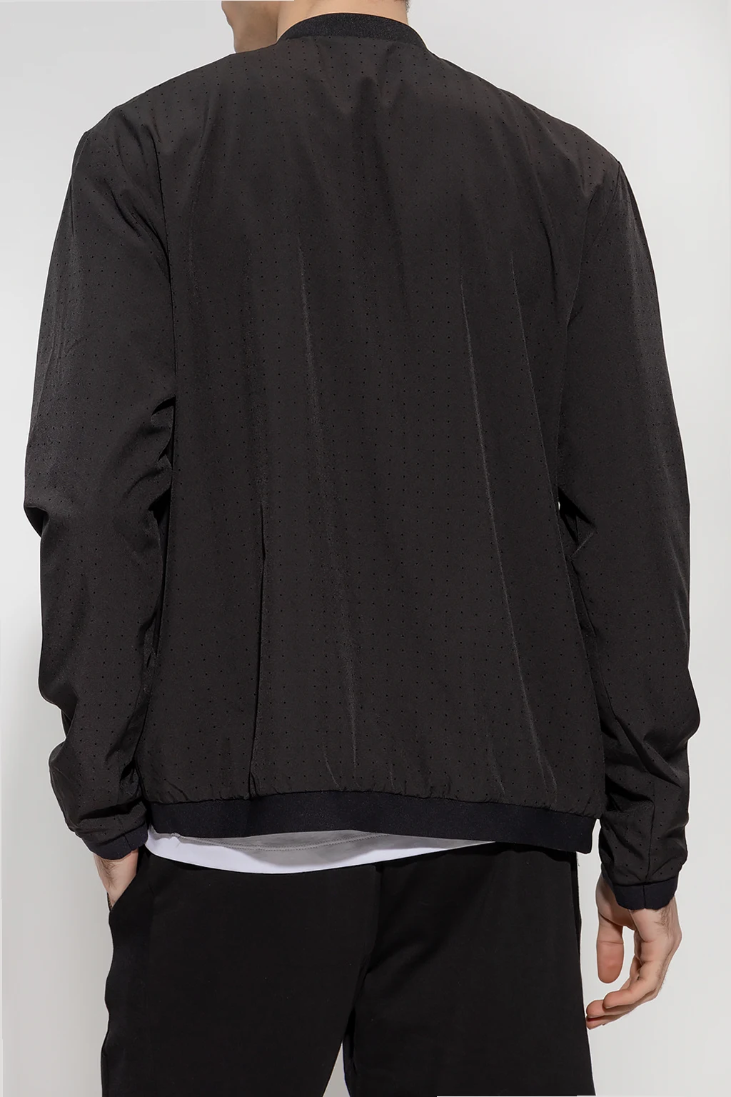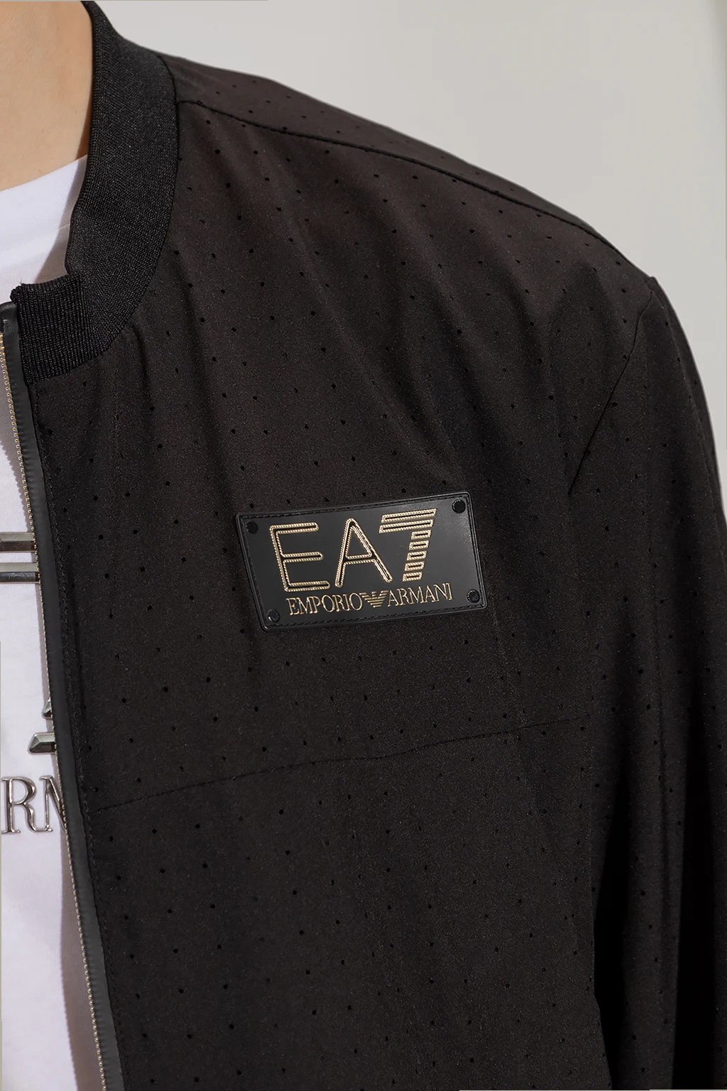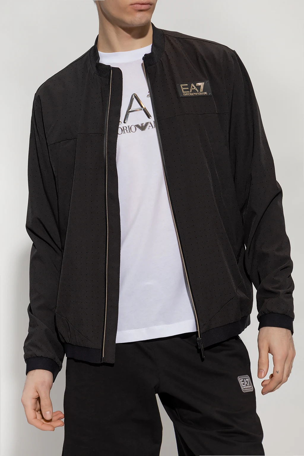 Czarna kurtka ze stójką EA7 Emporio Armani. Wykonana z materiału z perforacją. Zapinana na zamek. Ozdobiona naszywką z logo. Z przodu dwie kieszenie zapinane na zamek. Długie rękawy i dół kurtki zakończone ściągaczem.