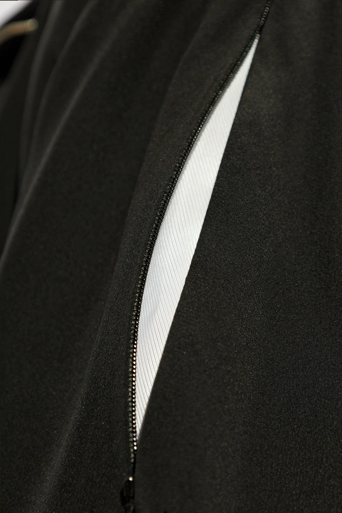 Elegancki kontrast srebrnego zamka błyskawicznego z głęboką czernią materiału.