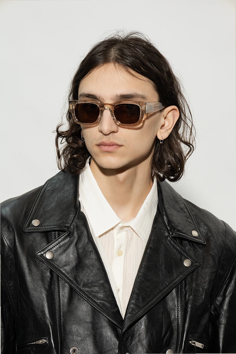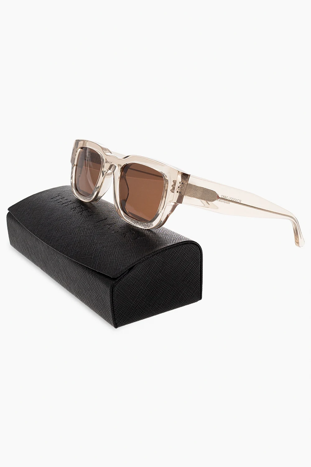 Kremowe, transparentne okulary przeciwsłoneczne, model ‘Foxxxy’ Thierry Lasry. Prostokątne oprawki. Brązowe soczewki ze 100% ochroną przed promieniowaniem UV. Ręcznie wykonane we Włoszech. Dołączone etui.