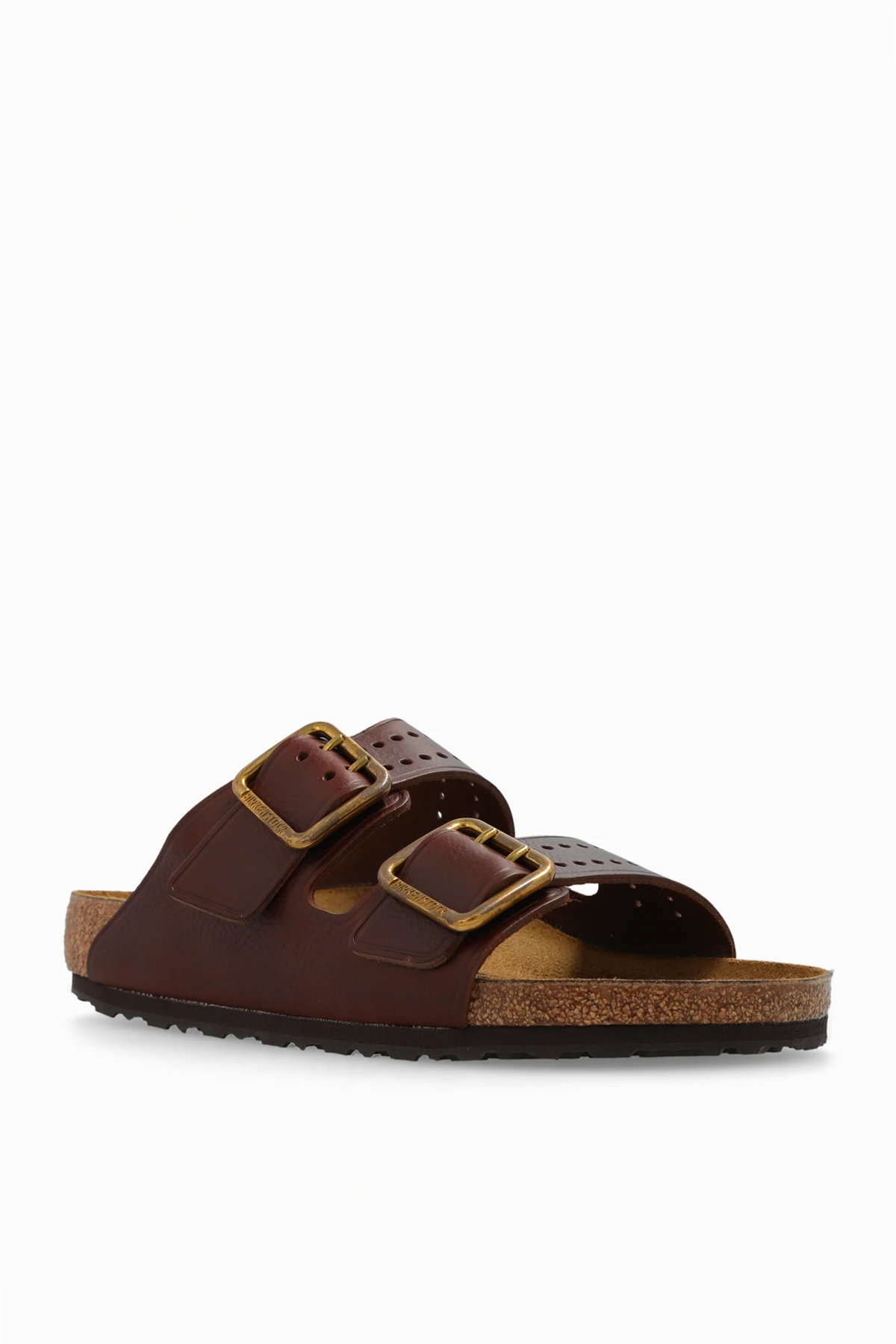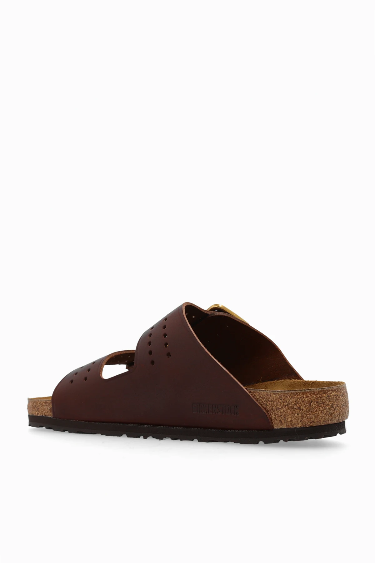 Klapki w kolorze brązowym, model ‘Arizona Bold Gap’ Birkenstock. Wykonane ze skóry z perforowanym wzorem. Paski z klamrą ozdobioną grawerem. Z boku wytłoczone logo. Anatomicznie ukształtowana wkładka korkowo-lateksowa o standardowej szerokości. Podeszwa w kolorze brązowym wykonana z naturalnego korka oraz pianki EVA.