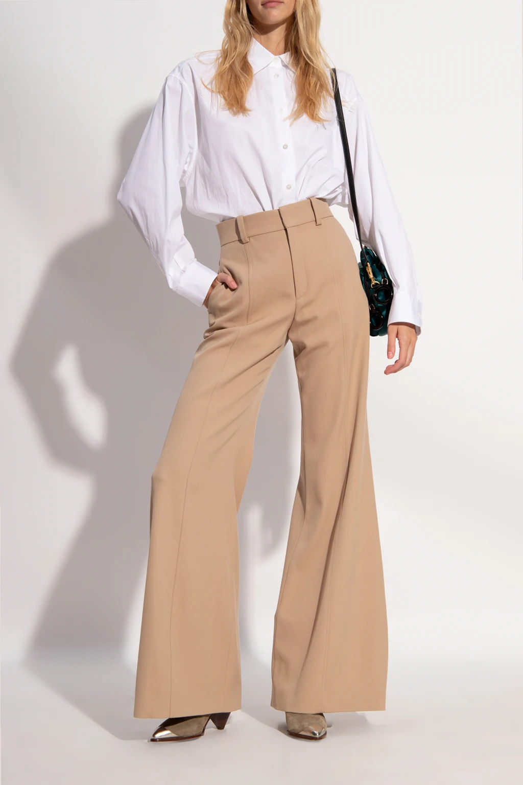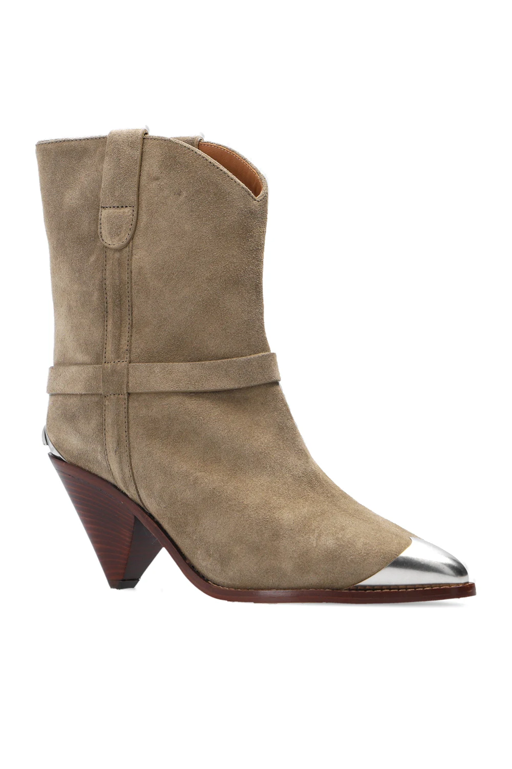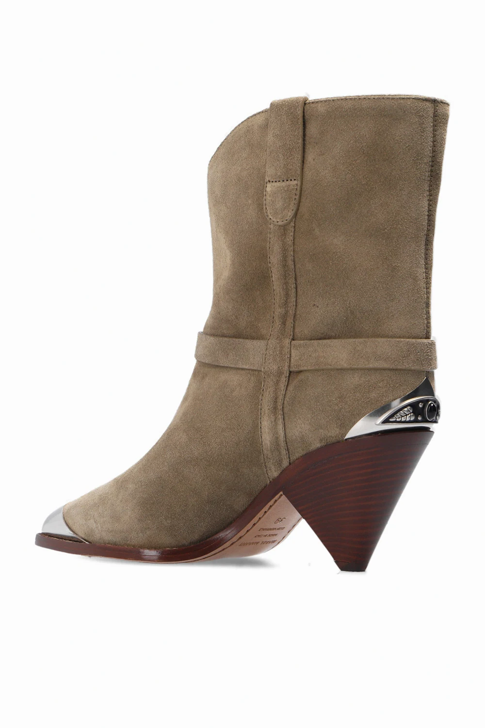 Zielono-beżowe kowbojki na obcasie, model ‘Limza’ Isabel Marant. Wykonane z zamszu. Nosek w szpic wykończony metalowym elementem w kolorze srebrnym. Z tyłu metalowa aplikacja. Beżowo-brązowa, skórzana podeszwa.