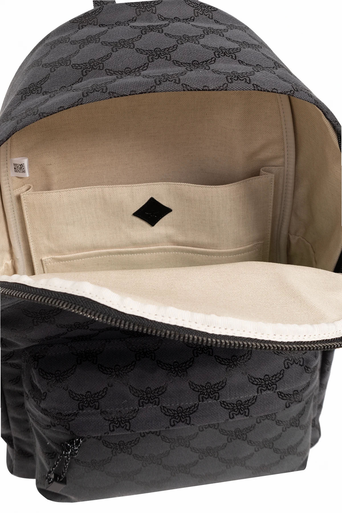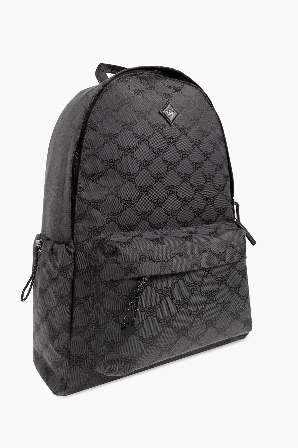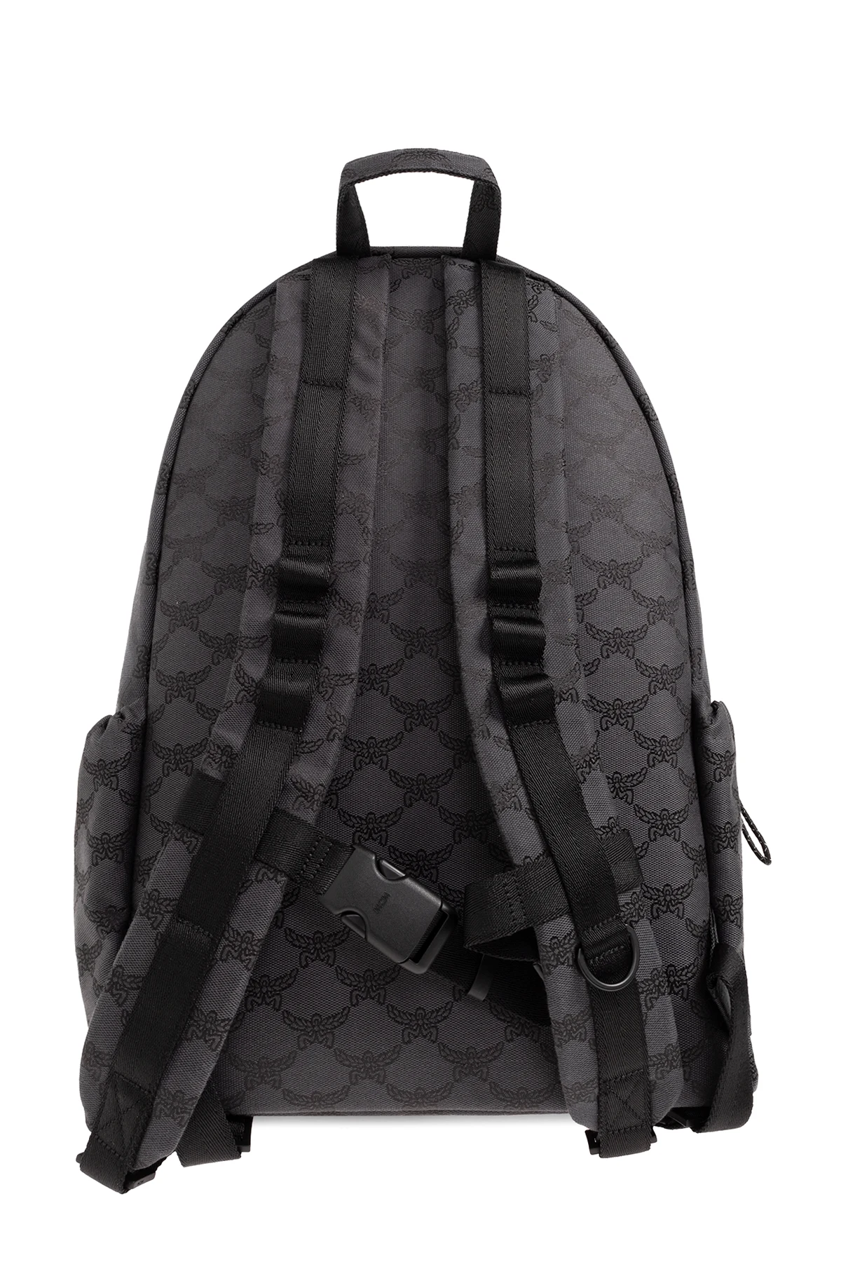 Ciemnoszaro-czarny plecak, model ‘Himmel Medium’ MCM. Wykonany z materiału ozdobionego żakardowym wzorem z monogramem ‘Lauretos’. Wykończony skórą. Zamykany na dwubiegunowy zamek. Z przodu naszywka z logo i kieszeń z zamknięciem na zamek. Po bokach dwie kieszenie ściągane trokami. Na górze półokrągła rączka, z tyłu regulowane szelki. Wewnątrz komora.