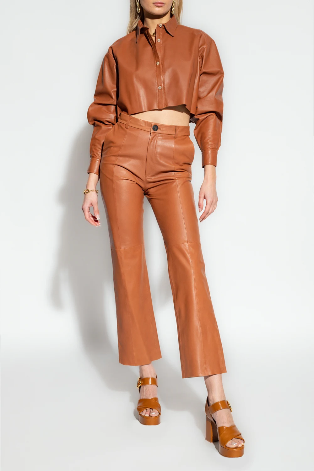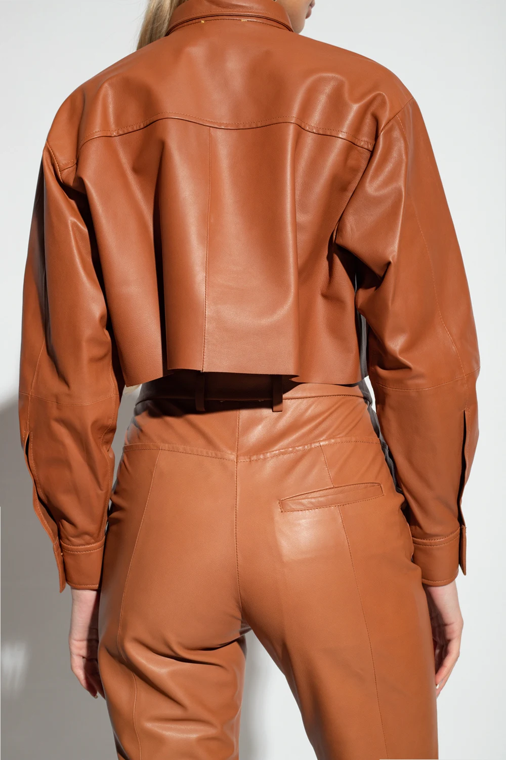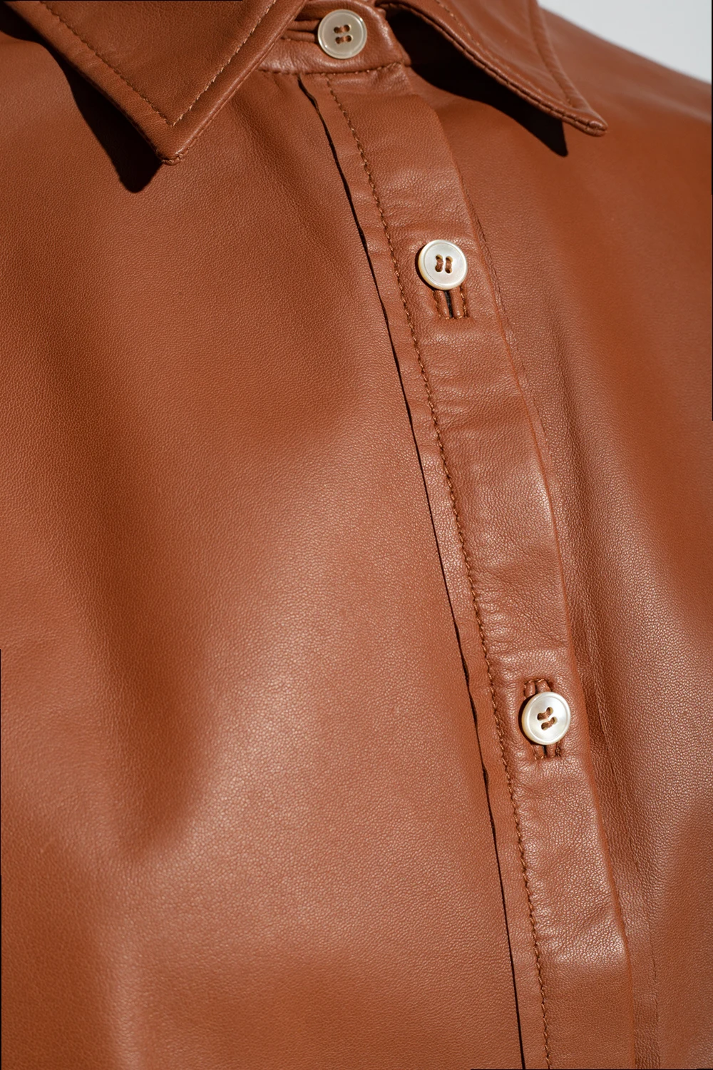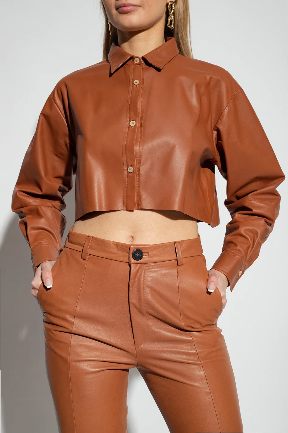 Brązowa, krótka koszula Forte Forte. Wykonana ze skóry. Przód oraz mankiety przy długich rękawach zapinane na guziki. Surowo wykończony dół.